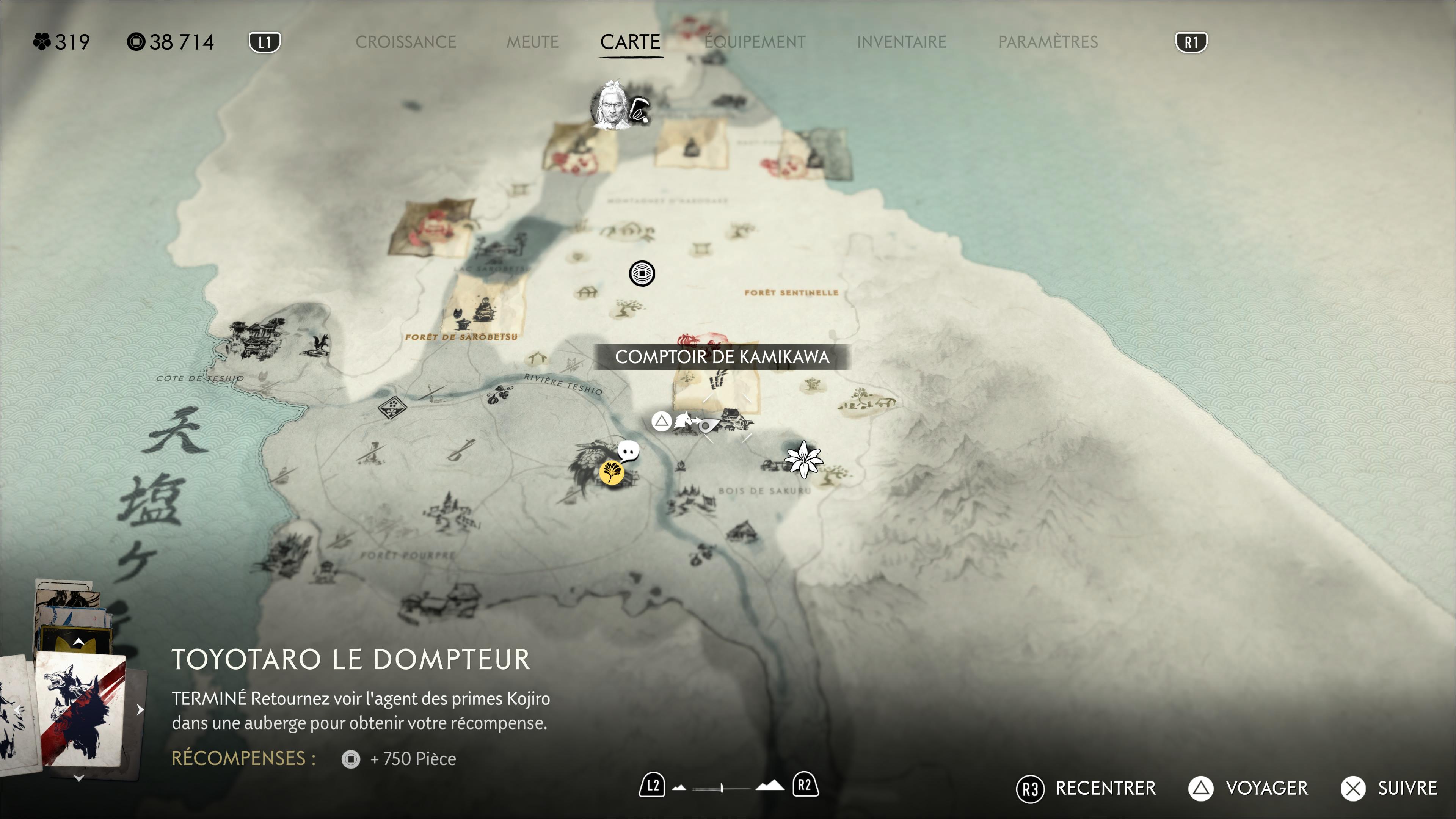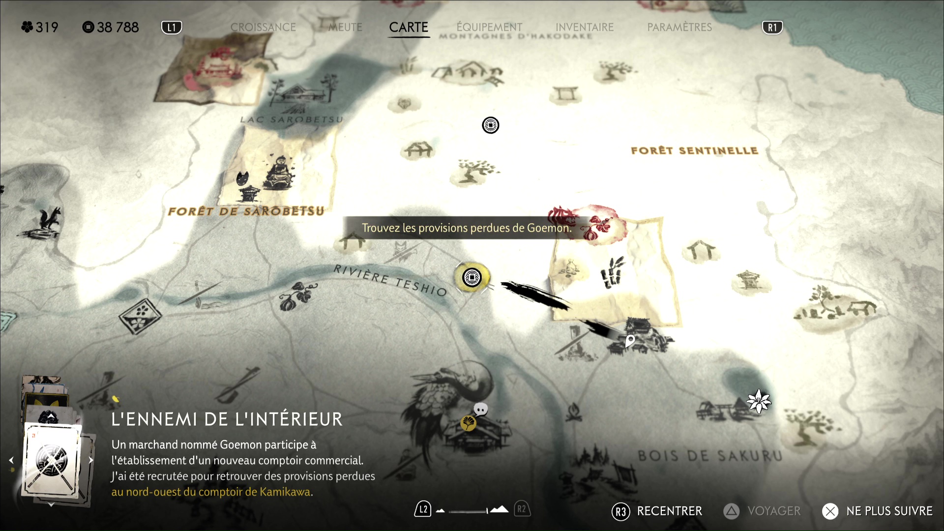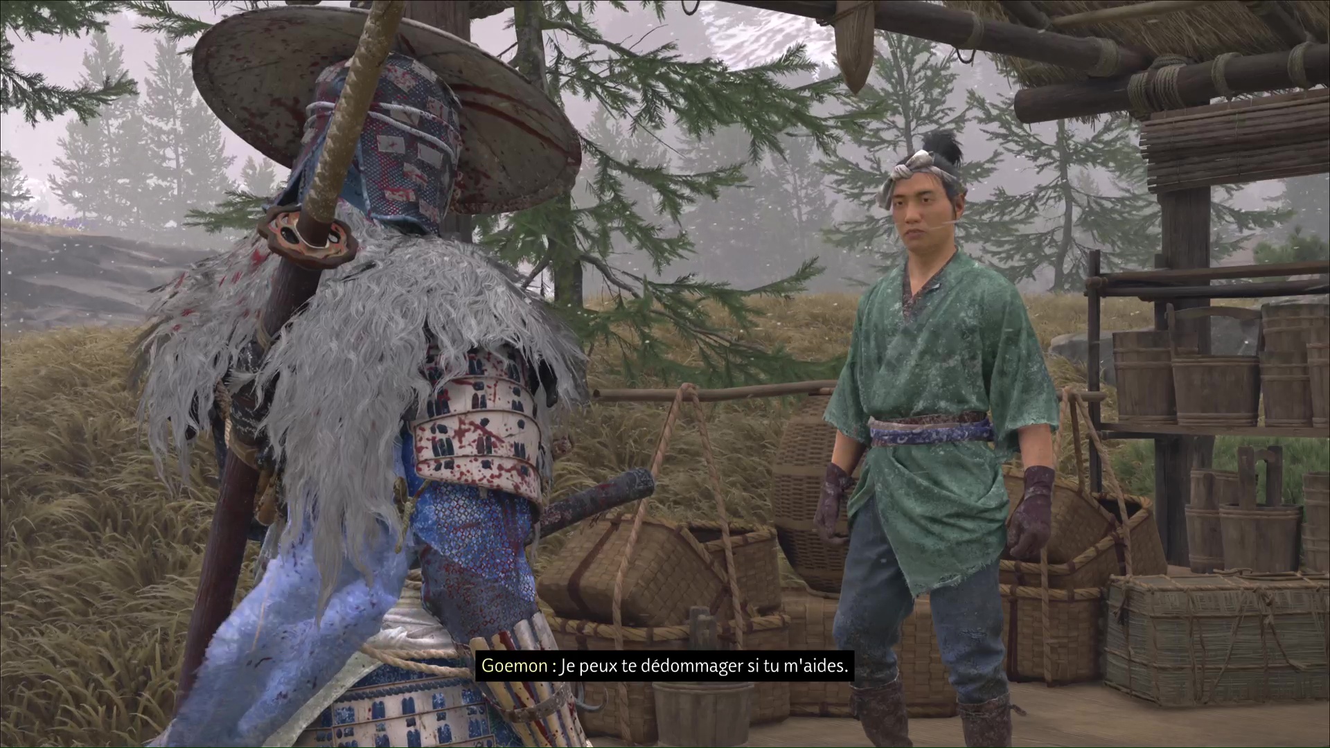 Au nord-est de l’Auberge de la Grue rouge et au nord du Bois de Sakuru de la Crête de Teshio se trouve le Comptoir de Kamikawa. Là-bas, cherchez-y un marchand habillé en vert. Il s’appelle Goemon et il propose des choses à vendre.