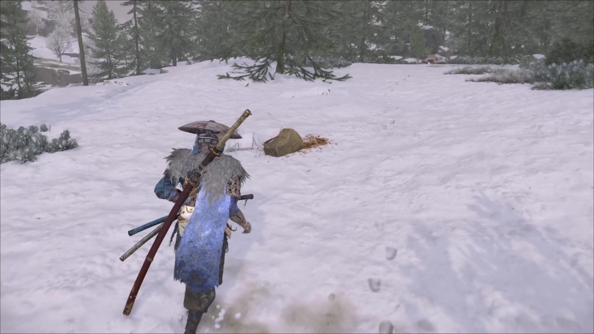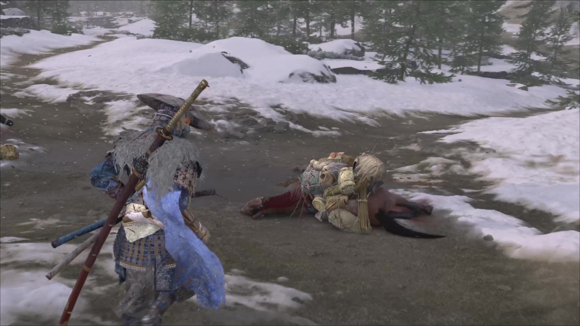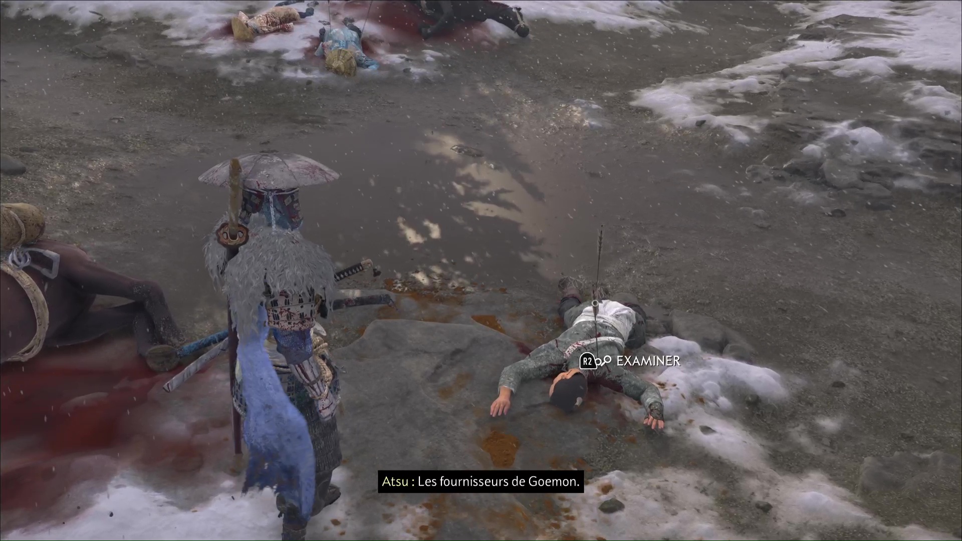 Partez ensuite vers l’ouest en suivant la route principale jusqu’au repère. Vous voici à un carrefour où reposent les cadavres d’un cheval et d’un homme. Examinez l’homme et Atsu remarquera que la cargaison et des traces de pas s’étendent plus loin dans la neige.
