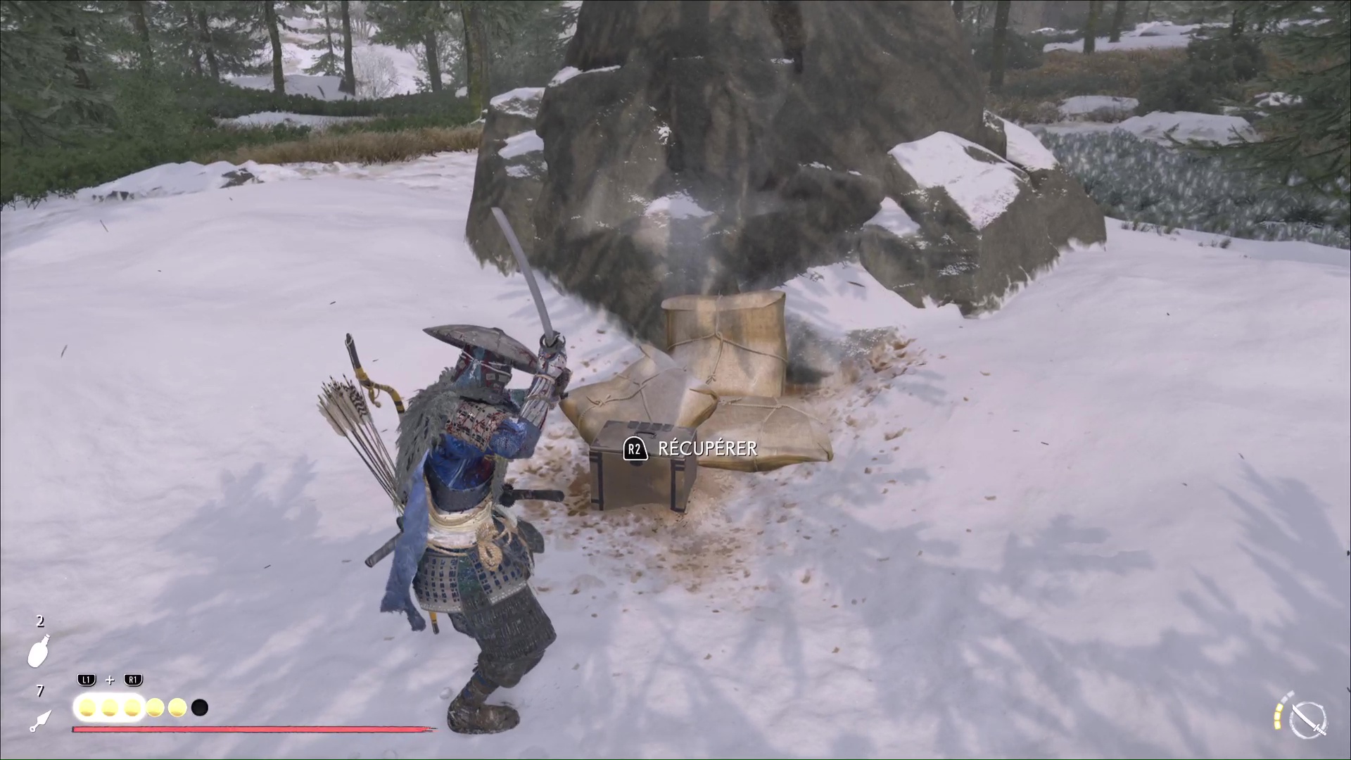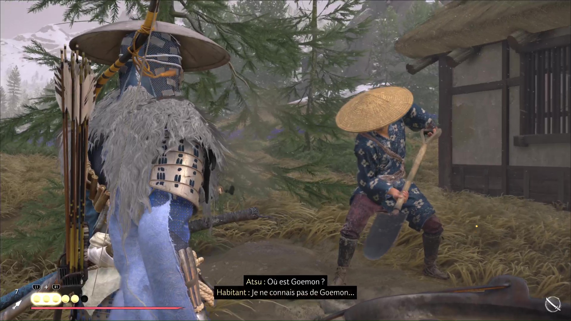 Remontez la piste et, rapidement, vous serez pris d’assaut par trois archers perchés dans les arbres. Levez la tête et tuez-les à l’arc. Ouvrez ensuite le coffre et ramassez les épices à l’intérieur puis retournez voir Goemon.