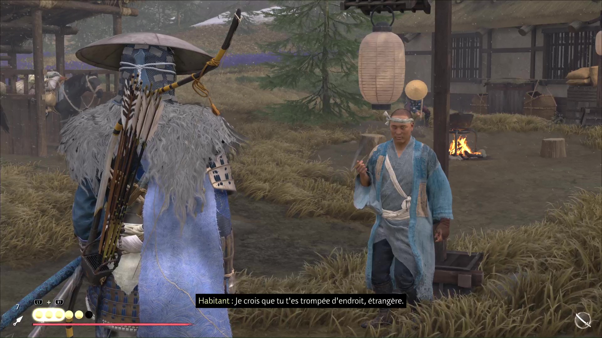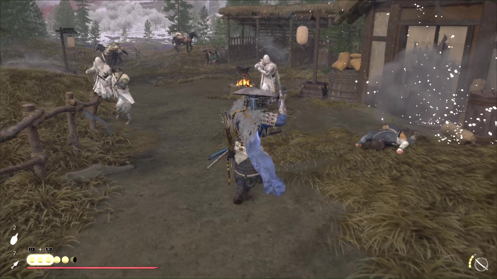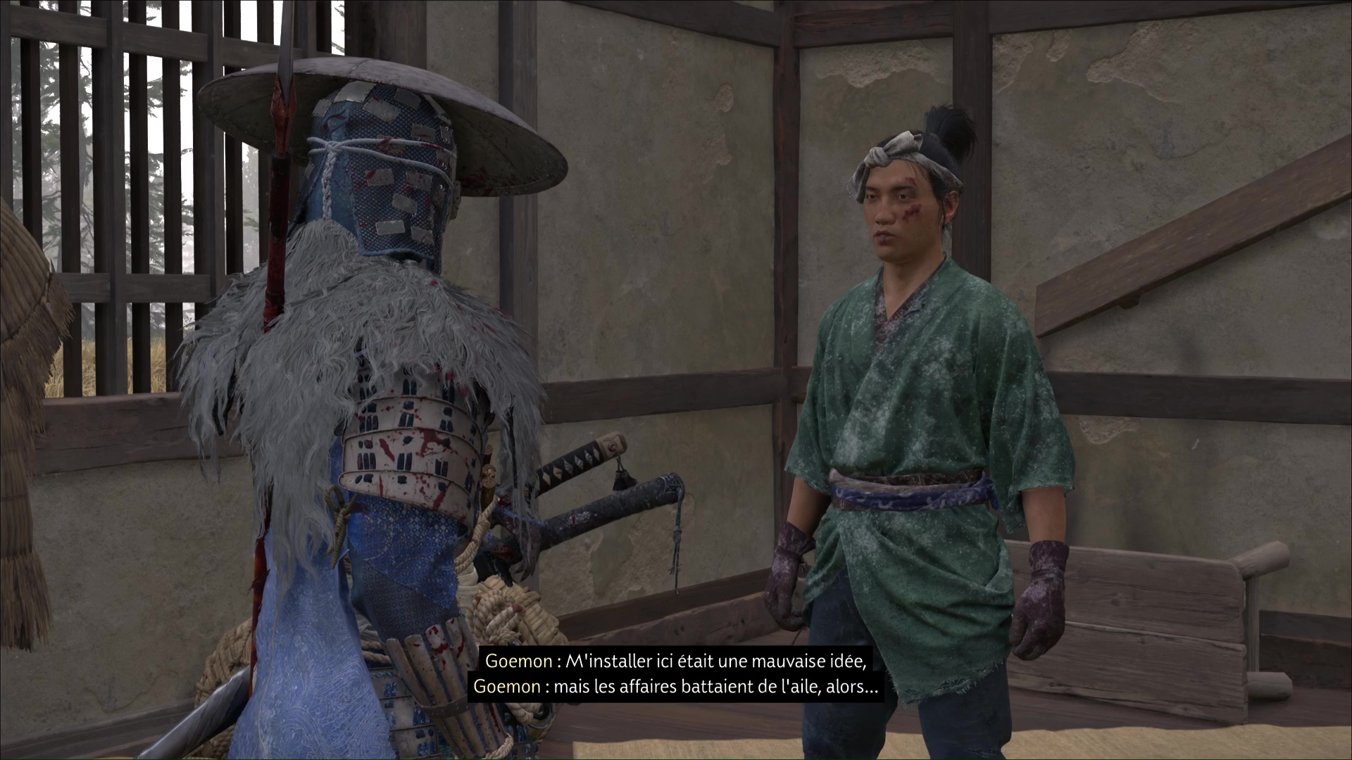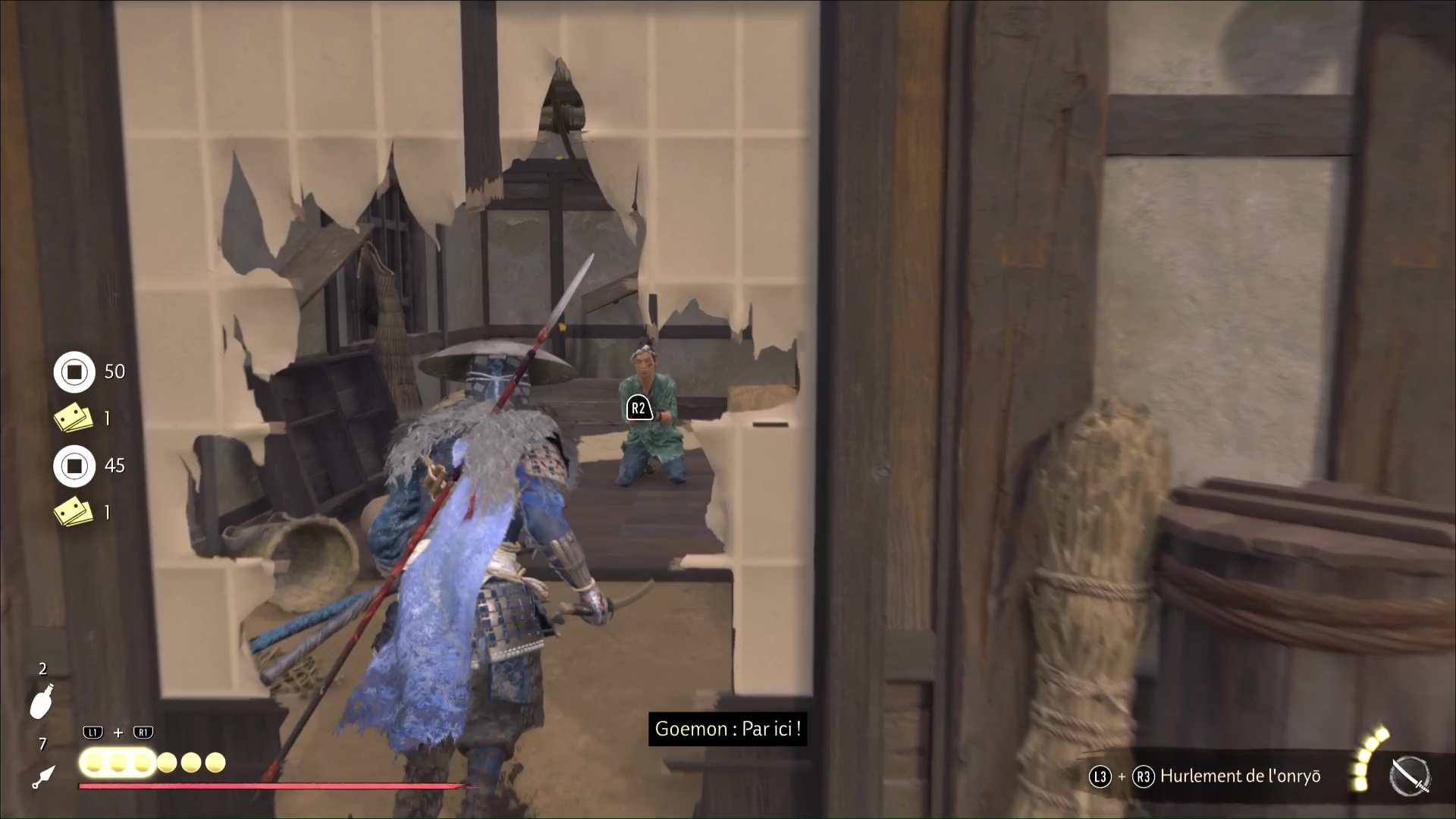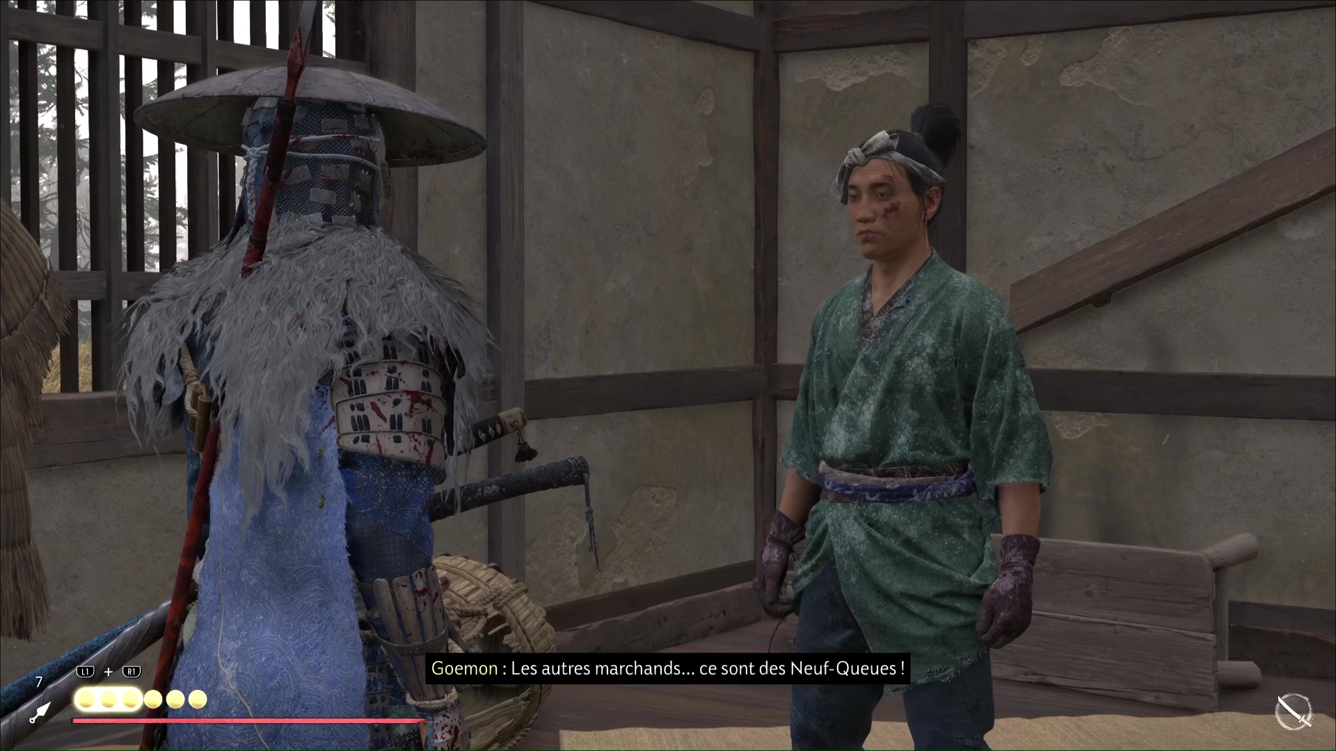 Une bombe va alors exploser et lancer une attaque par ces faux marchands. Tuez-les en maniant autant que possible l’arme qui vous donne l’avantage, puis allez voir Goemon dans la cabane.