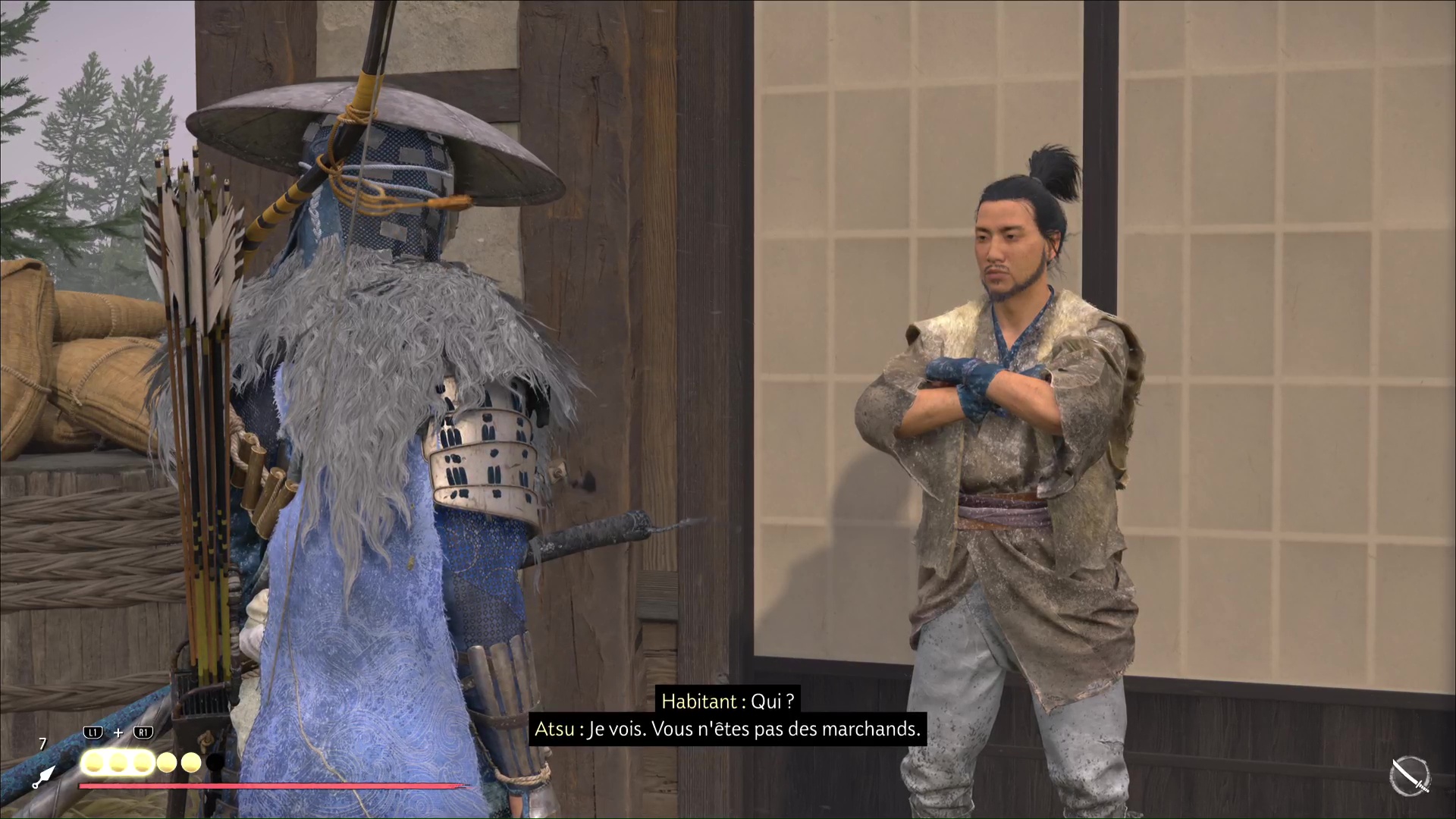 De retour au Comptoir de Kamikawa, Goemon n’est plus là. Essayez d’interroger les autres marchands un par un. Tous nieront connaître Goemon. Et en interrogeant un homme bras croisés devant une porte, Atsu comprend que quelque chose se trame ici.