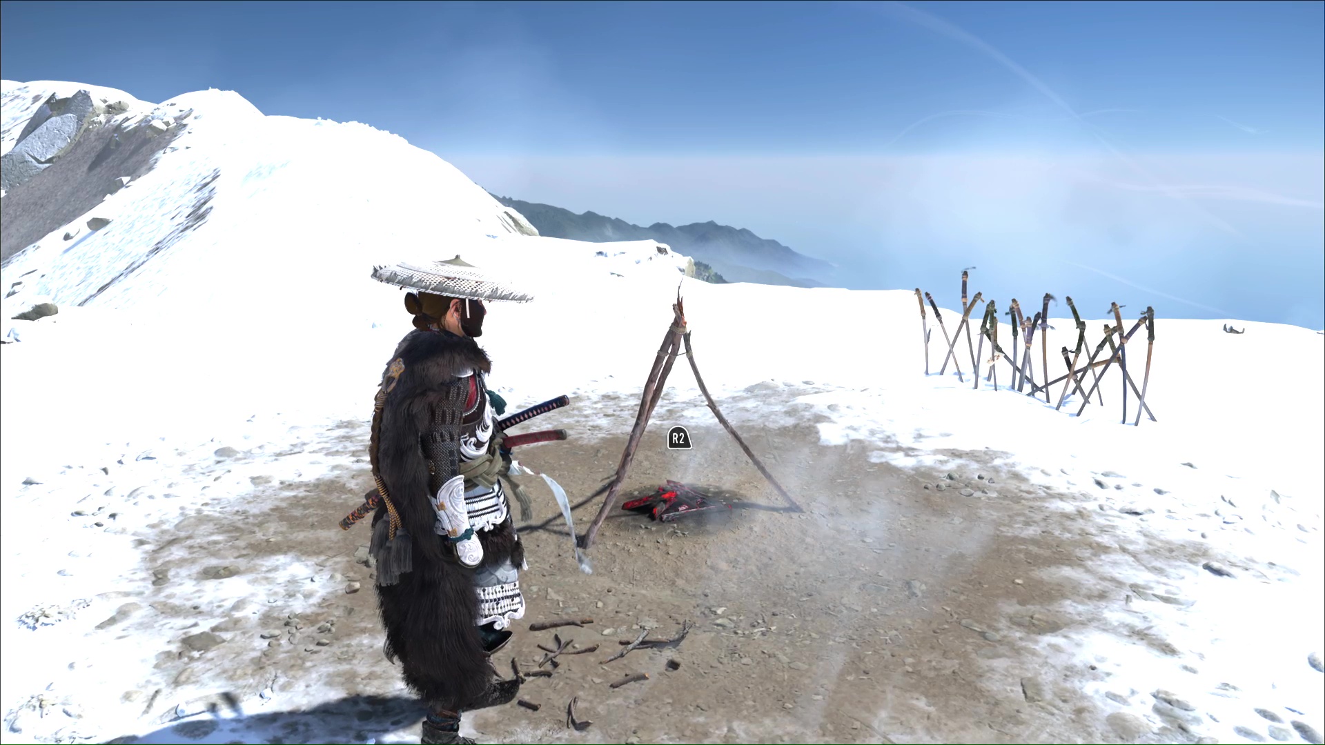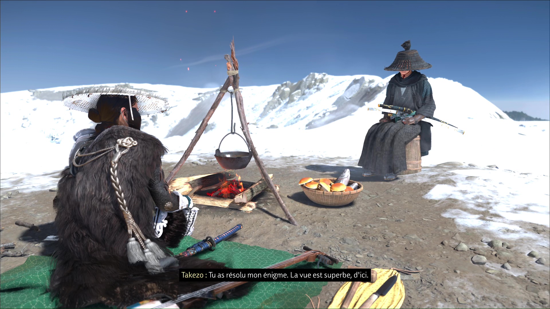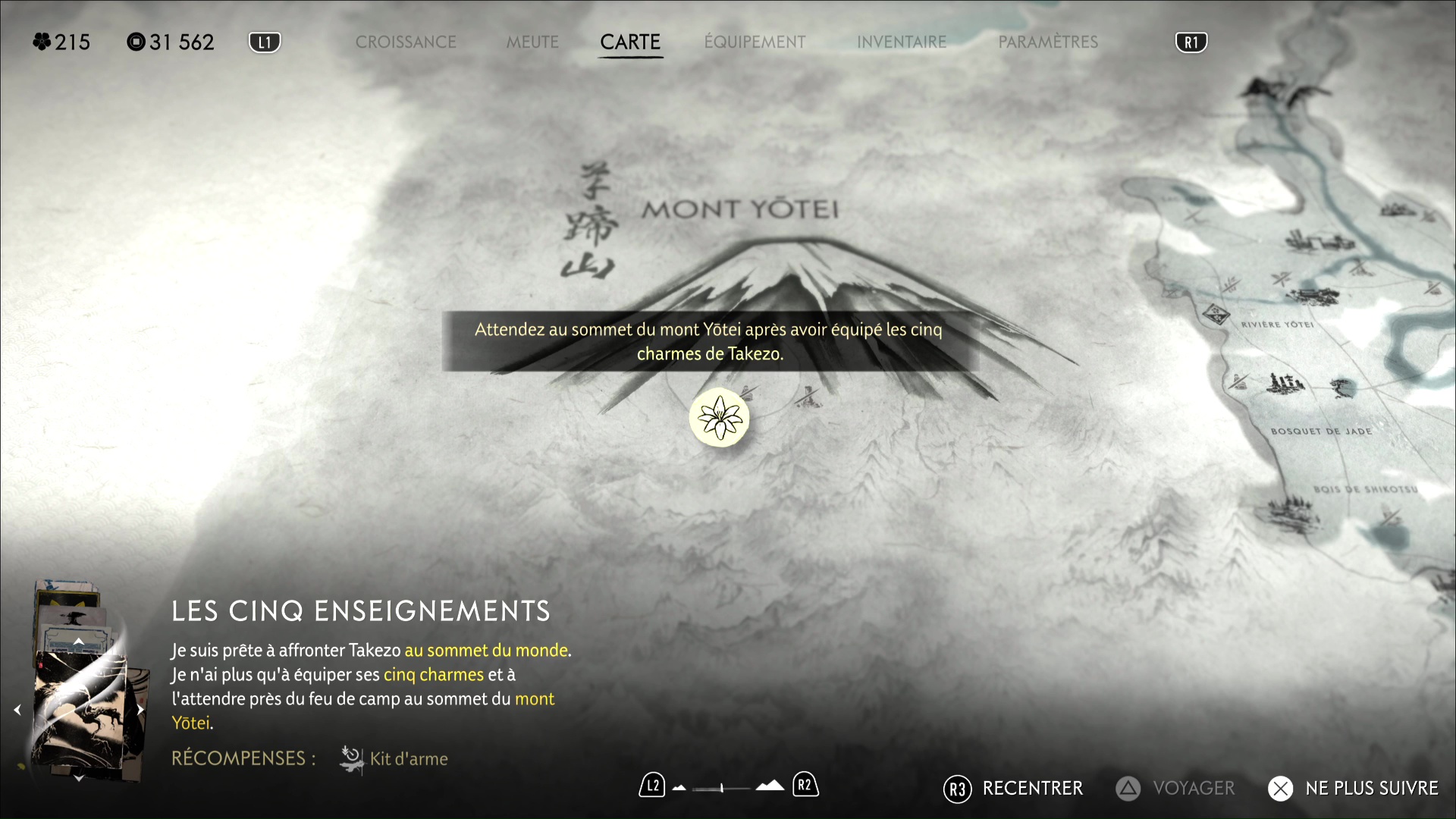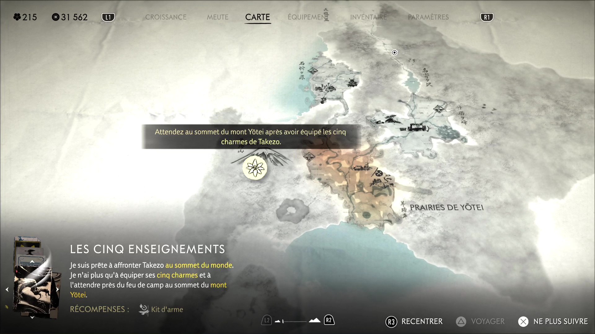 Une fois arrivé au sommet du Mont Yōtei, faites tout le tour jusqu’à arriver à un feu de camp. Ensuite, équipez-vous des cinq charmes obtenus sur les cadavres des disciples de Takezo :