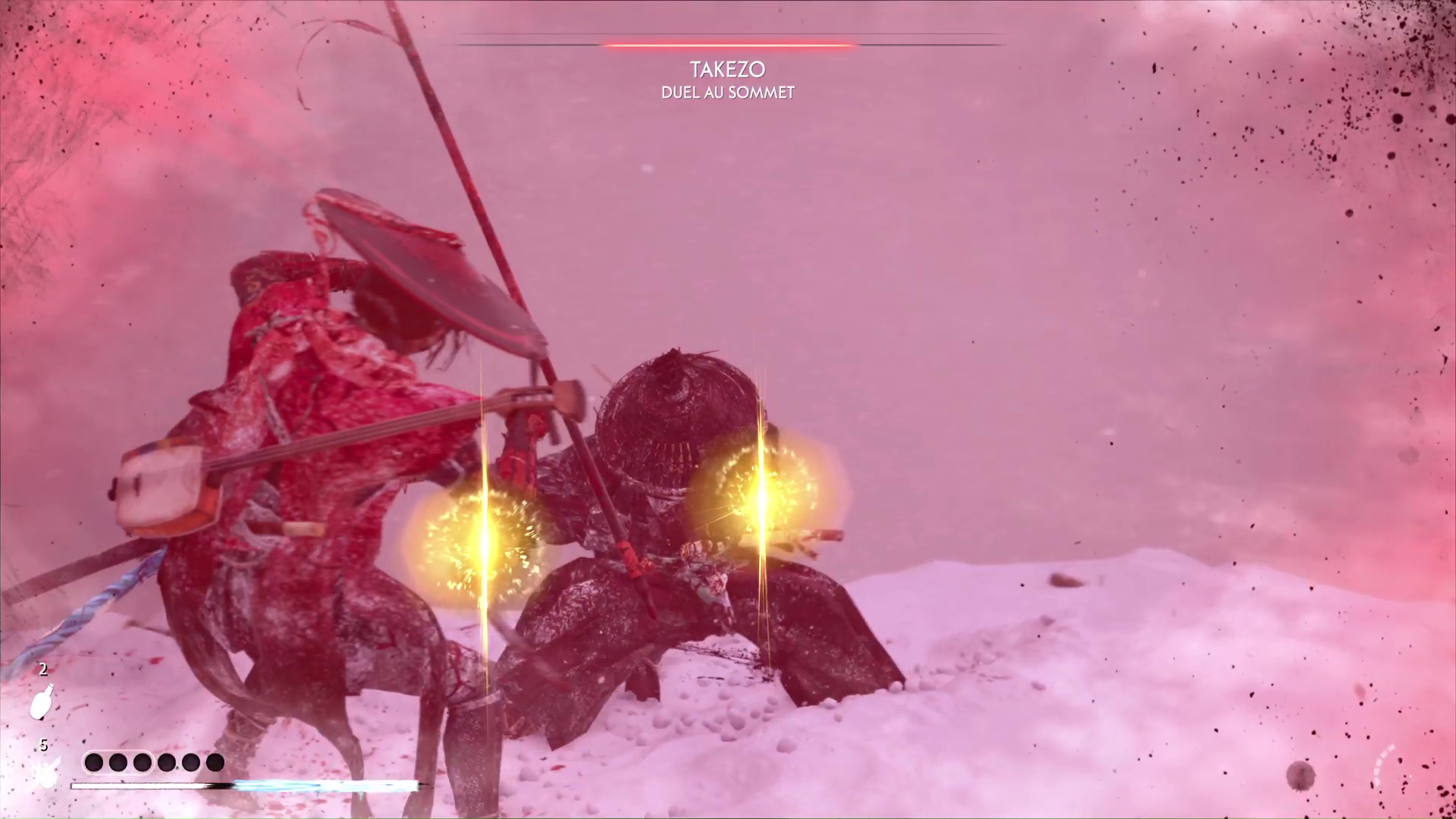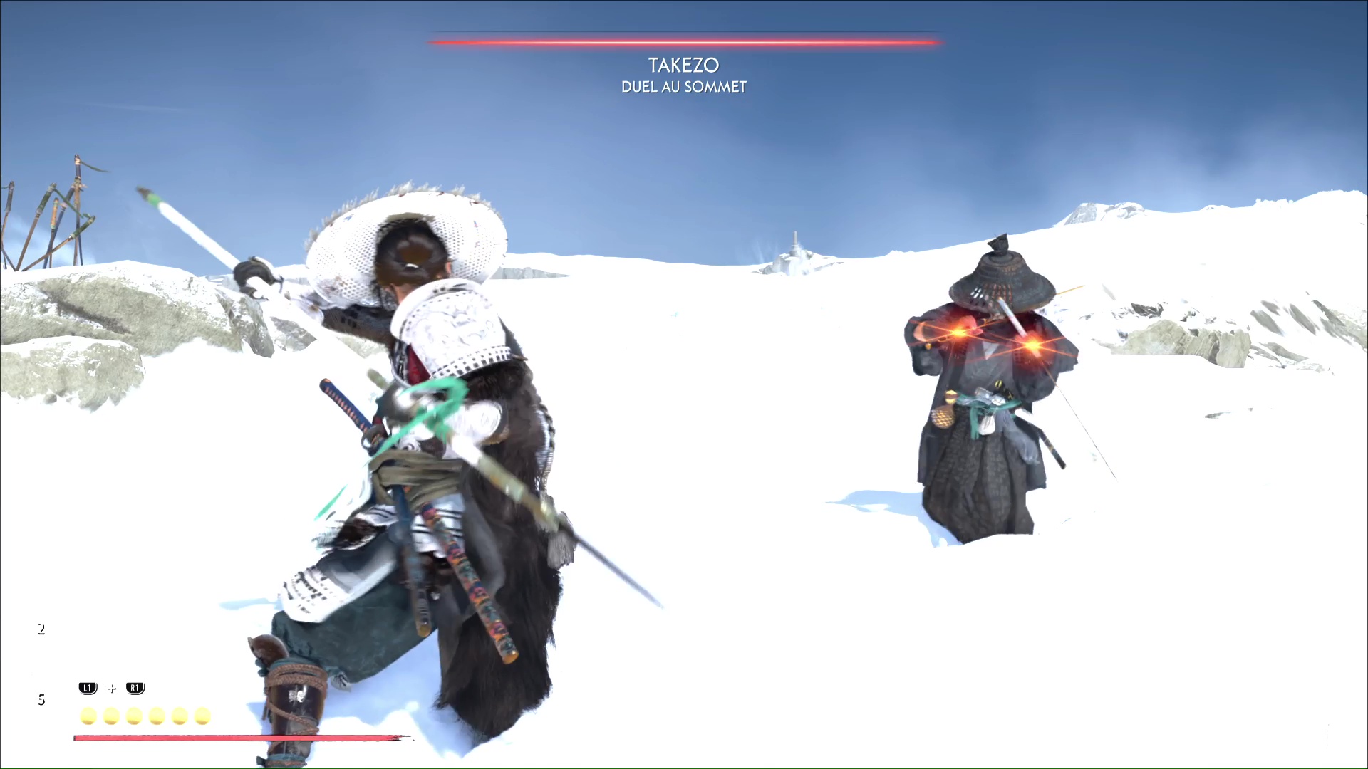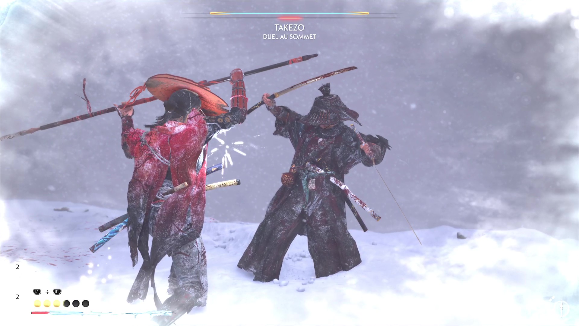 Le froid ne va pas tarder à s’inviter au combat ce qui, on le rappelle, va réduire votre vie max. Prenez garde aussi à Takezo qui tentera de vous désarmer, ce qui peut être un tournant dans le combat si vous vous faites avoir ou que vous tardez à récupérer votre arme.
