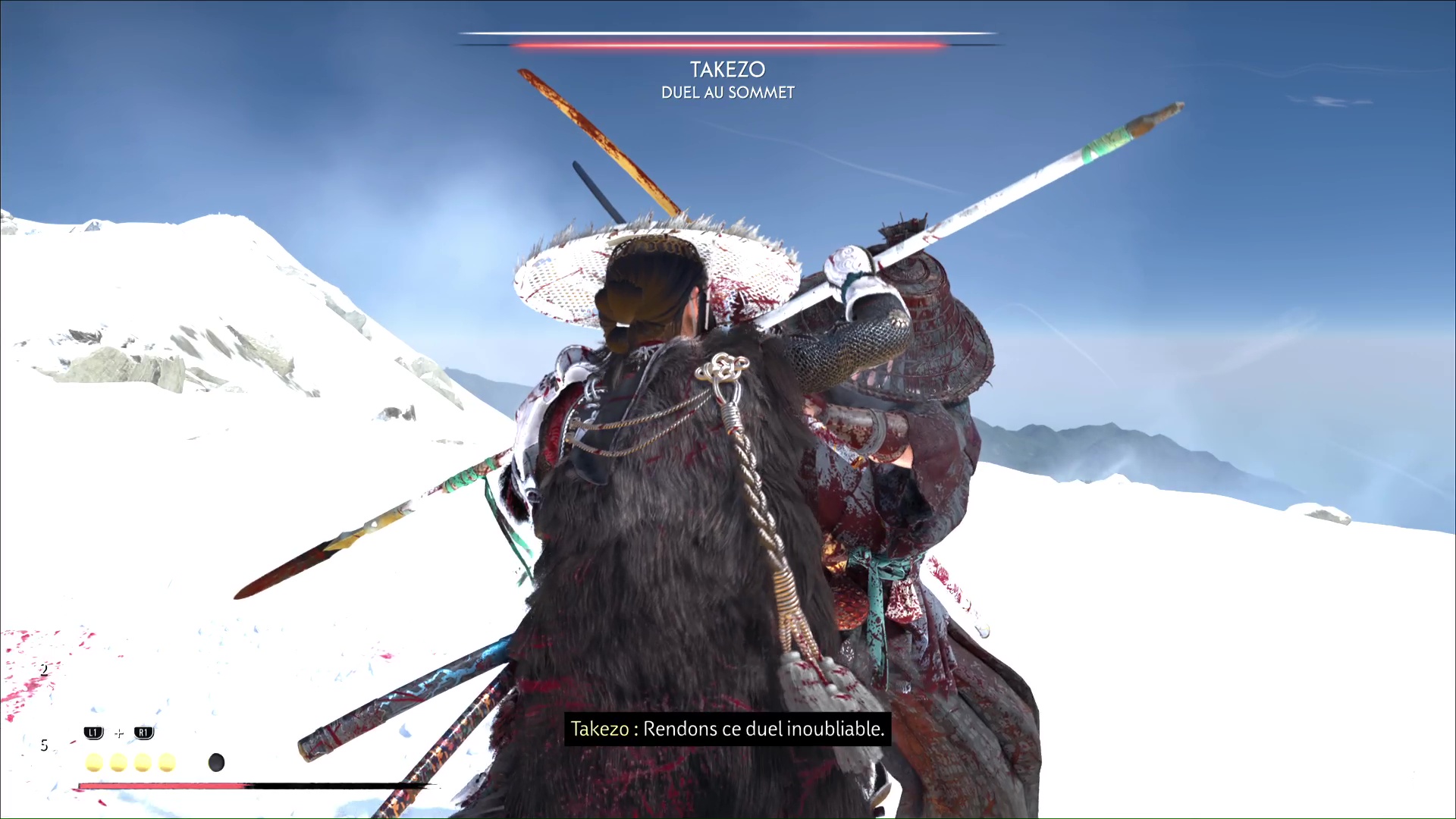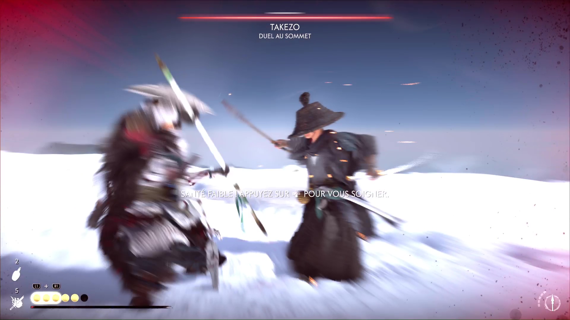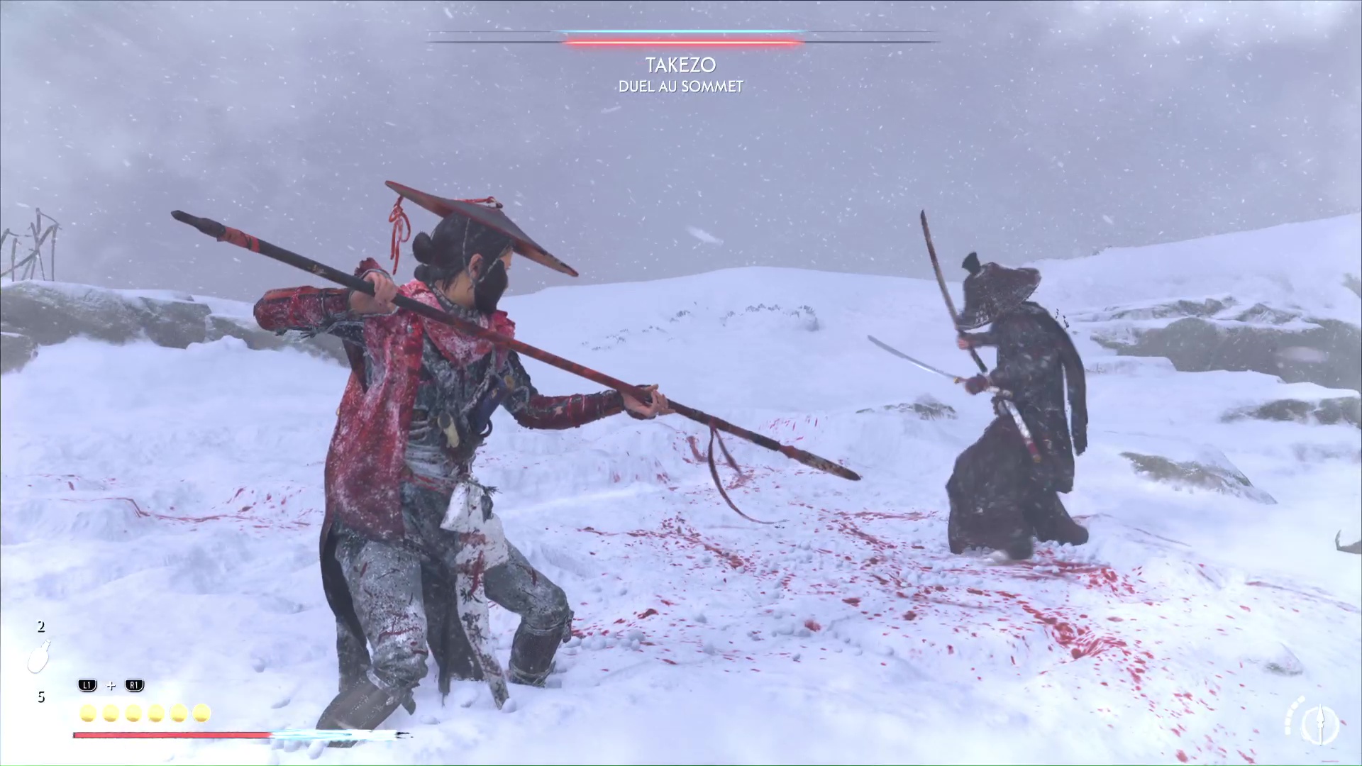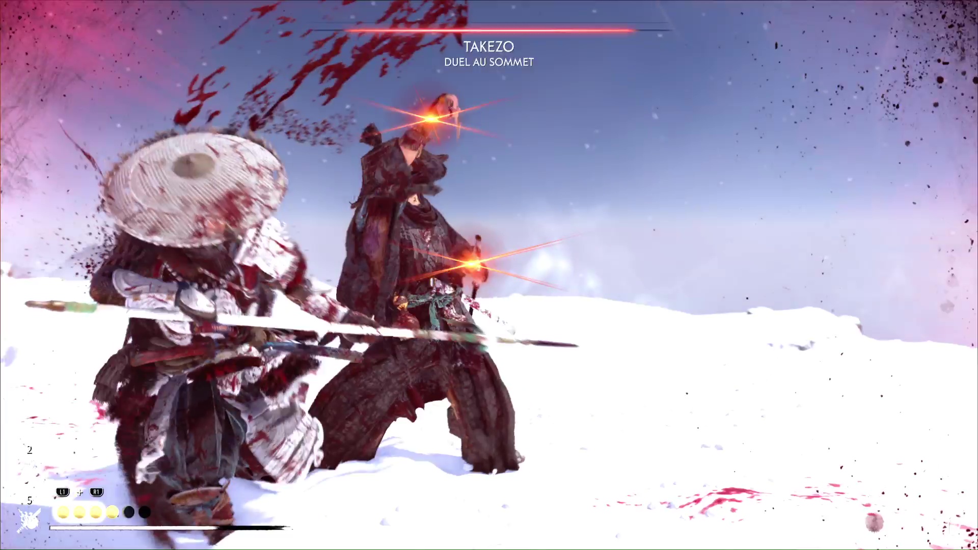 Le froid ne va pas tarder à s’inviter au combat ce qui, on le rappelle, va réduire votre vie max. Prenez garde aussi à Takezo qui tentera de vous désarmer, ce qui peut être un tournant dans le combat si vous vous faites avoir ou que vous tardez à récupérer votre arme.