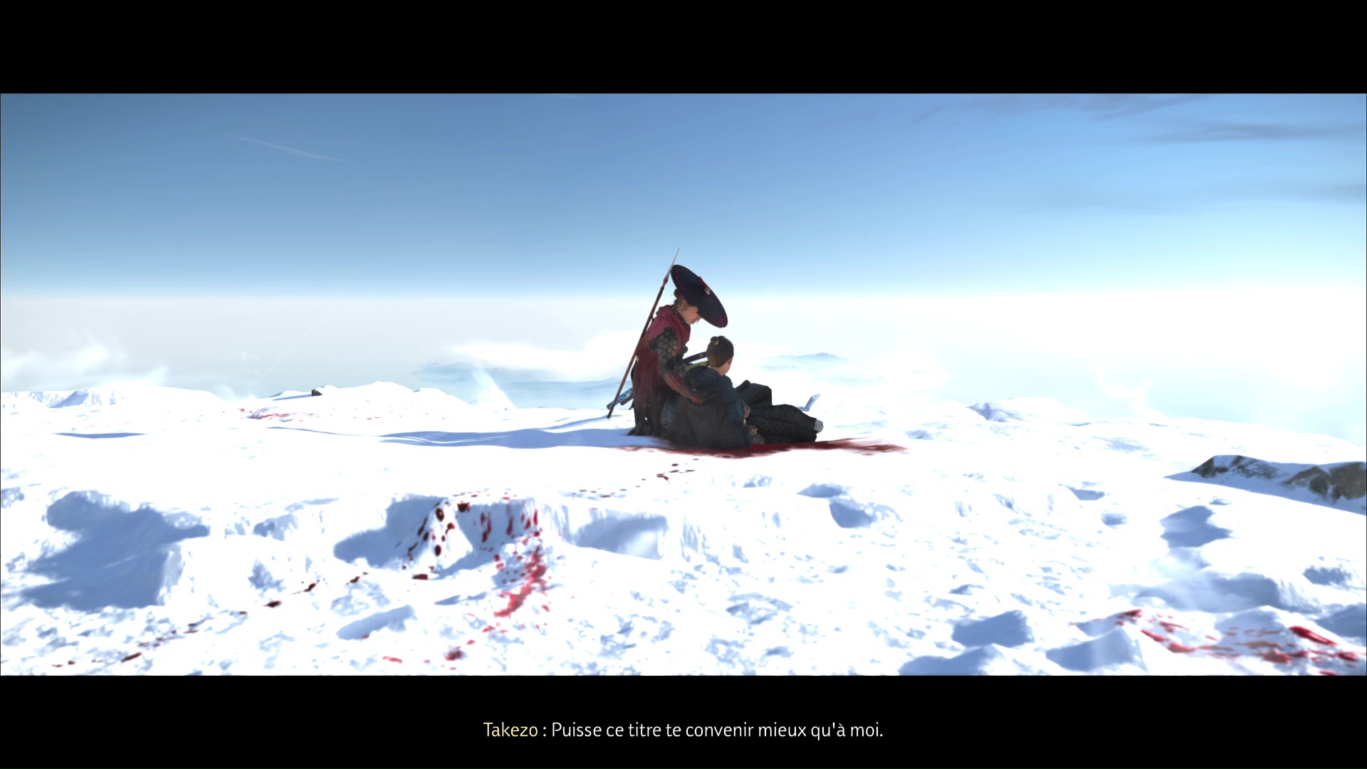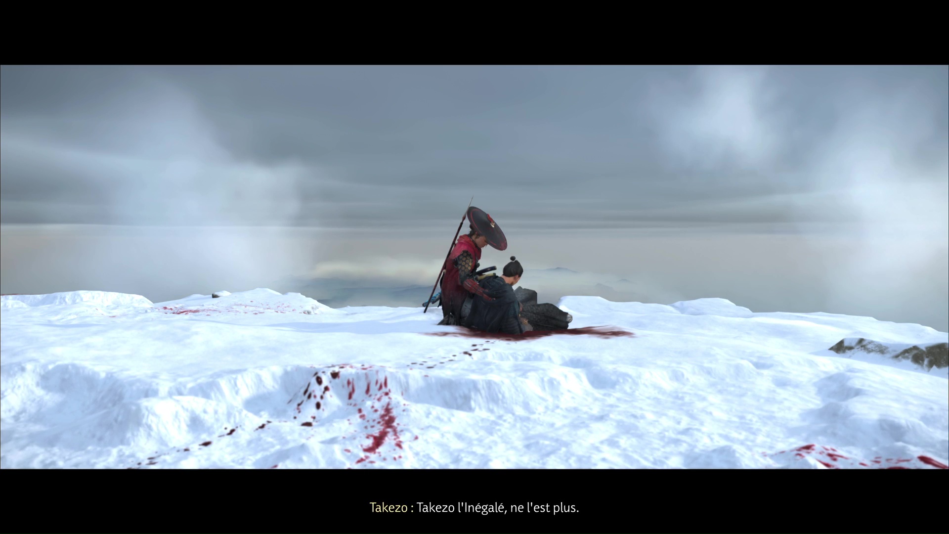 Une fois la vie de Takezo à zéro, il vous rendra hommage à l’occasion de son dernier souffle. Vous obtiendrez le Chapeau de paille de l’Inégalé, qui débloque par ailleurs d’autres coloris à acheter auprès de marchands et teinturières, et le trophée 🏆 L’Inégalée.