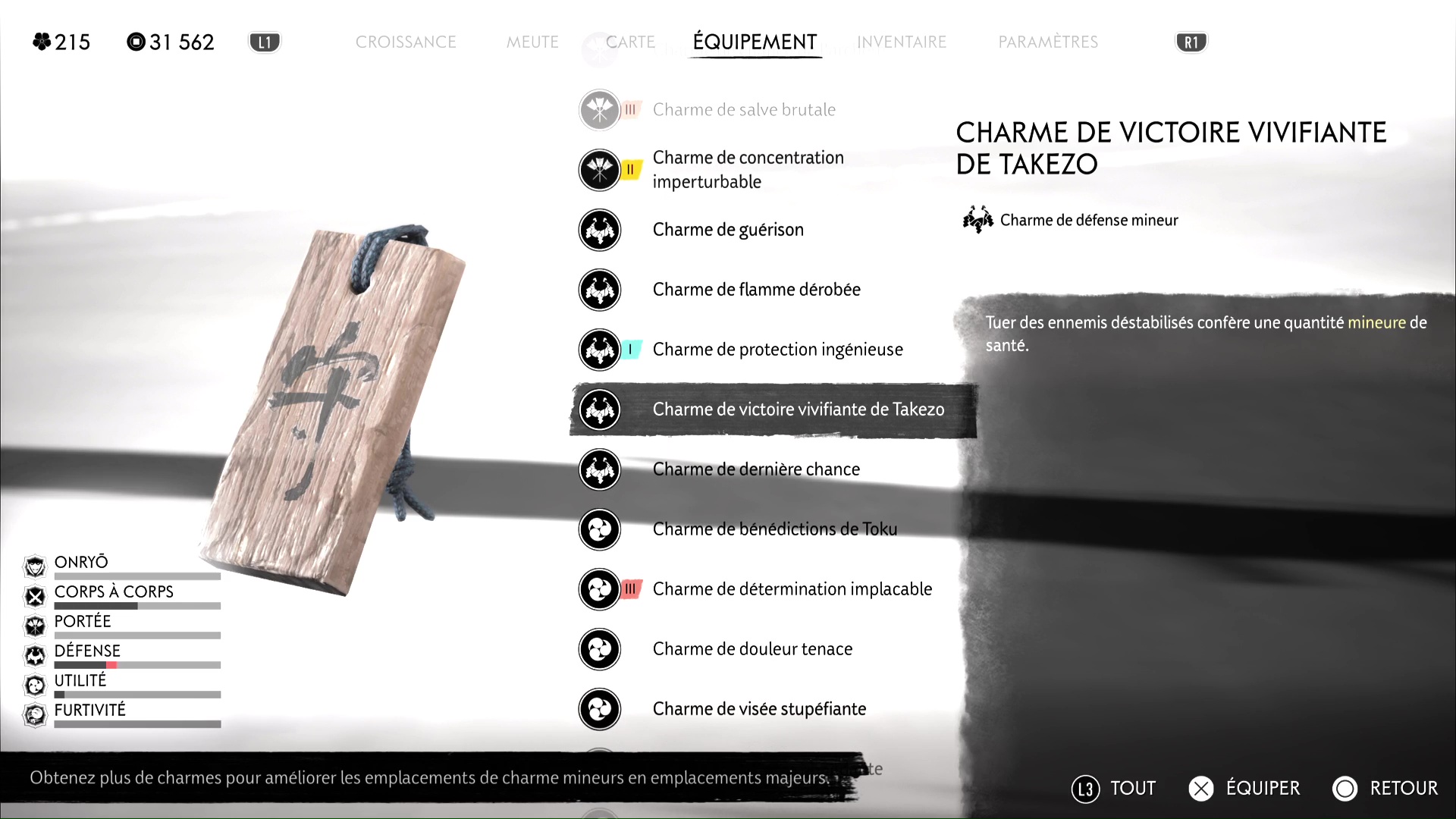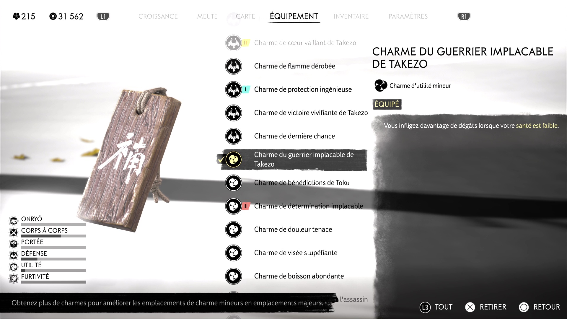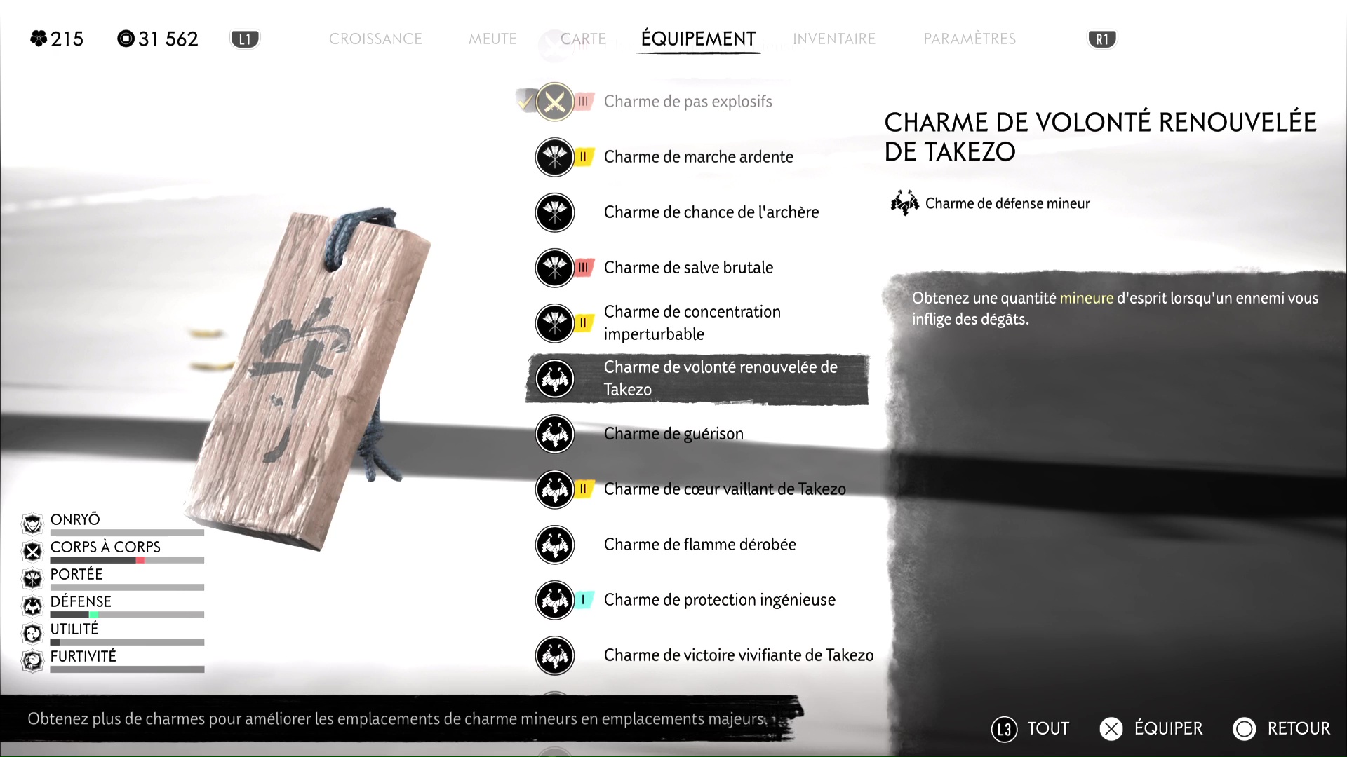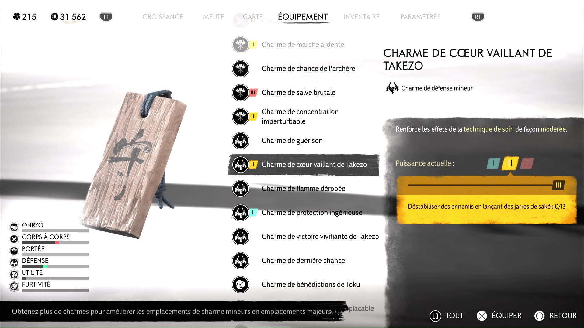 Si et seulement si vous les avez tous équipés, reposez-vous au feu de camp. Takezo va alors rappliquer et vous donner rendez-vous dans le cercle de combat juste à côté. À partir de là, et chose très importante, vous pouvez rééquiper les charmes que vous préférez.