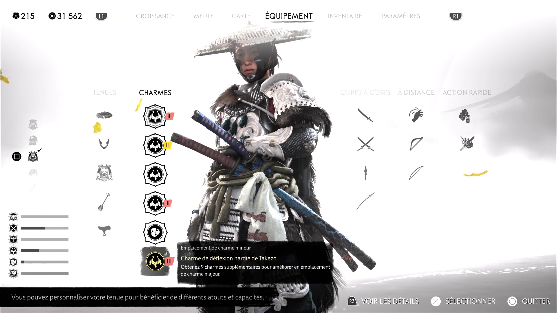 Pour vous rendre le combat moins long, mais aussi plus technique et exigeant, l’armure du Maître des primes, centré sur les parades parfaites, est un très bon choix face à Takezo. Quoi qu’il en soit, prenez le build avec lequel vous êtes le plus à l’aise, et lancez-vous.