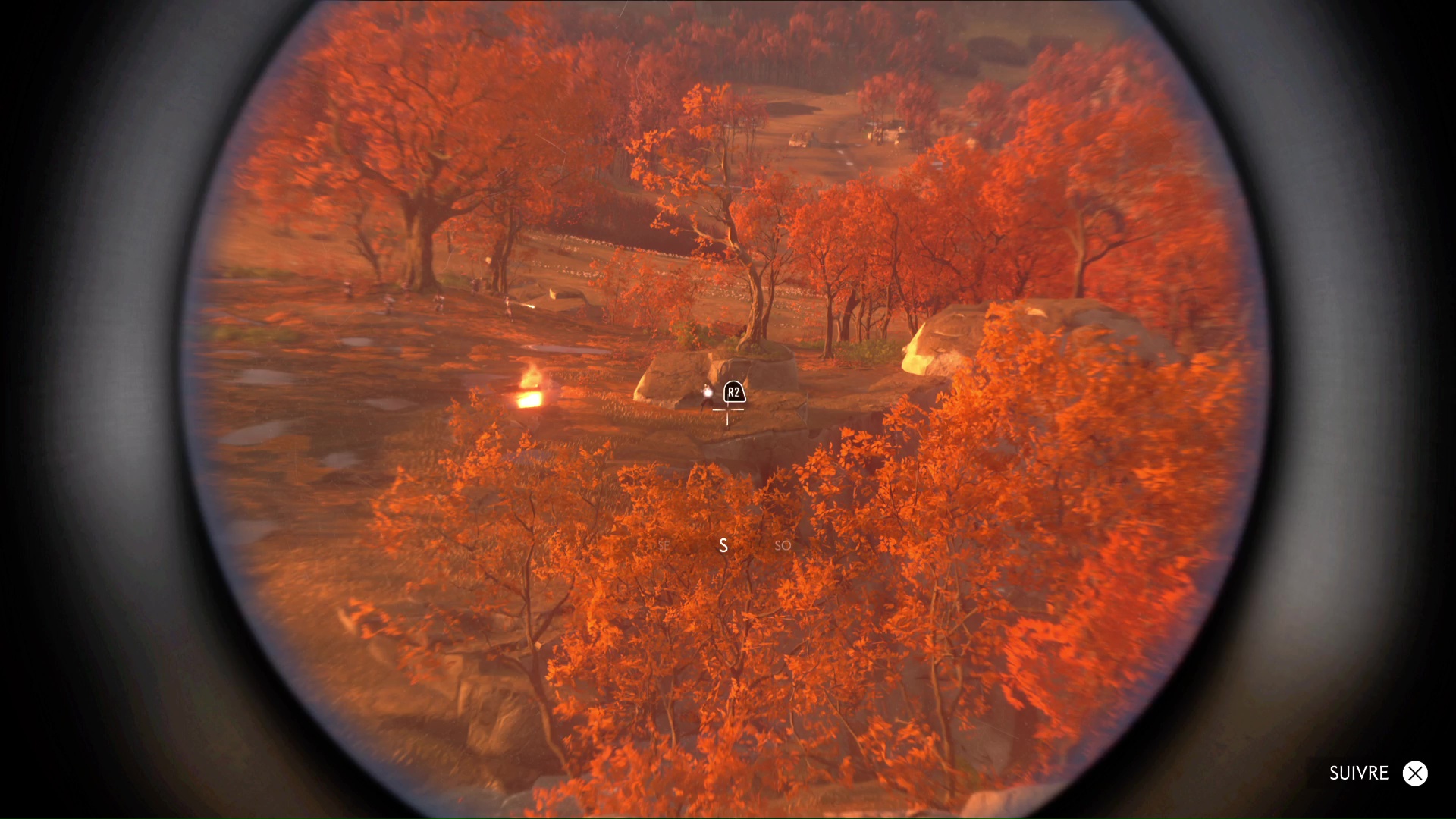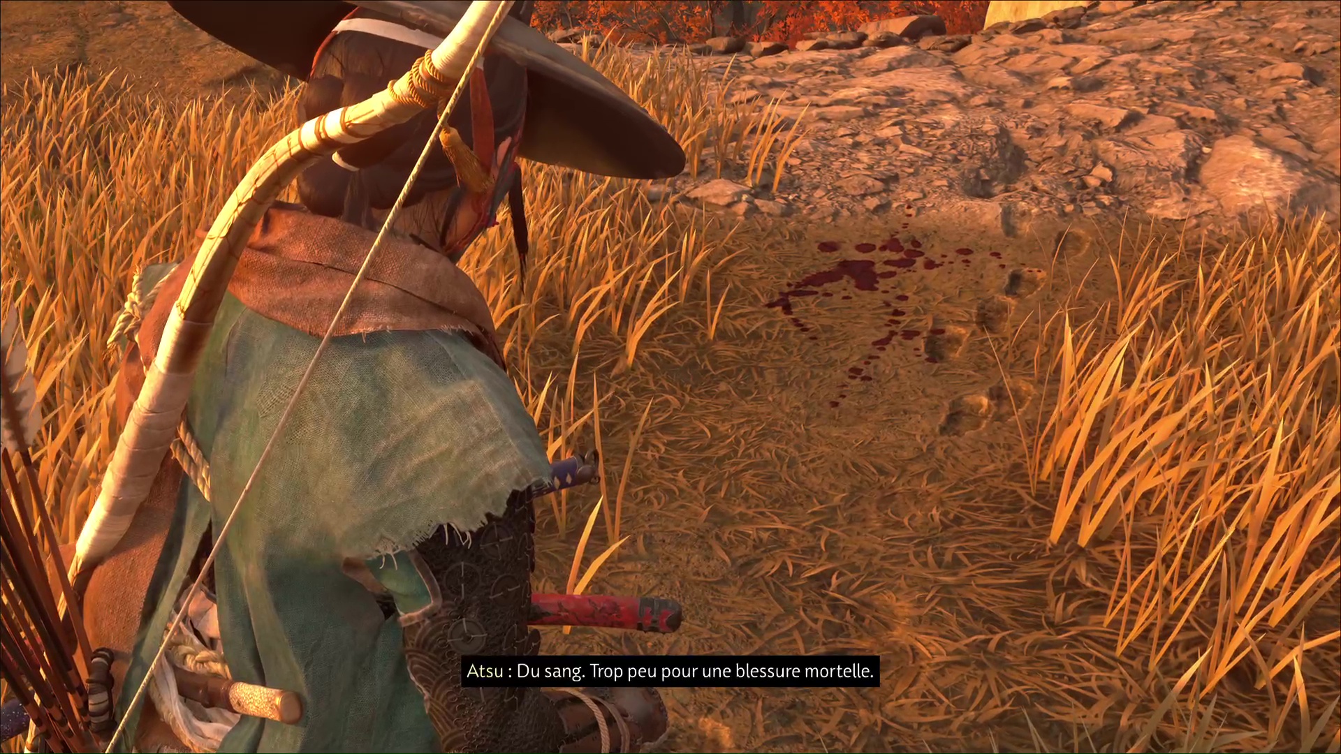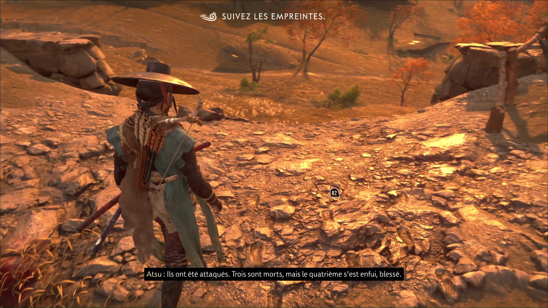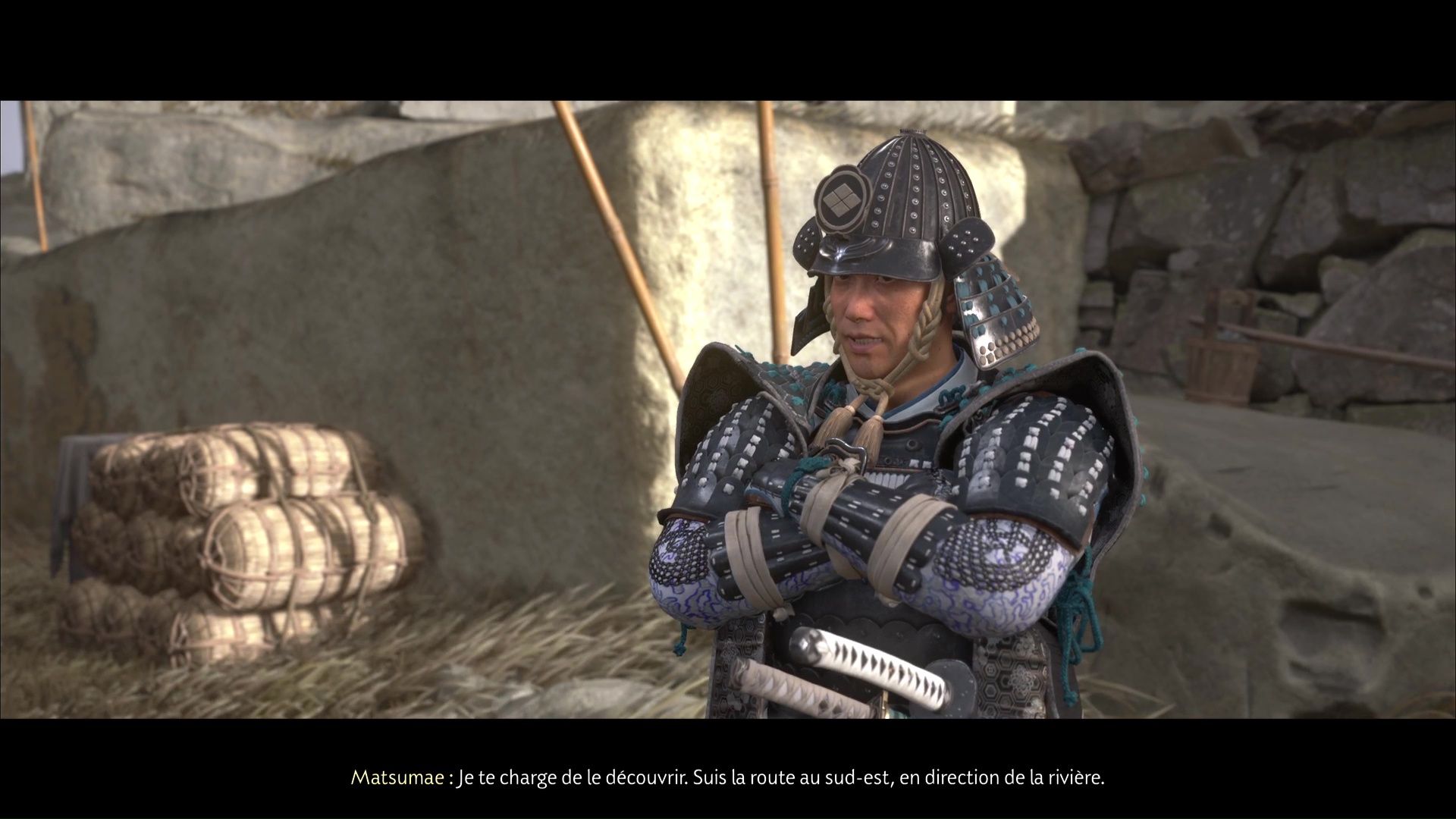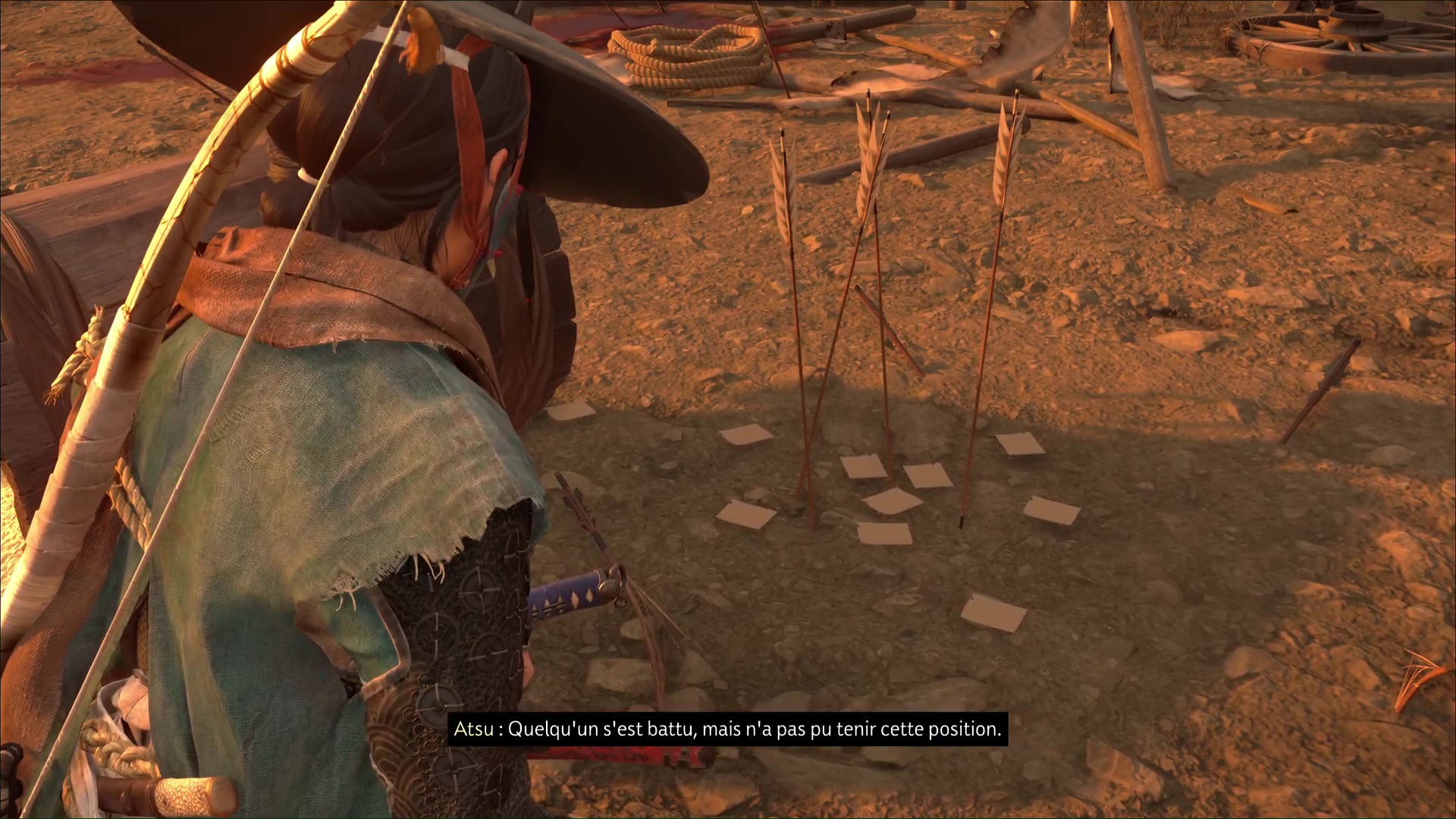 Atsu décide alors de sortir sa longue-vue pour trouver une piste. Regardez plein sud, au niveau d’un rocher, pour voir que le dernier survivant Matsumae subit l’assaut de pillards.