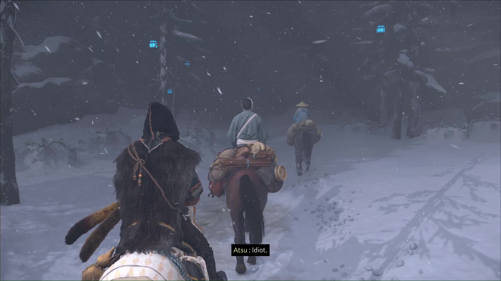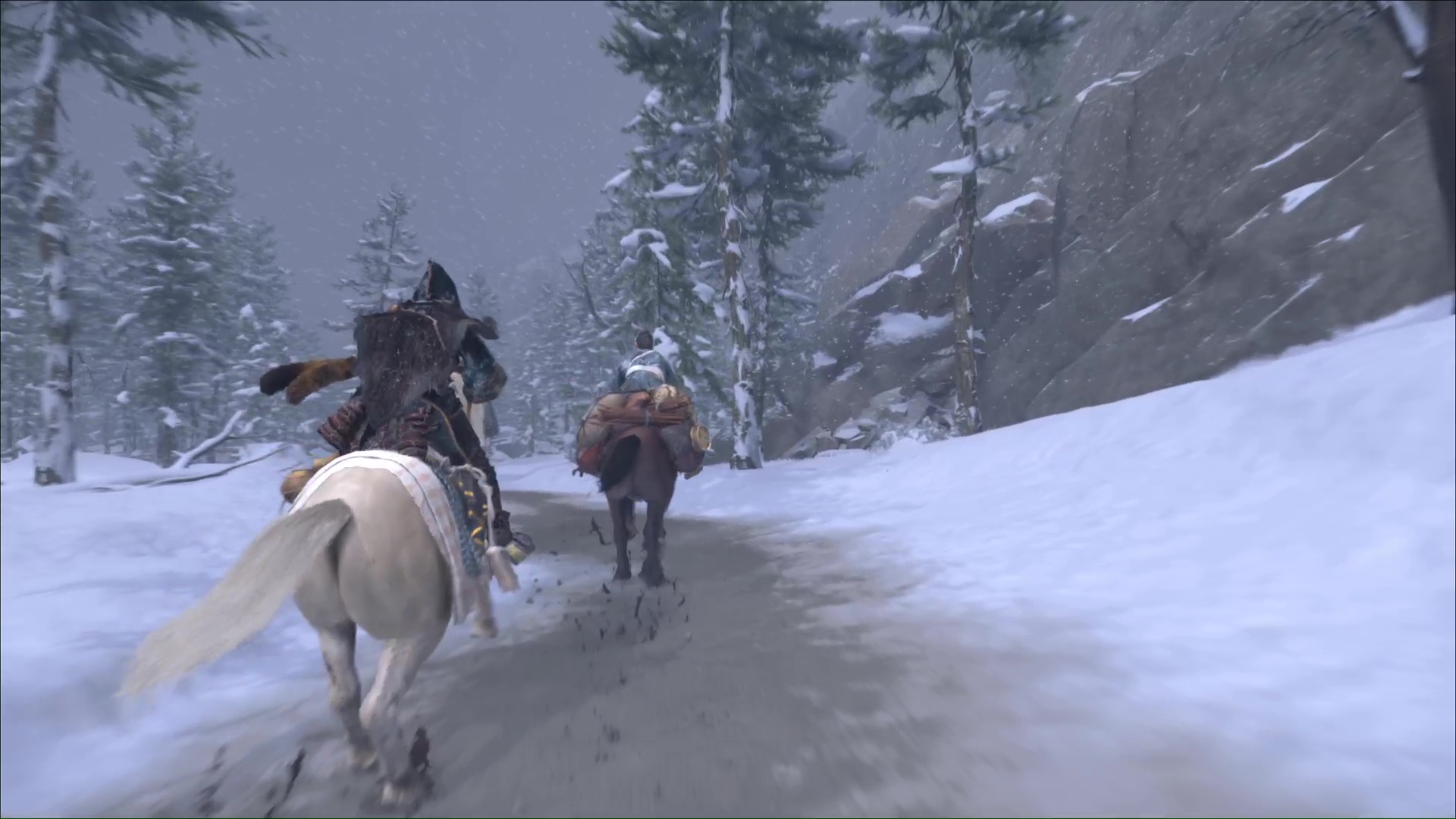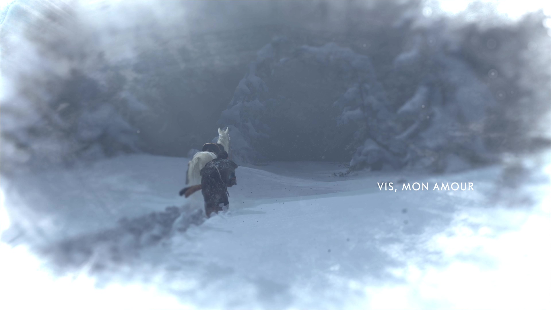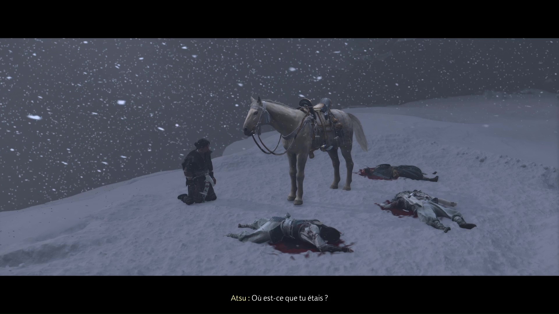 Atsu reprend ses esprits quelques minutes plus tard, et ramasse un papier sur l’un des cadavres. À présent, le blizzard fait rage et il faut trouver un abri. Marchez avec votre cheval tout en profitant de la musique.