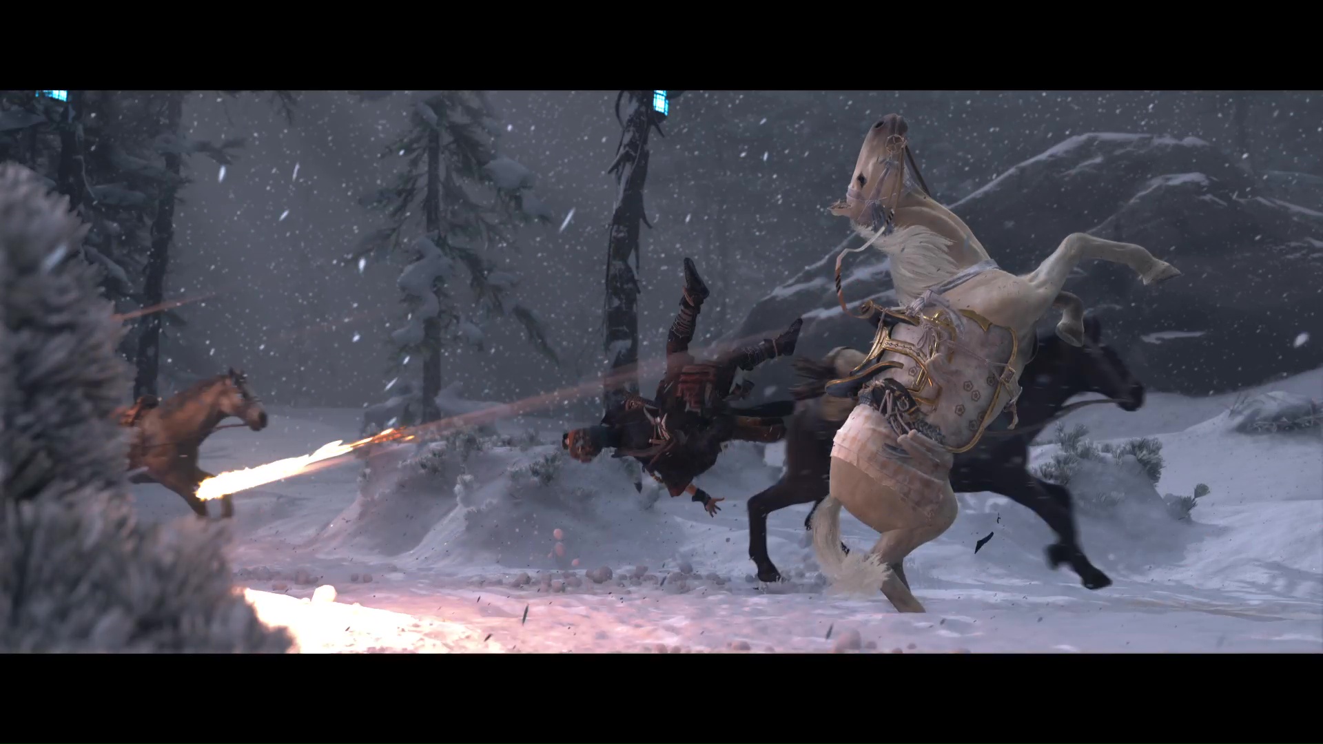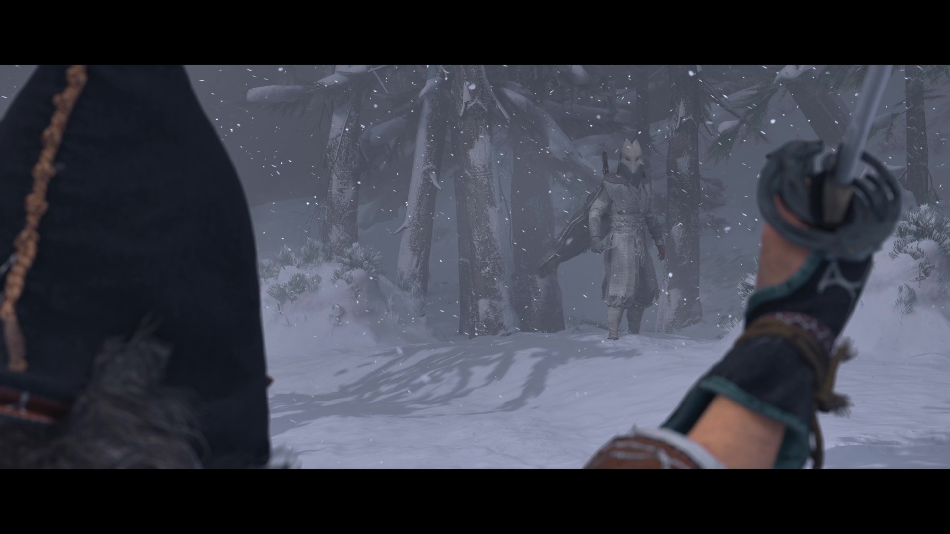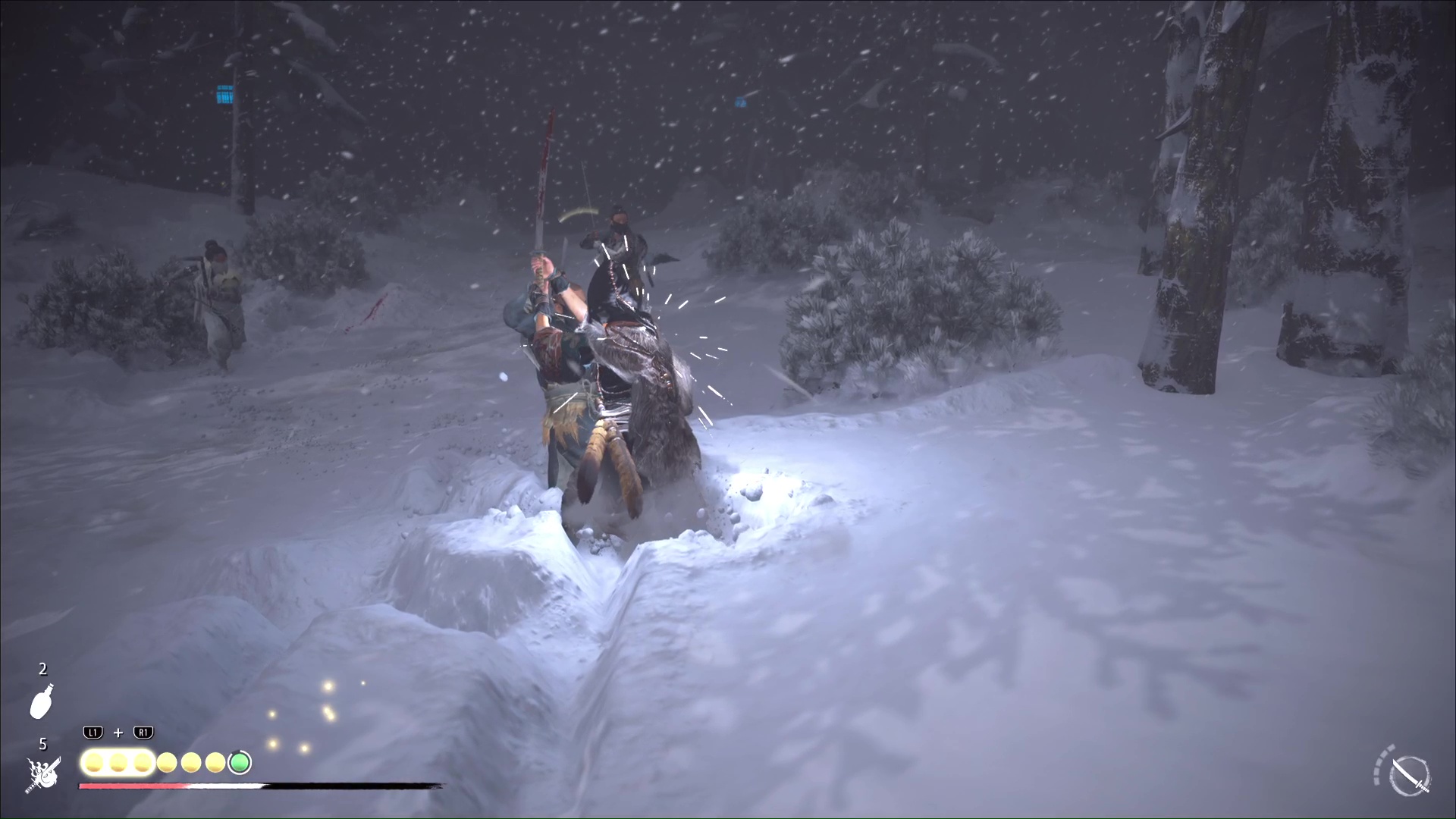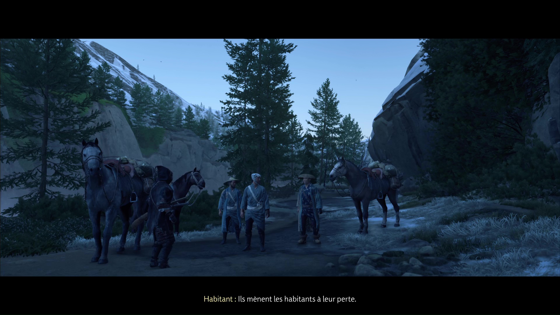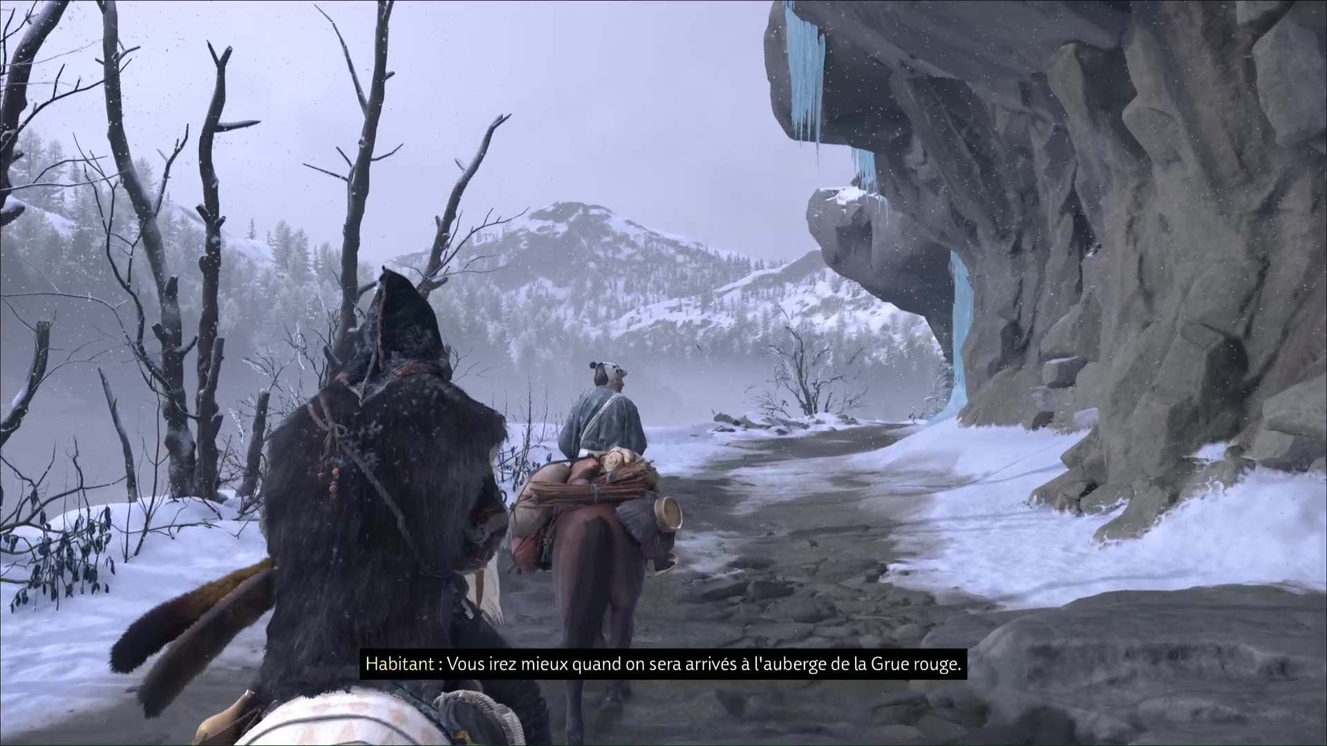 Atsu reprend ses esprits quelques minutes plus tard, et ramasse un papier sur l’un des cadavres. À présent, le blizzard fait rage et il faut trouver un abri. Marchez avec votre cheval tout en profitant de la musique.