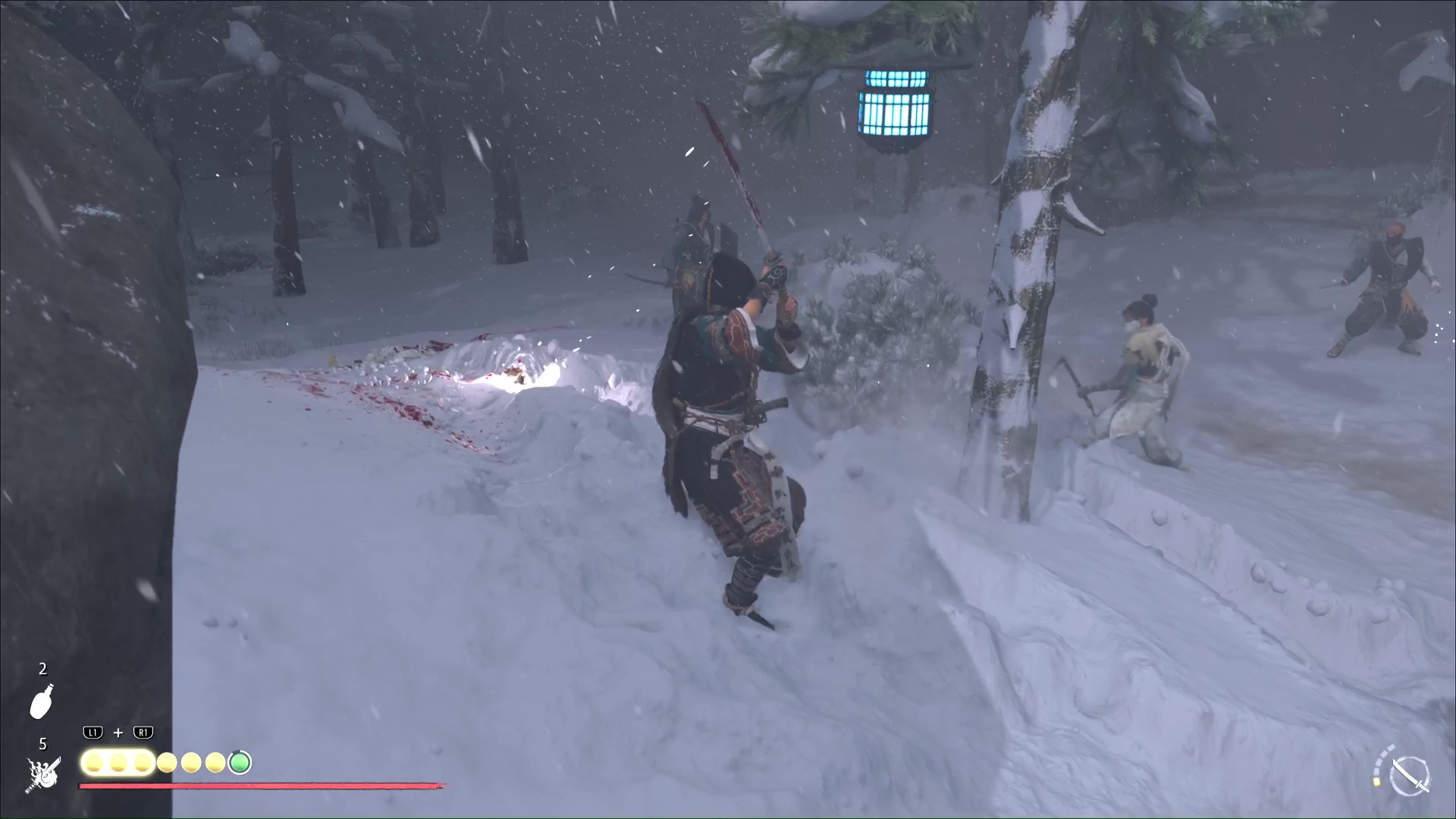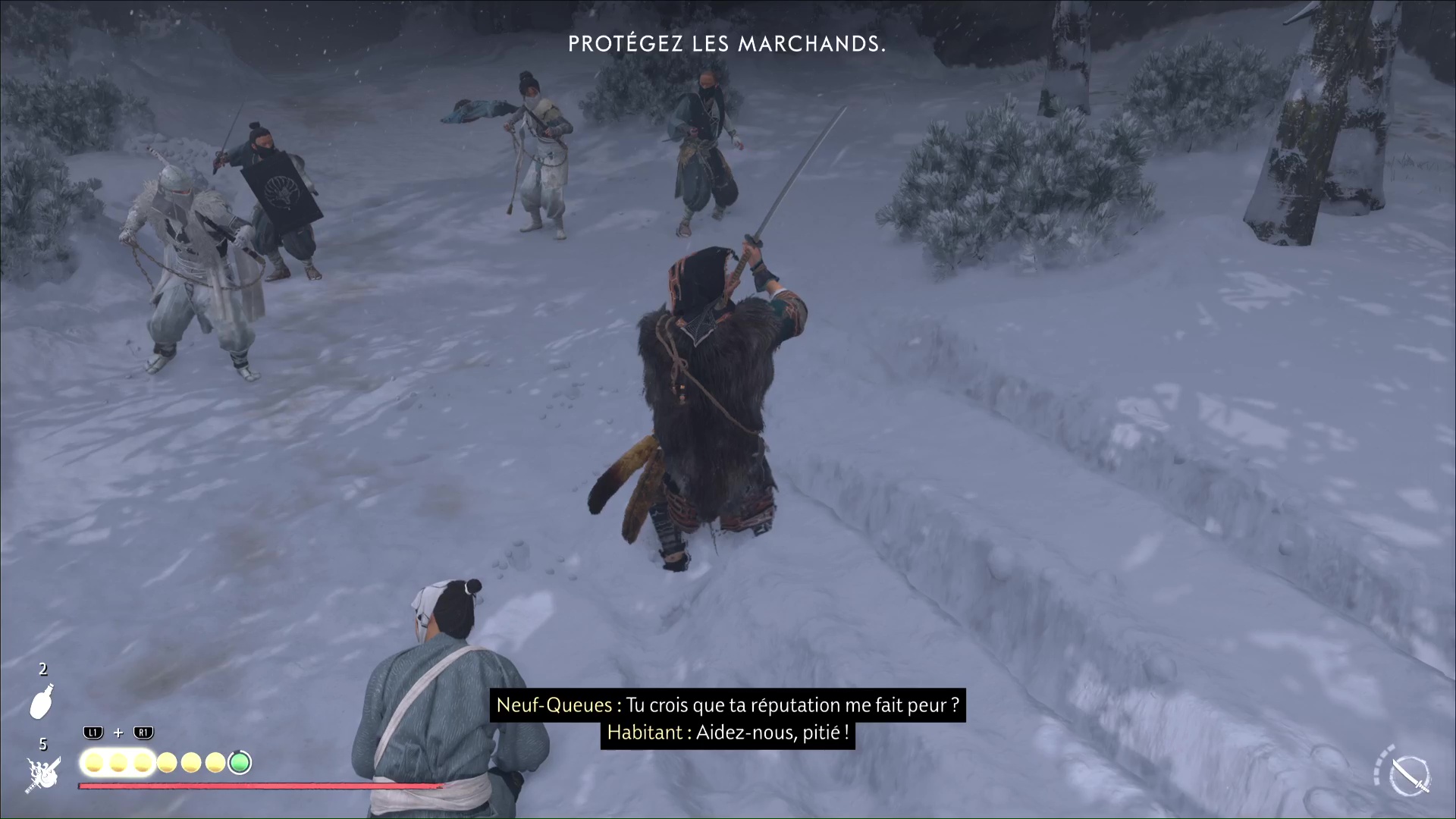 Soudain, vous êtes attaqué par des shinobis. Vous découvrez les ennemis porteurs de kusarigama, des armes composées d’une faucille et d’une chaîne. Faites aussi attention aux jets de bombe aveuglante.
