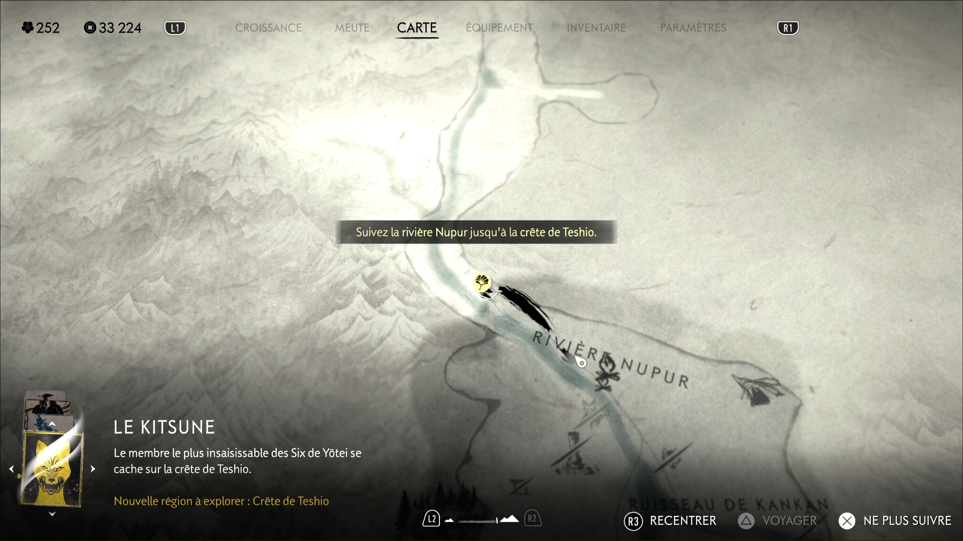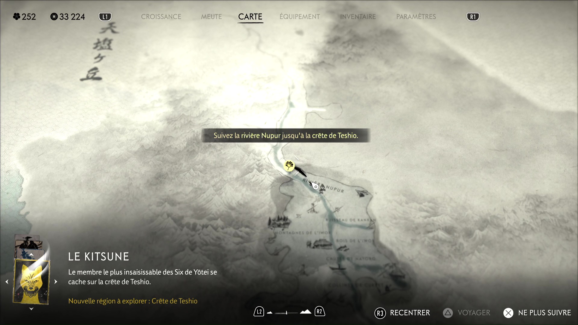 Au cours de votre recherche sur les Six de Yōtei, un habitant ou un ennemi interrogé sur le Kitsune vous mettra sur sa piste, qui démarre au nord des Monts Tokachi. Précisément, il faut rejoindre le Bac central et traverser en s’adressant à huci, une aïnou.