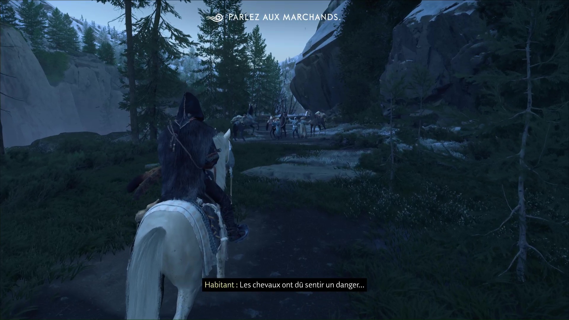 Une fois arrivé dans les Terres sauvages de Nayoro, la route continue tout au nord, près de la Rivière Nupur. Vous apercevrez des marchands en train d’essayer de calmer leurs montures.