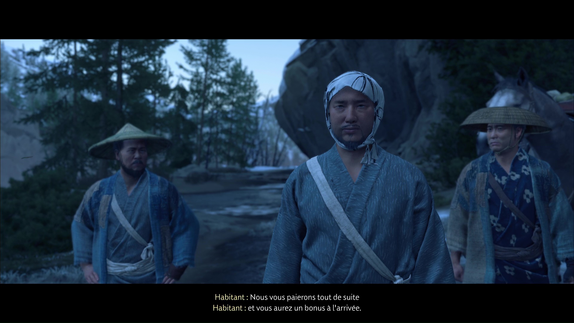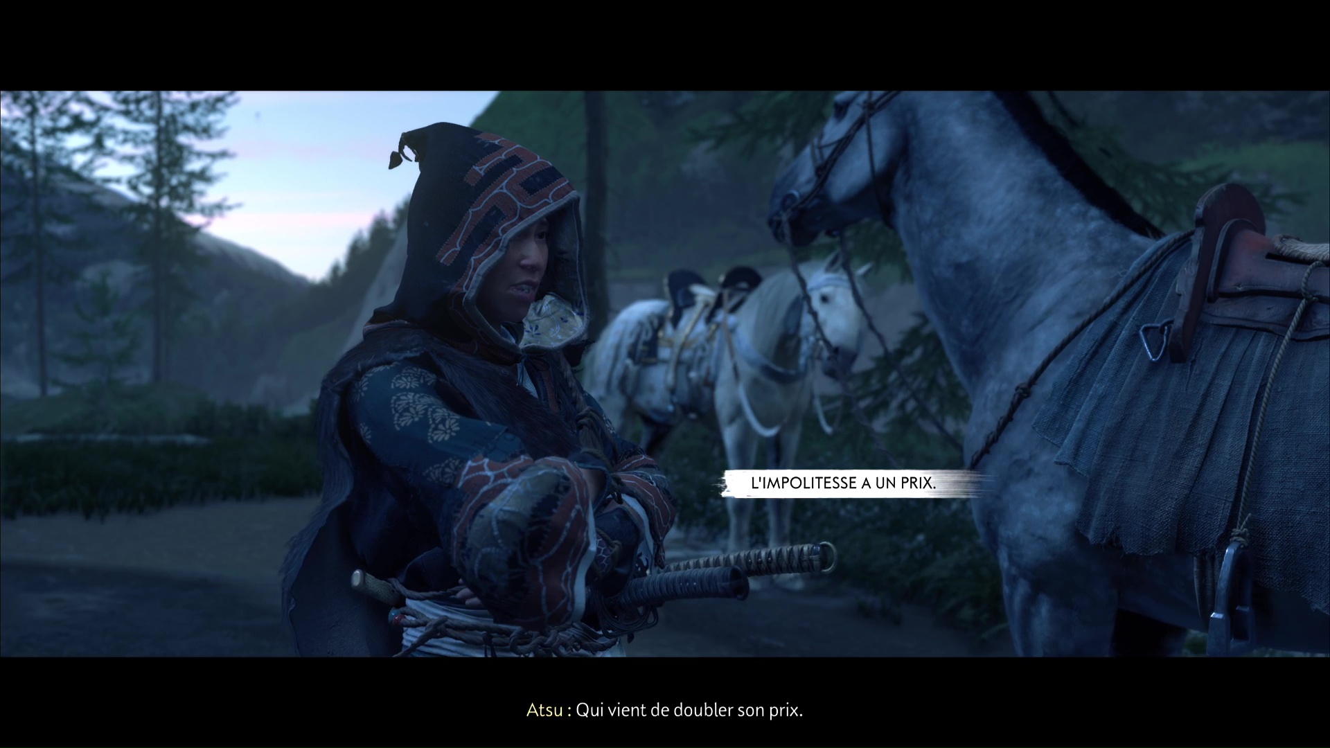 Parlez à ces marchands et l’un d’eux vous dira le danger que représente la crête de Teshio. Voyant Atsu avec une arme, l’un d’eux demande alors si vous acceptez de les escorter. Répondez bien « L’impolitesse a un prix » pour déclencher la suite.