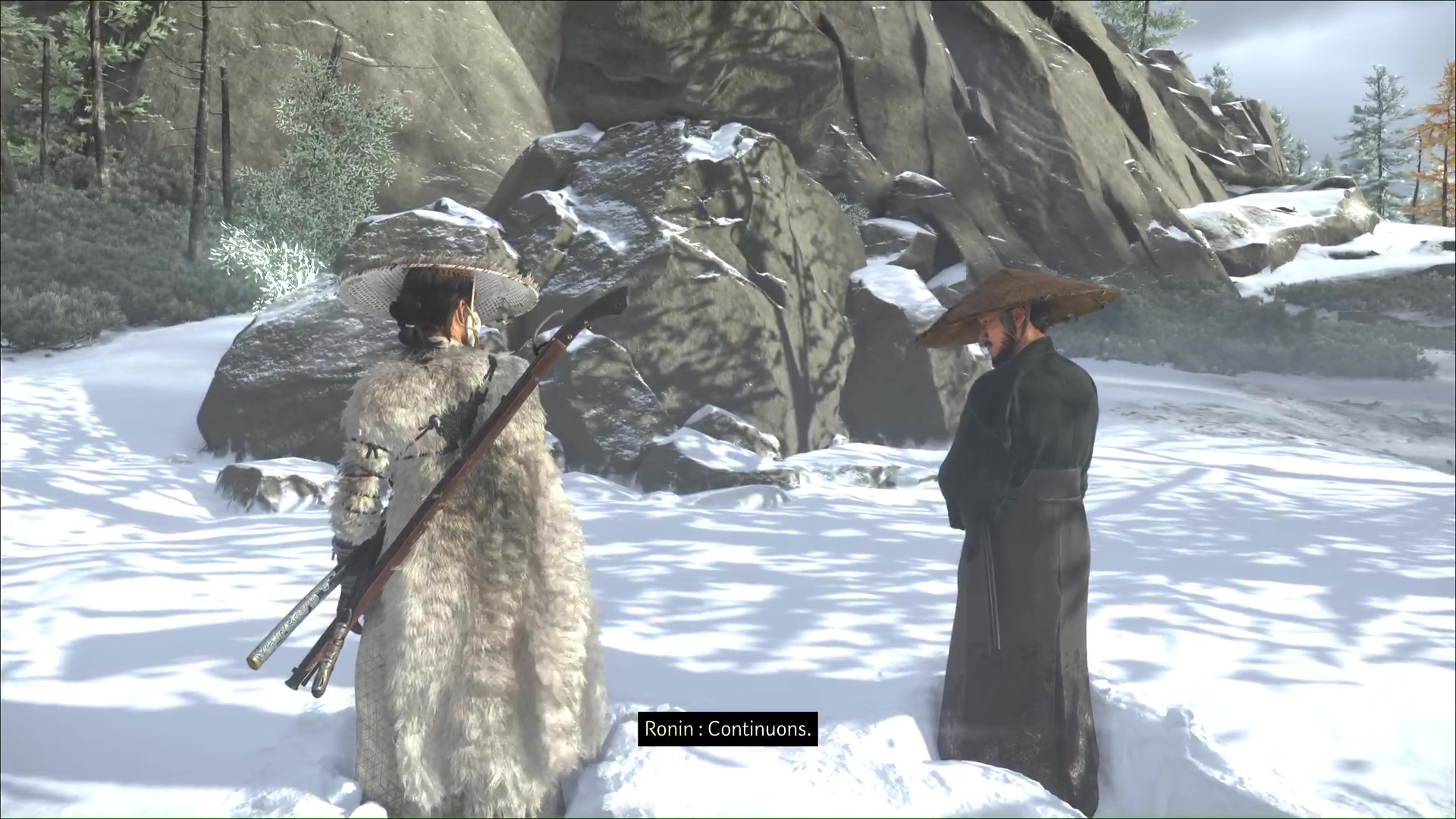 Remettez-vous en marche, le temps que l’aveugle parle de sa femme souffrante. Arrivé au rocher, celui-ci retrouve son chemin. Après quelques pas, vous avez malheureusement la mauvaise surprise d’être aveuglée par le metsubushi avant qu’une deuxième personne ne vous rejoigne.
