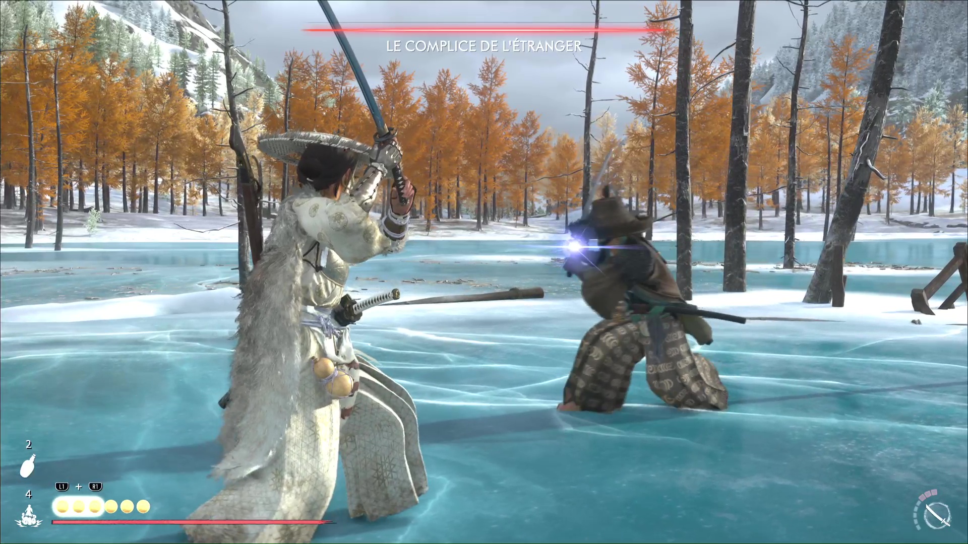 Votre adversaire se bat au départ avec son katana. Il utilisera régulièrement des attaques bleues, donc soyez prêt à souvent parer et/ou dévier sa lame.