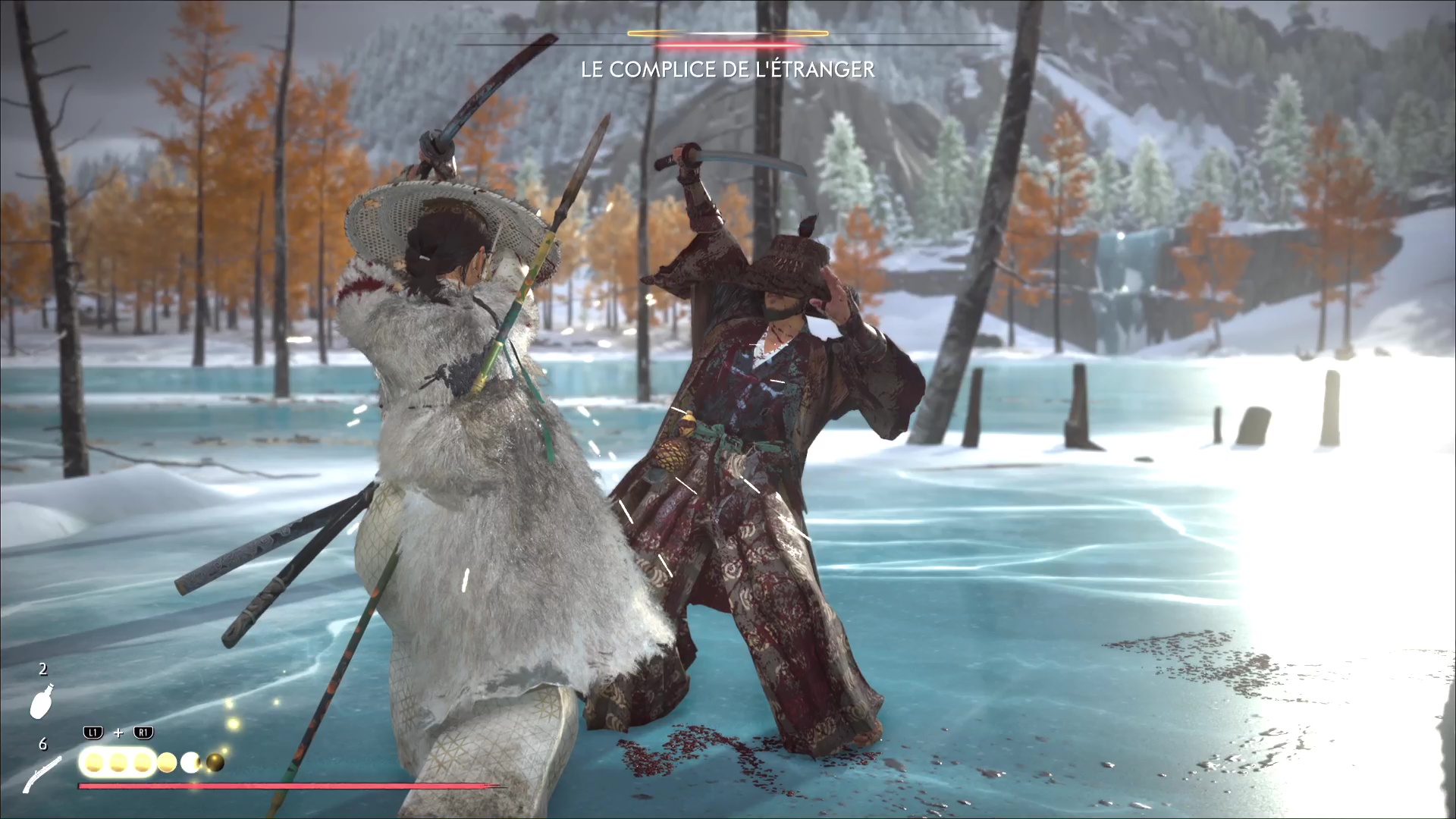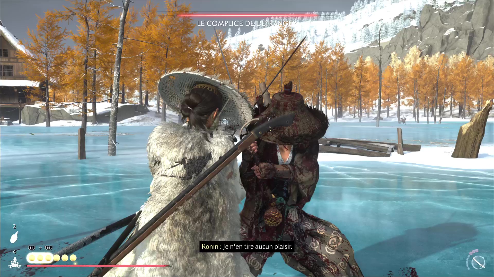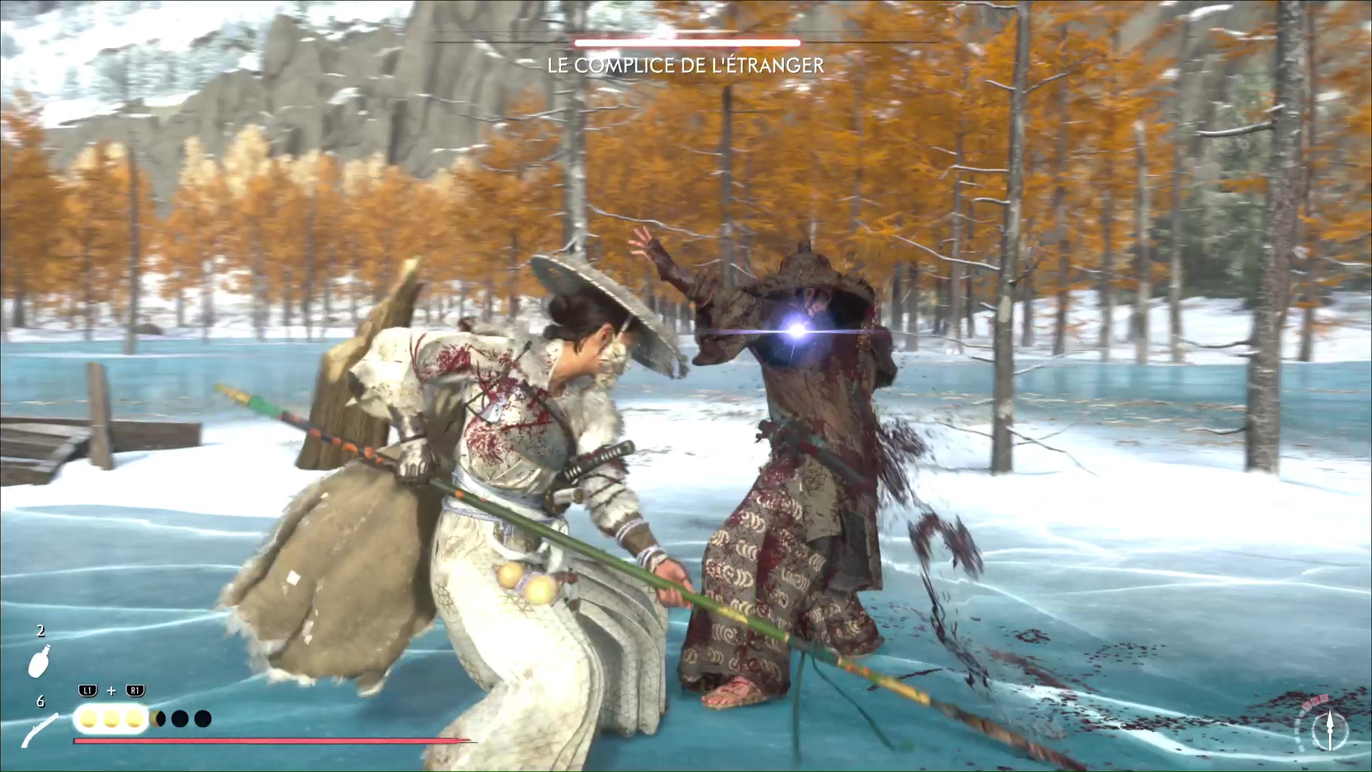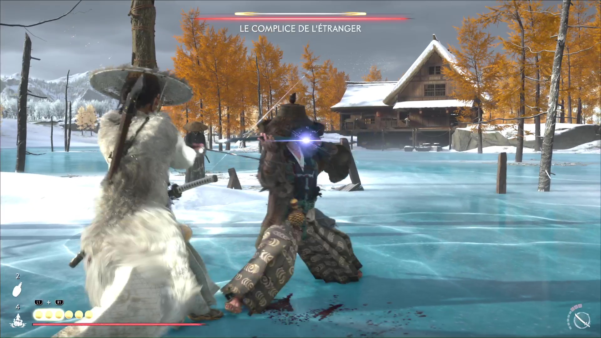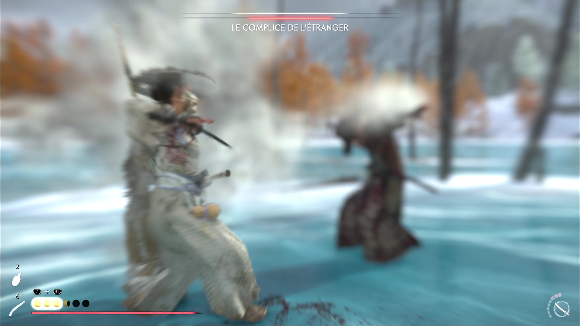 Au fil du combat, ou si vous le désarmez, le complice sortira son kusarigama, ce à quoi vous pouvez riposter avec votre lance. Il lui arrivera aussi de vous aveugler avec son metsubushi.