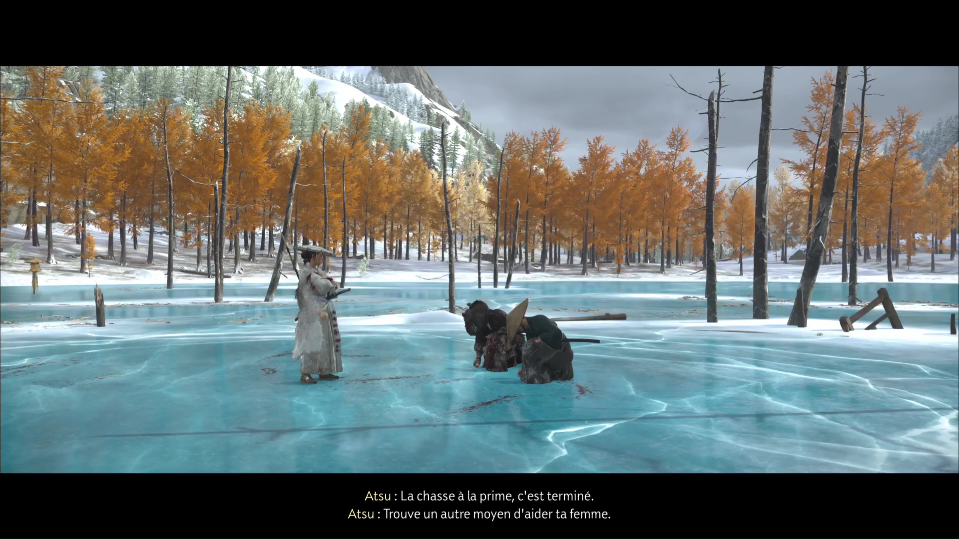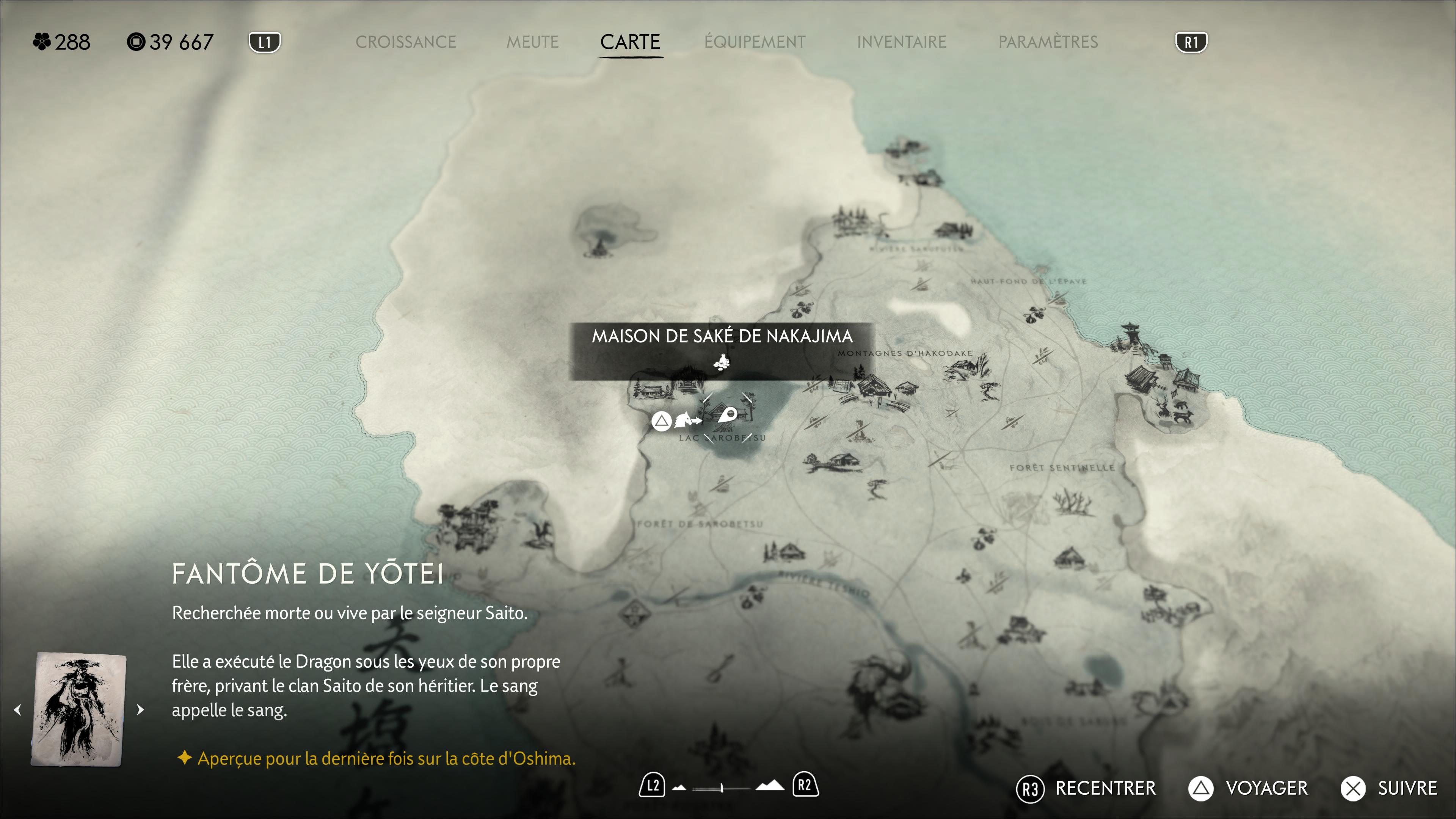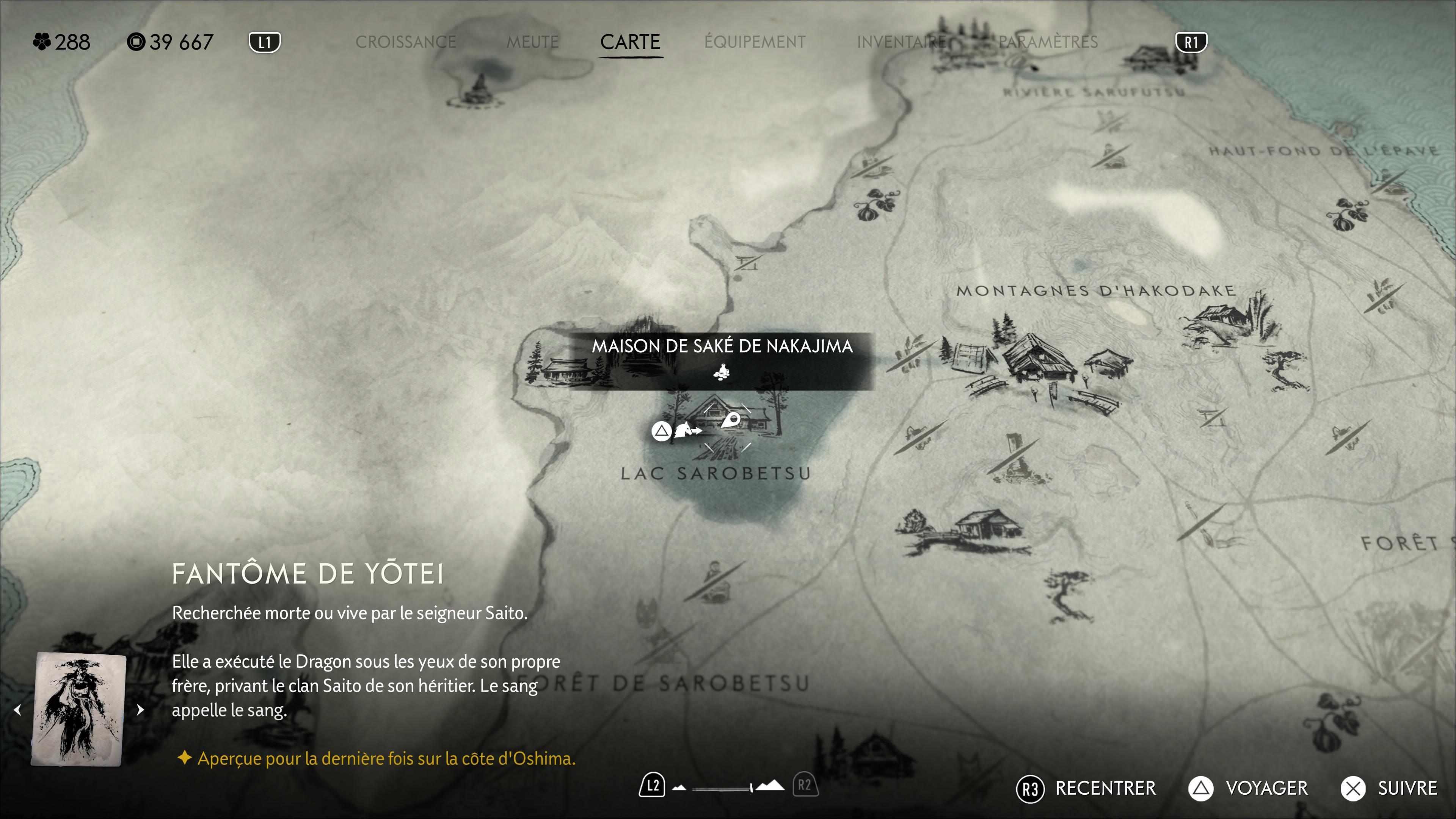 Malgré la légende de l’onryō qu’elle nourrit à chaque ennemi tué, Atsu sait parfois faire preuve d’humanité. Un homme aveugle à la maison de saké de Nakajima, à la Crête de Teshio, aurait bien besoin d’un coup de main pour rentrer chez lui. Notre héroïne se propose donc pour l’escorter avec, en plus, la promesse d’une récompense intéressante. Une mission qui paraît simple sur le papier, et qui constitue un nouveau récit de Ghost of Yōtei.