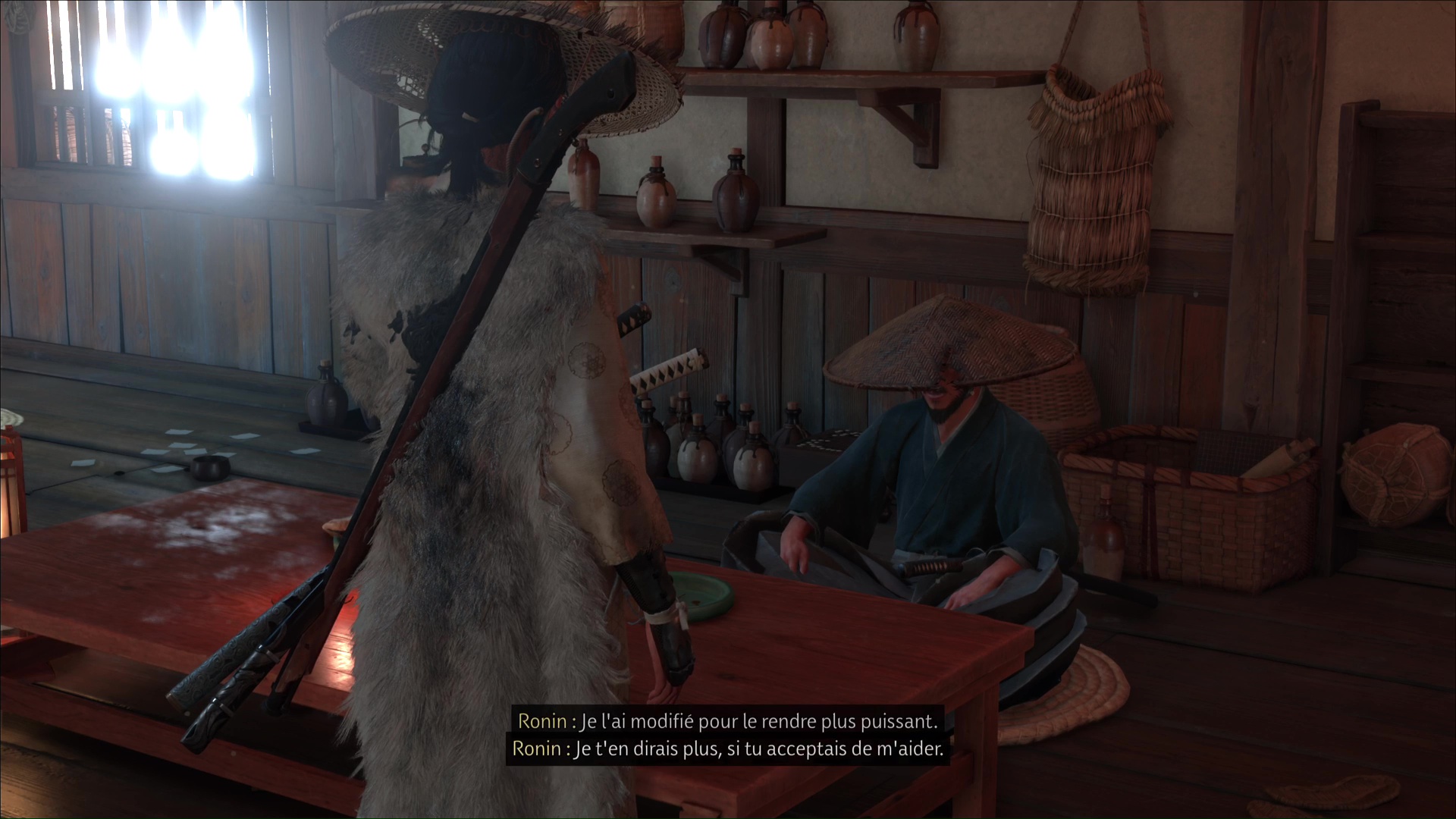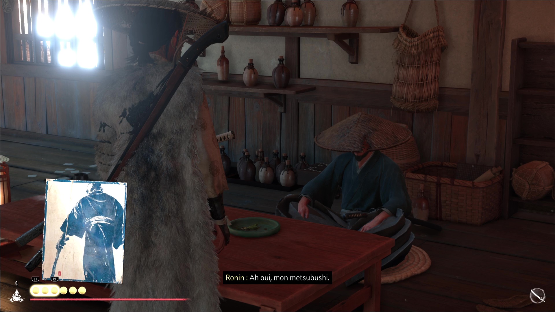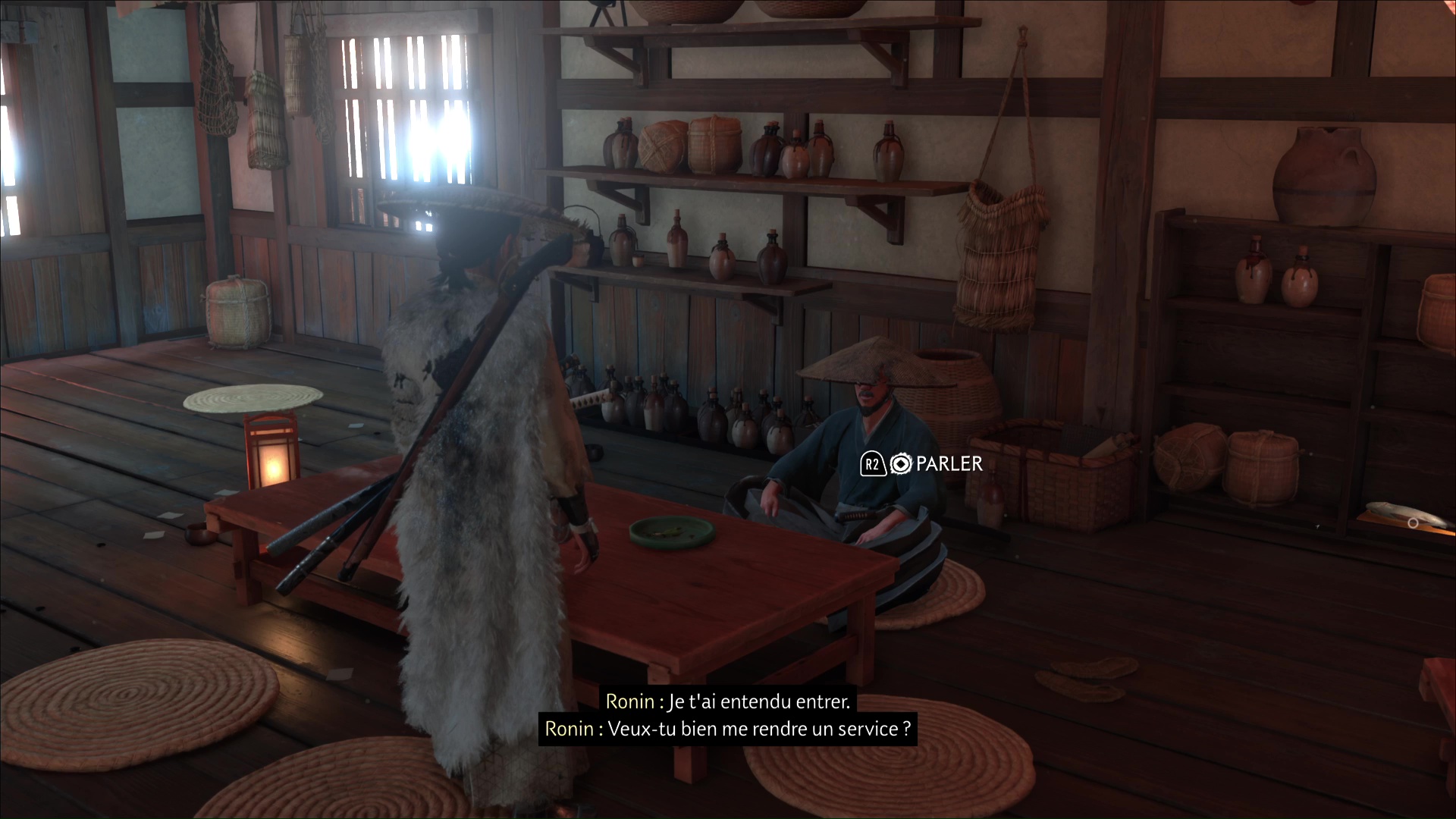 Approchez ensuite de l’autre ronin resté assis à table et adressez-lui la parole. Il vous parlera alors de son metsubushi, une poudre aveuglante qu’il a modifiée pour améliorer ses effets. Si vous l’aidez, il vous partagera son secret.