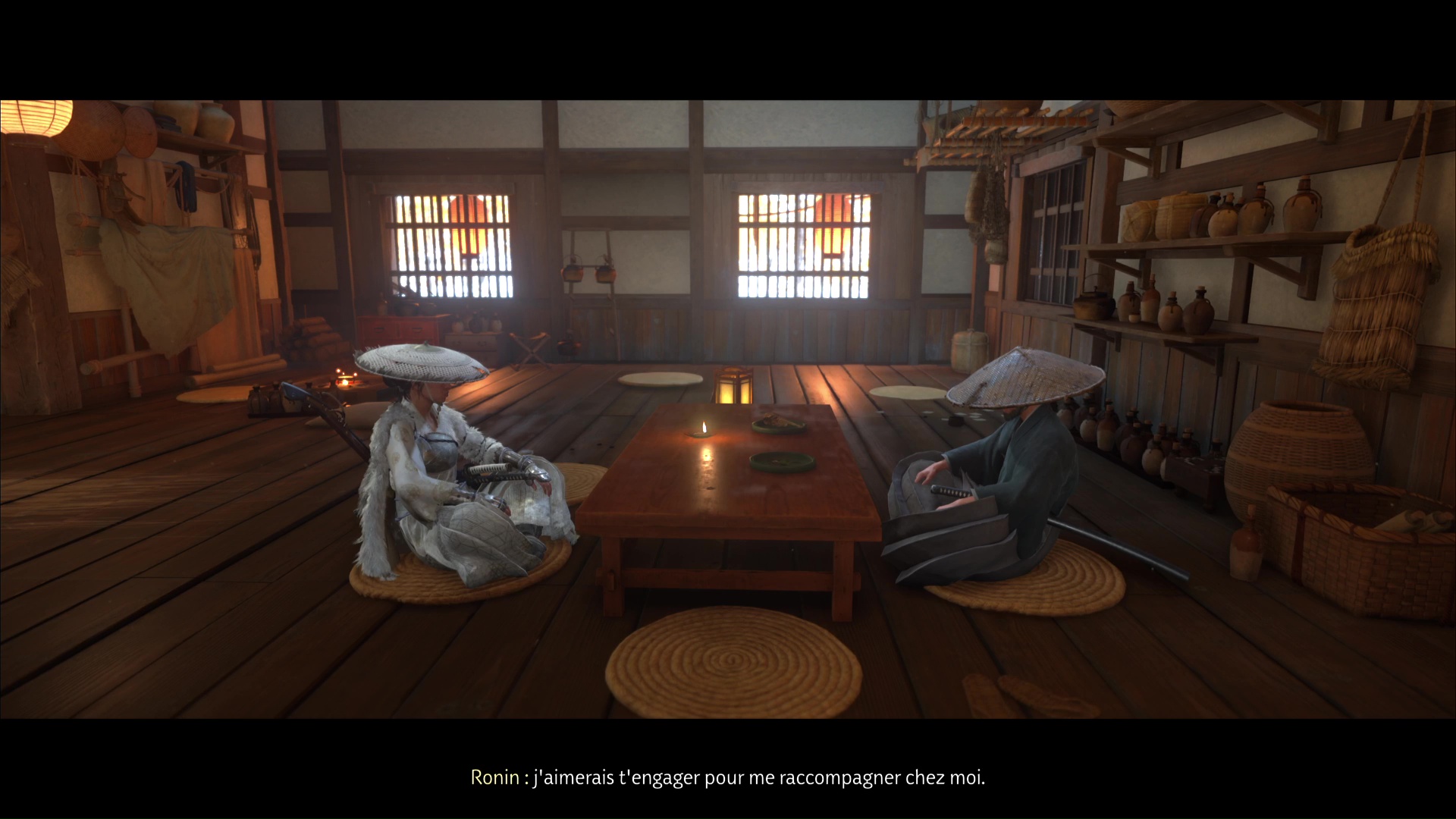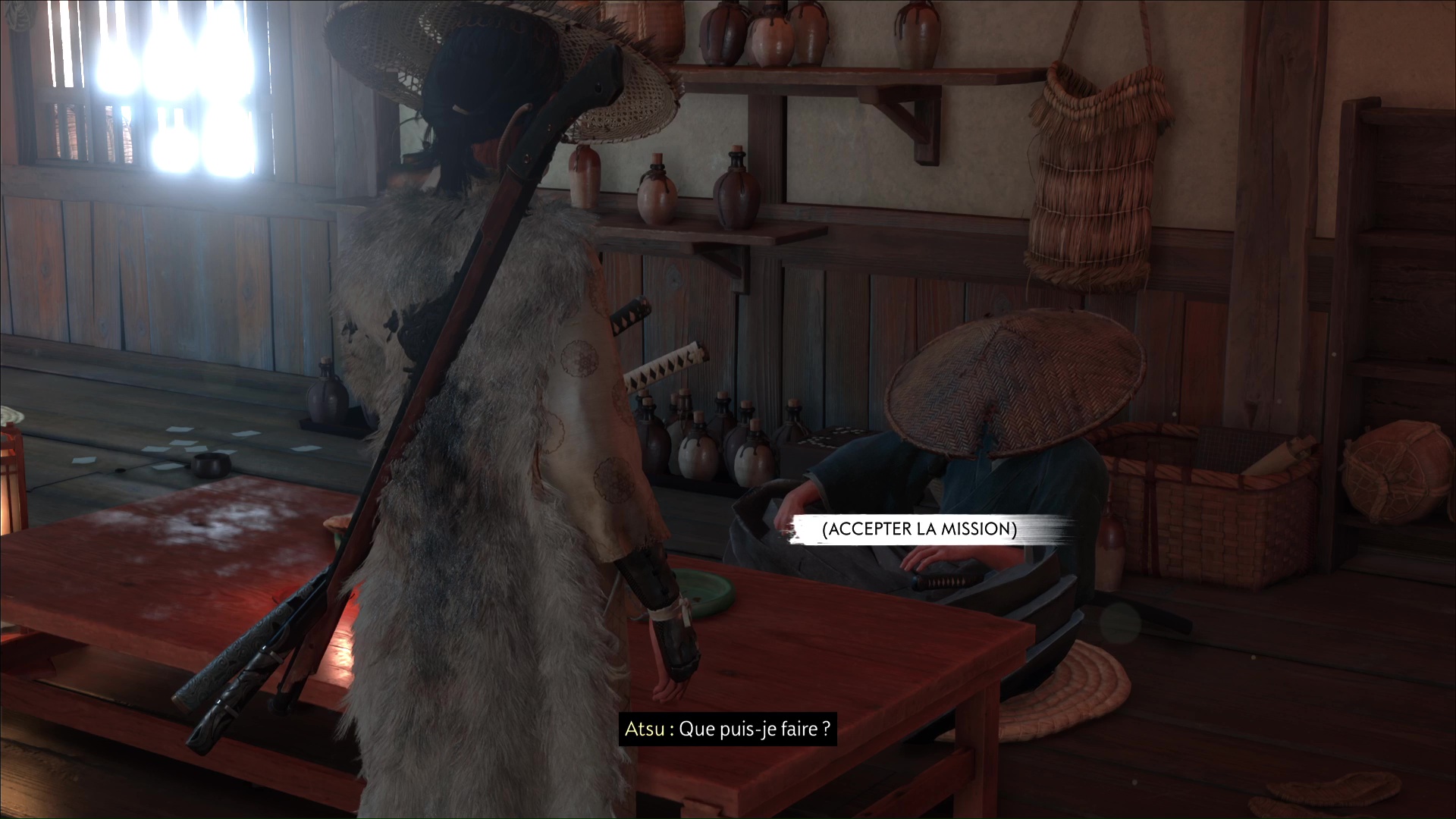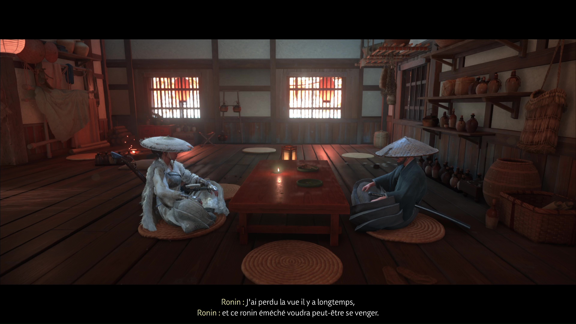 Approchez ensuite de l’autre ronin resté assis à table et adressez-lui la parole. Il vous parlera alors de son metsubushi, une poudre aveuglante qu’il a modifiée pour améliorer ses effets. Si vous l’aidez, il vous partagera son secret.