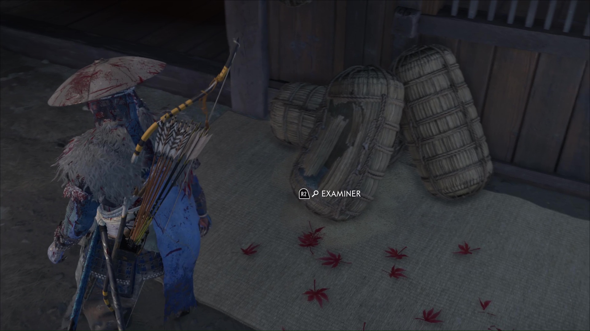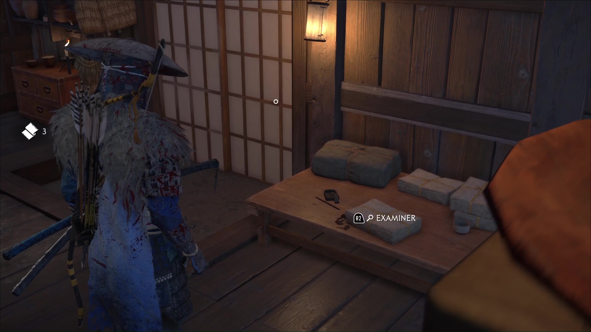 Repartez à cheval une fois le combat terminé, et terminez le trajet qui mène à la cabane de l’imposteur. Une fois sur place, entrez dans la cabane et fouillez les lieux. Examinez les paniers de riz et les feuilles rouges, puis allez au fond de la pièce pour jeter un œil aux mèches de lanterne.