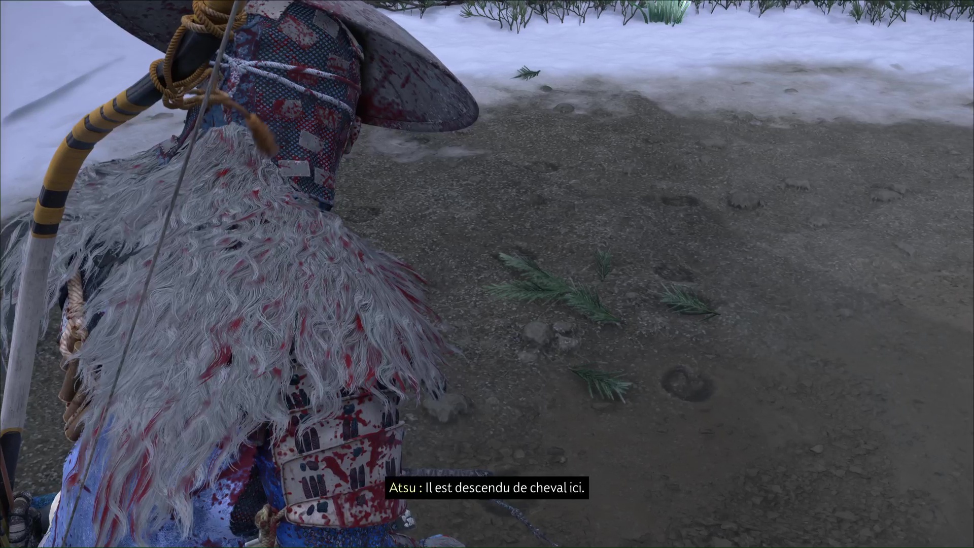 Jogen suggèrera ensuite de prendre la hauteur pour examiner la forêt à la recherche d’une piste. Posez le pied à terre et observez la forêt au point indiqué par Jogen. Regardez en direction du feu de camp, puis observez les herbes hautes et, finalement, les paniers de riz à gauche du camp.