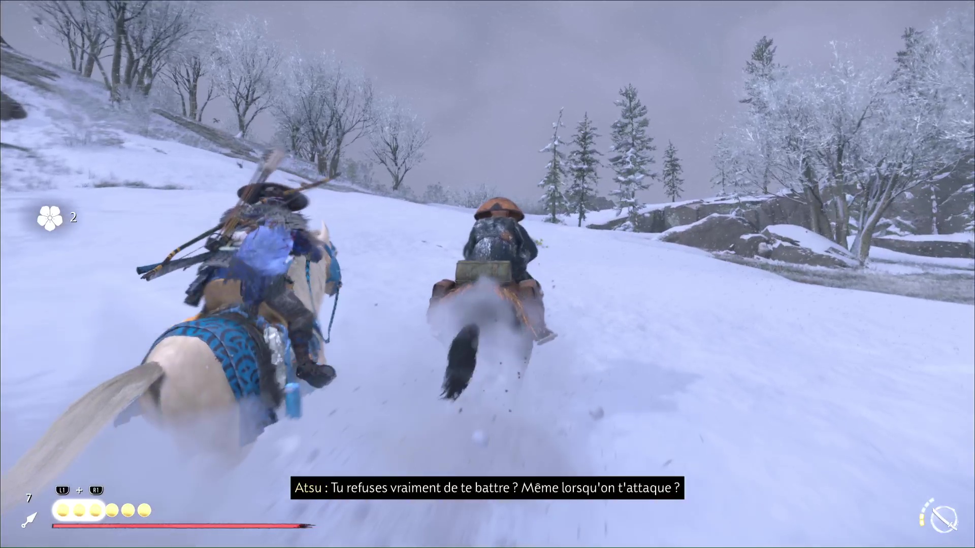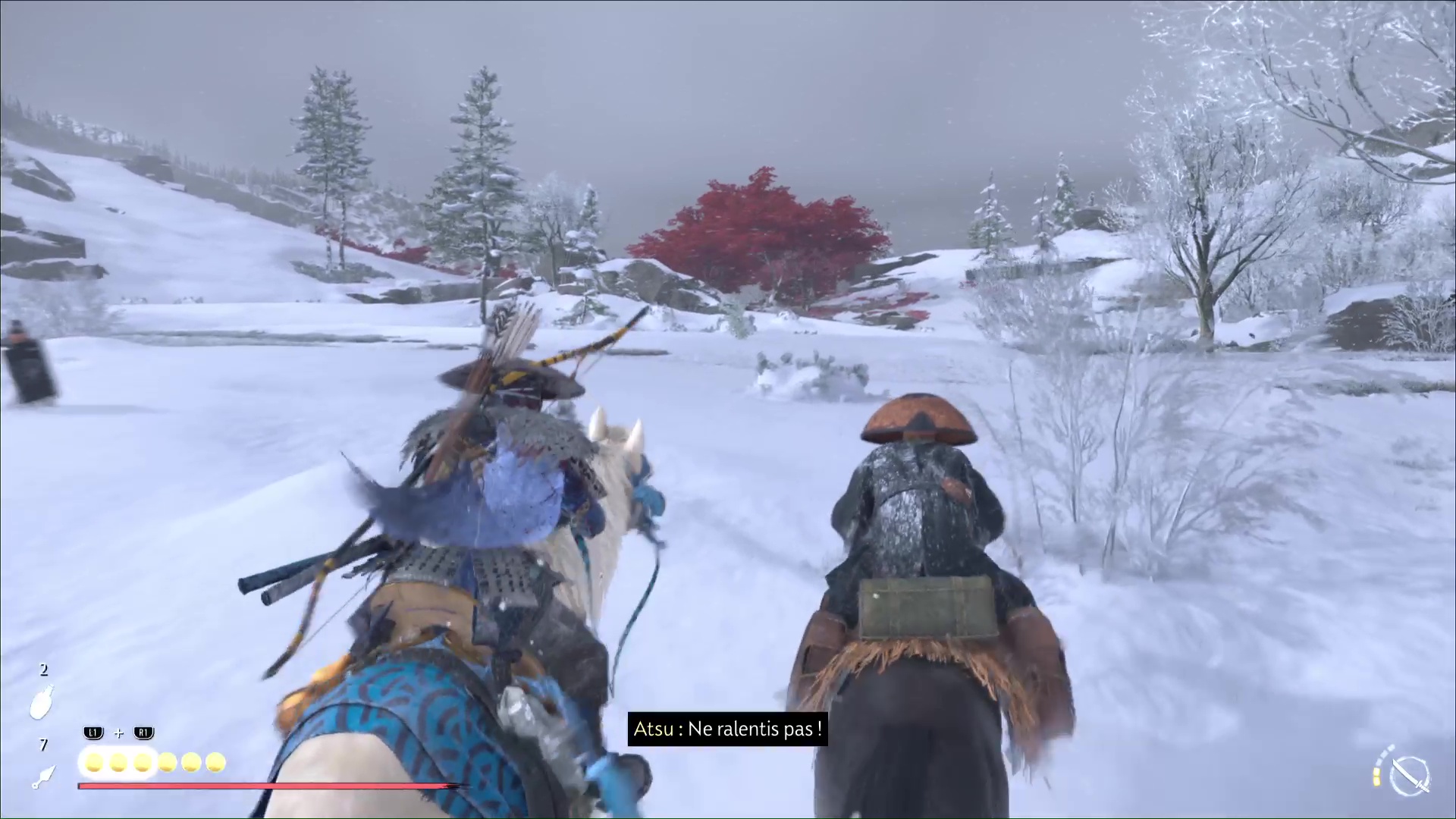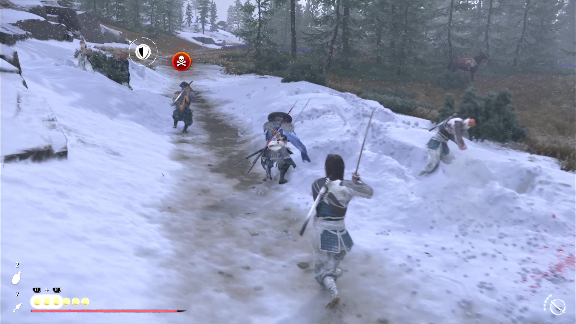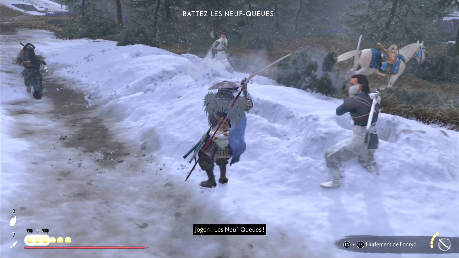 Hélas, après quelques instants, les Neuf-Queues vous tendent une embuscade. Descendez de cheval pour les tuer en veillant à ce que personne ne touche à Jogen. Si c’est le cas, une icône de tête de mort apparaîtra et il faudra tuer en priorité l’assaillant.