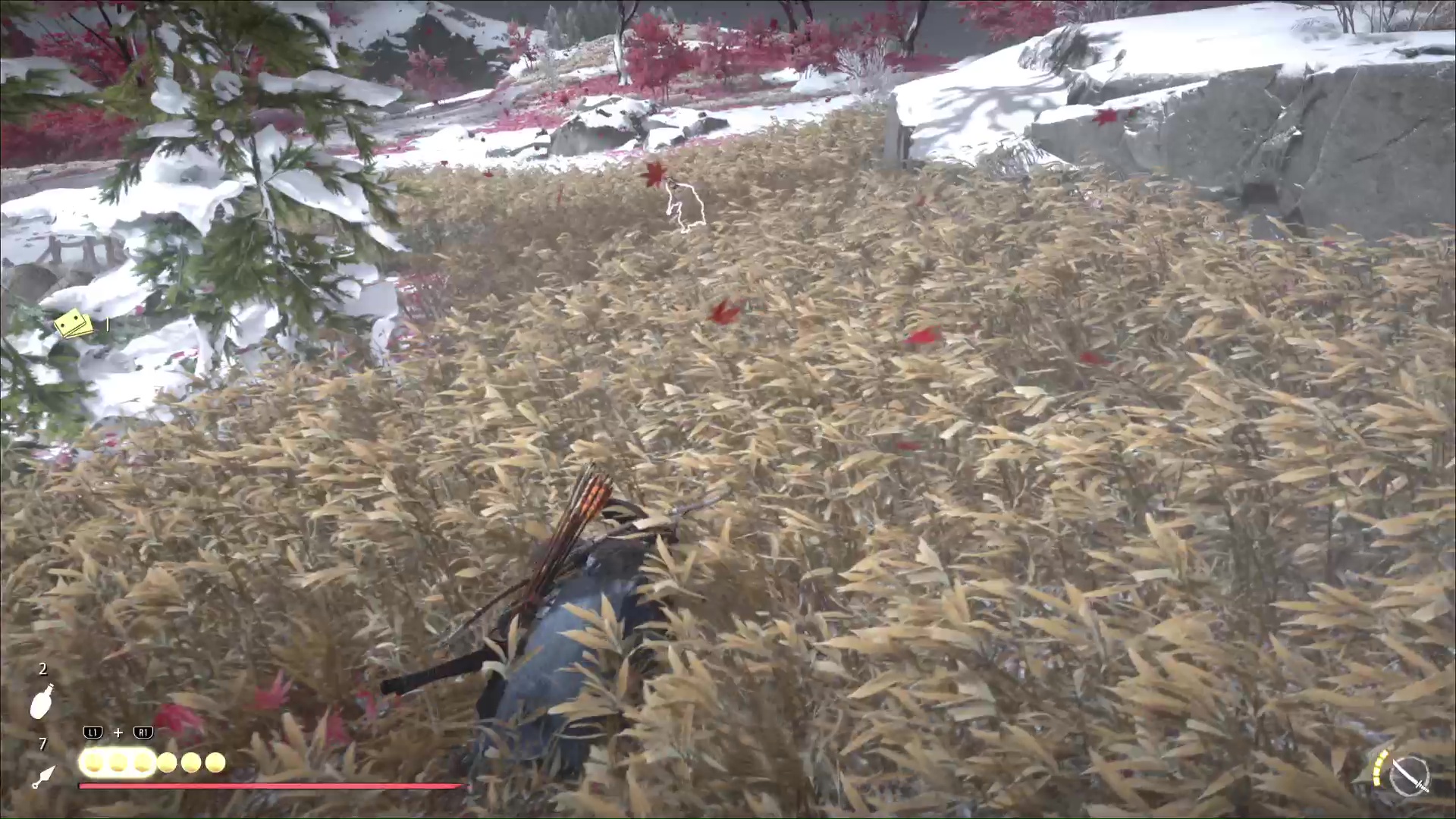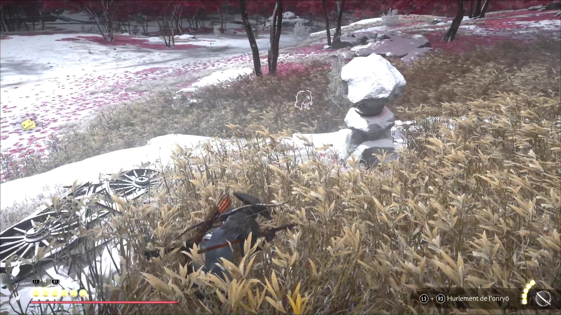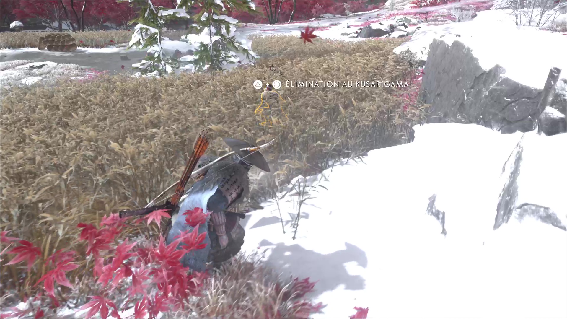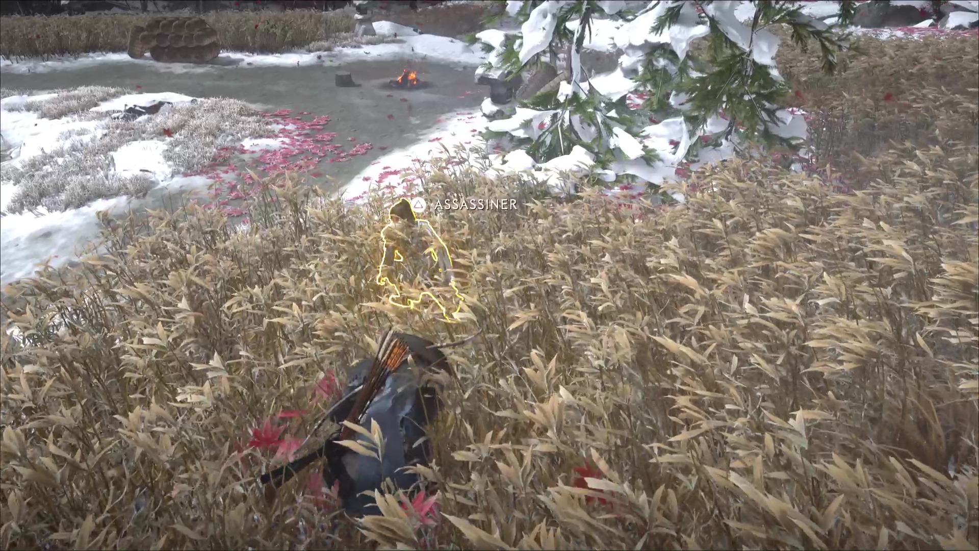 Descendez de là où vous êtes et dirigez-vous discrètement vers les hautes herbes. Avec de la prudence et de l’observation, vous pouvez même tuer en silence les Neuf-Queues cachés en embuscade dedans. Il y a trois Neuf-Queues dans les herbes à droite du camp, et deux à gauche.