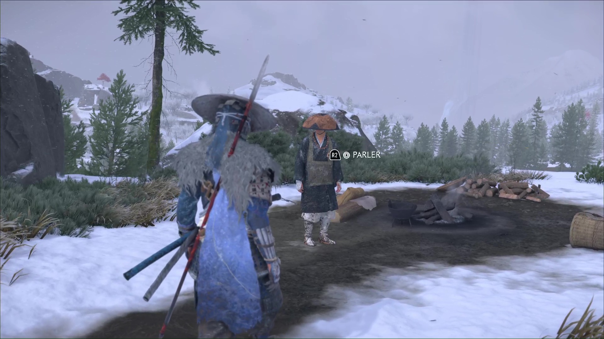 Pour démarrer ce récit, rendez-vous vers le centre de la région de la Crête de Teshio, au nord-est de l’Auberge de la Grue rouge, et juste à côté des Bambous d’entraînement de Sakuru. Un homme est assis à un feu de camp.