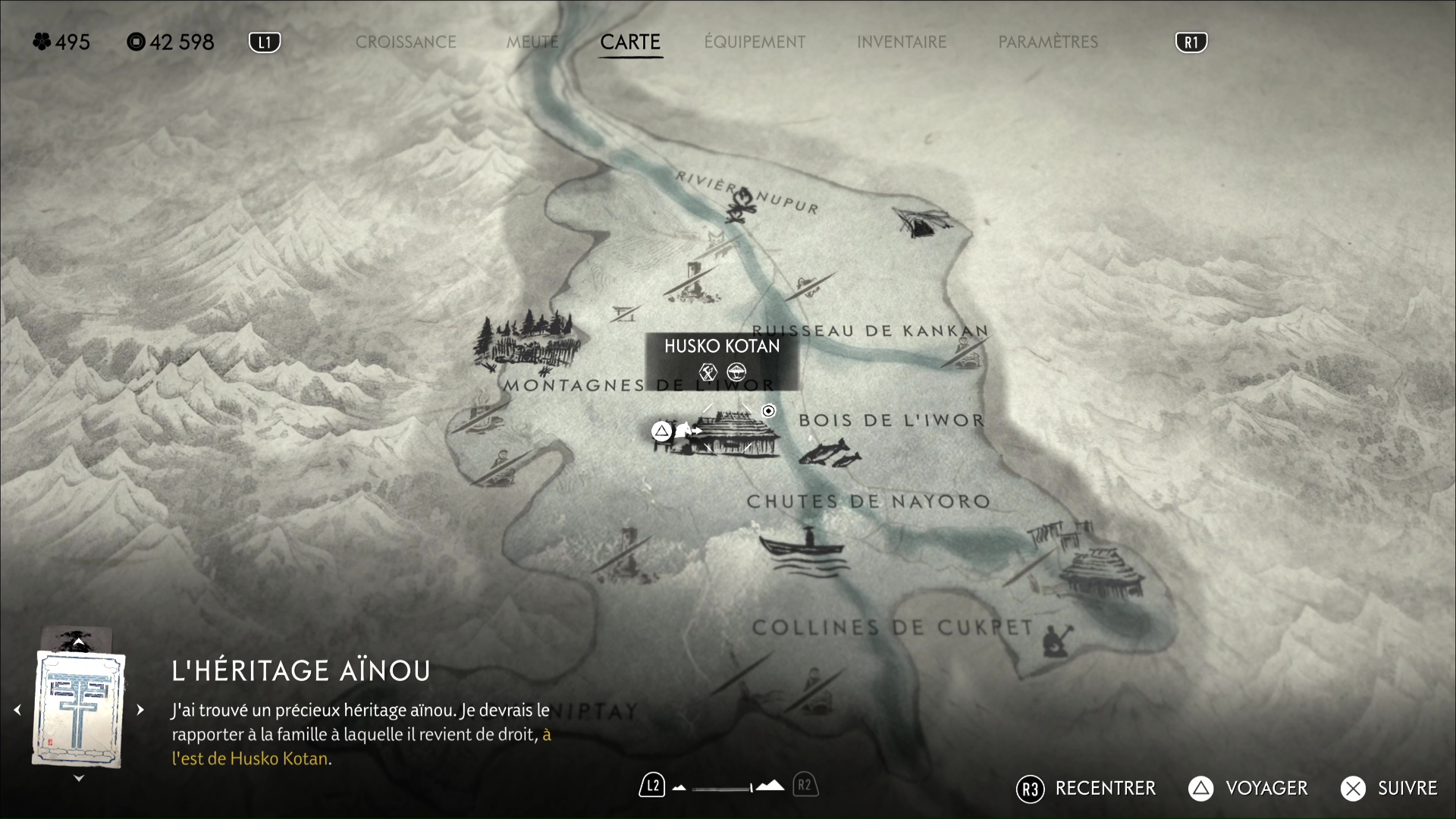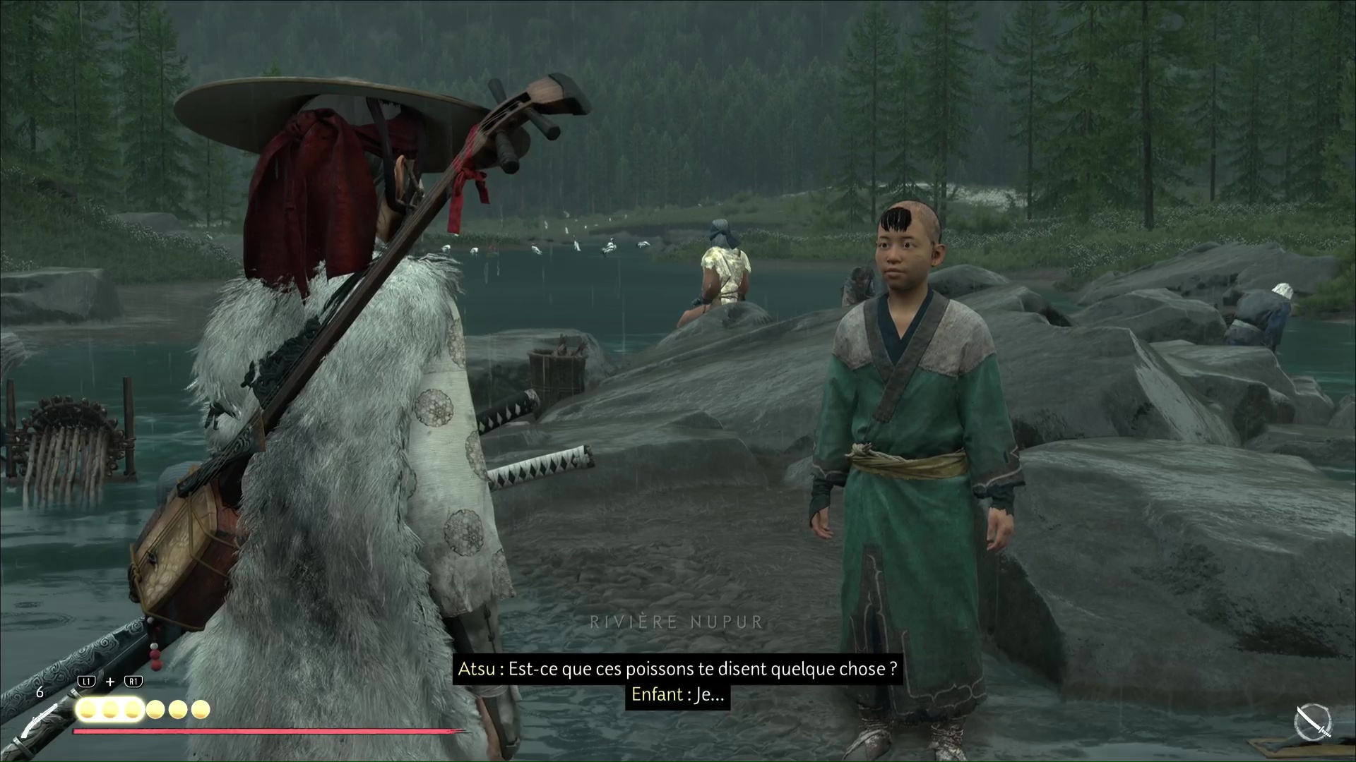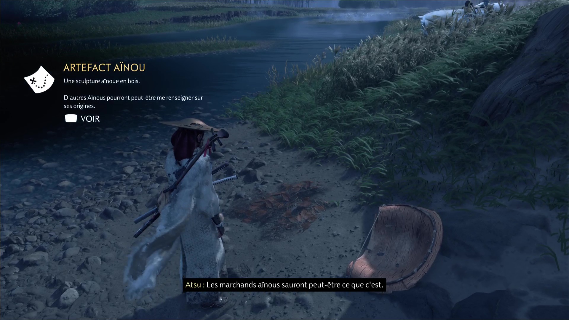Au nord-est des Prairies de Yōtei, vous pourrez rejoindre la Rivière Nupur. Au niveau de l’inscription de cette zone sur la map, vous tomberez sur un petit campement, sous un grand arbre. Ici, examinez le tas de feuilles près de l’eau. Vous obtiendrez ainsi l’ikupasuy, un artefact aïnou. Atsu se demande si les aïnous pourraient lui en dire davantage à son sujet.
