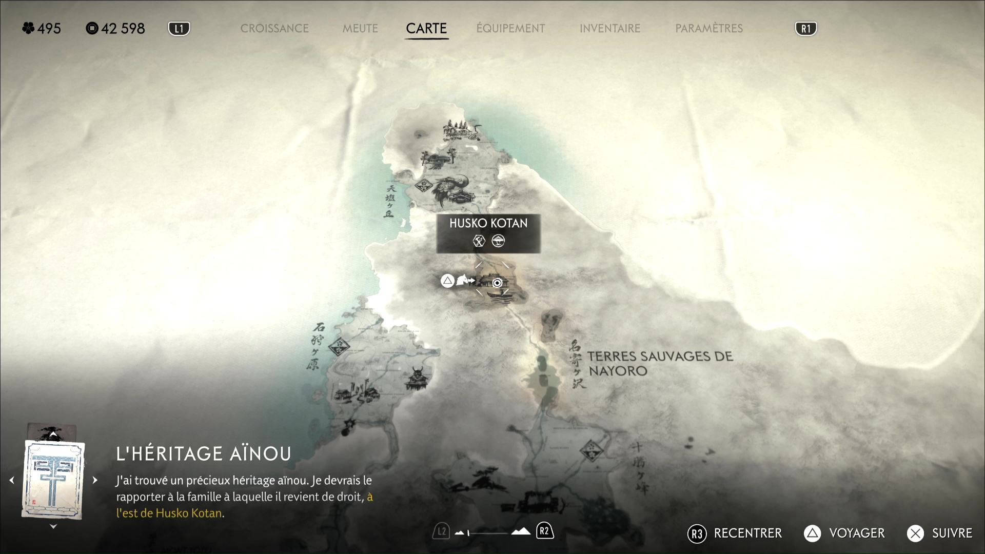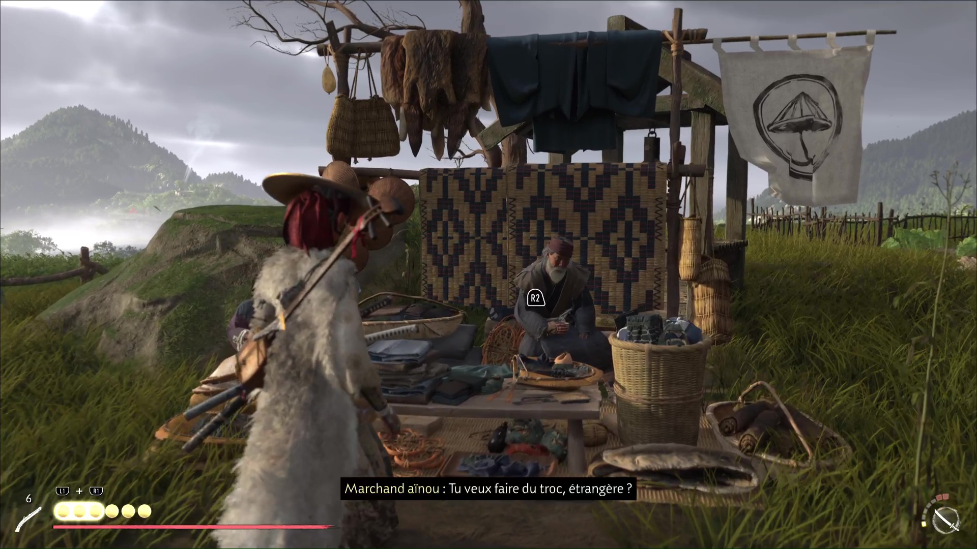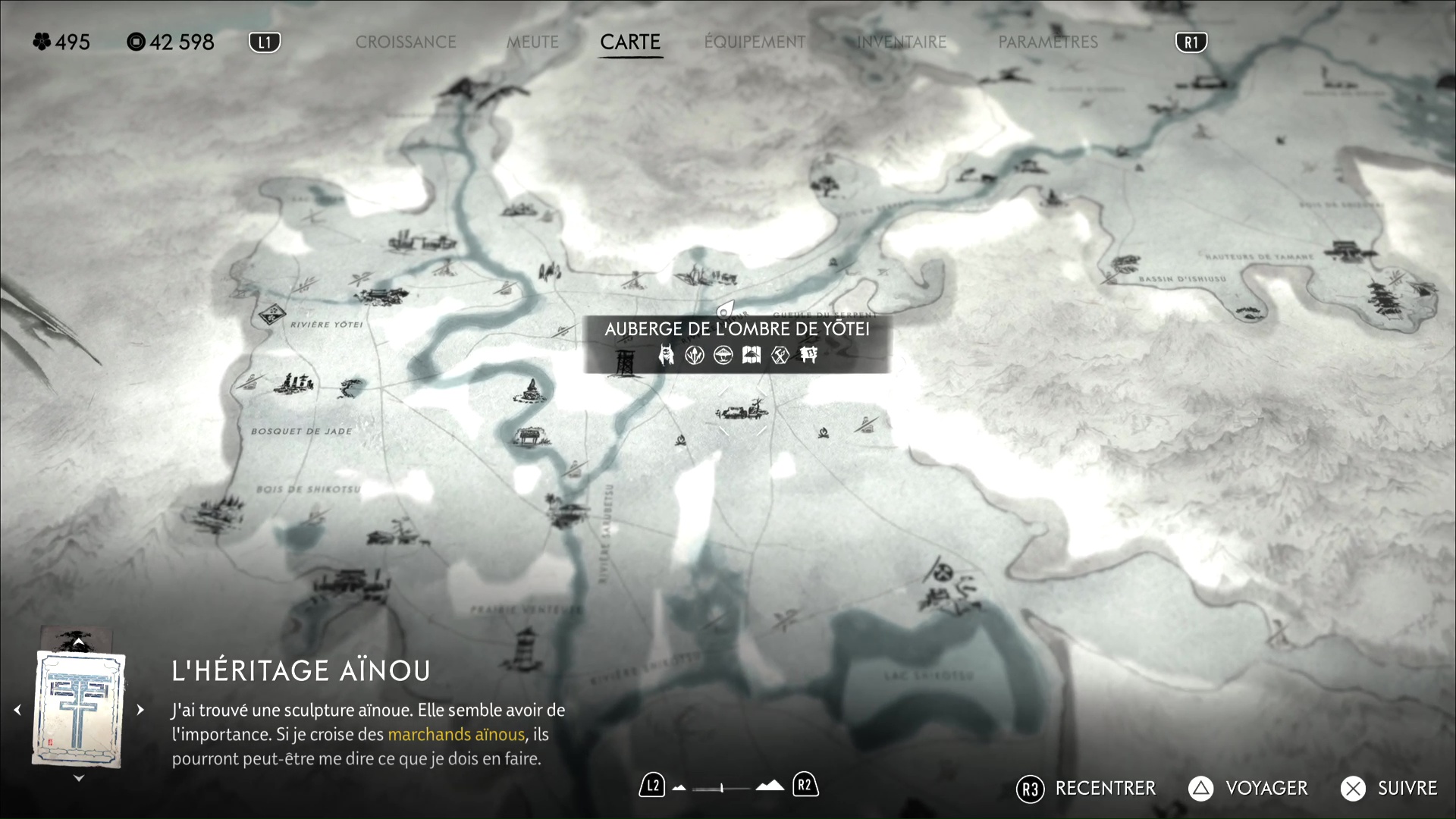 Au nord-est des Prairies de Yōtei, vous pourrez rejoindre la Rivière Nupur. Au niveau de l’inscription de cette zone sur la map, vous tomberez sur un petit campement, sous un grand arbre. Ici, examinez le tas de feuilles près de l’eau. Vous obtiendrez ainsi l’ikupasuy, un artefact aïnou. Atsu se demande si les aïnous pourraient lui en dire davantage à son sujet.