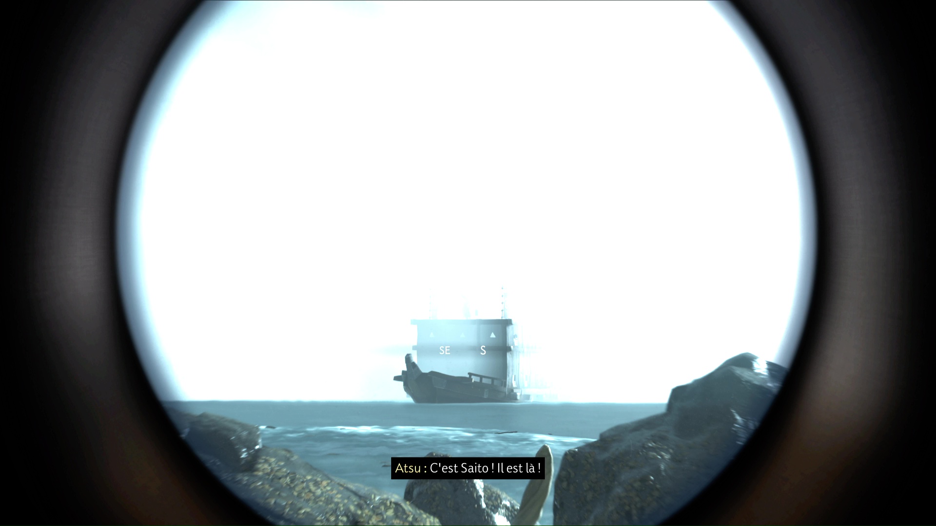 Vous finissez par arriver sur la plage. L’Araignée finit ligoté et Jubei et Atsu guettent l’arrivée de la flotte. Sortez la longue-vue et observez le bateau qui se dirige vers vous. Puis, jetez également un œil à l’autre bateau sur la gauche. Étonnamment, il est vide. Encore pire, un autre bateau, sur la gauche, est mené par Saito lui-même.