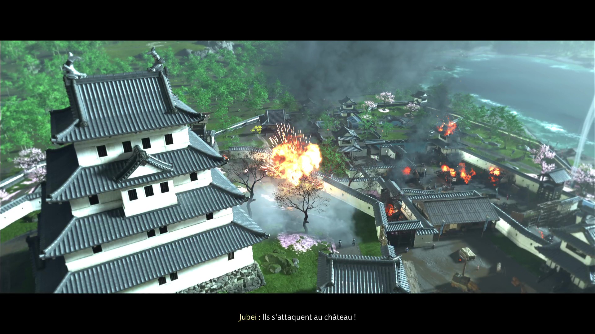 Dès que la cour est nettoyée, ouvrez la porte de la forteresse. Le château est complètement en proie aux flammes. Atsu est alors désespérée de ne voir ni Oyuki, ni Jubei, ni Kiku dans les parages.