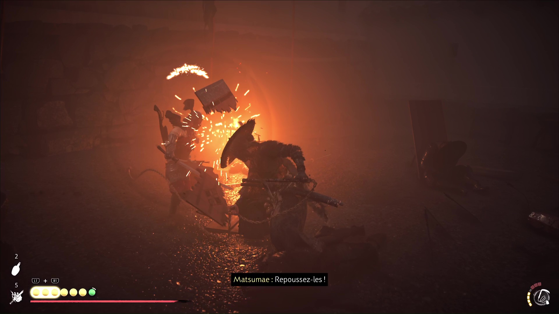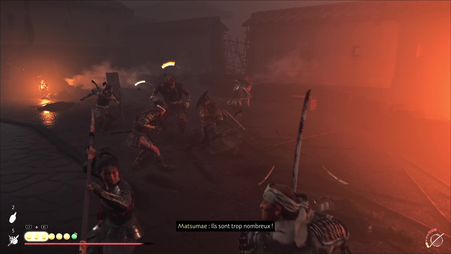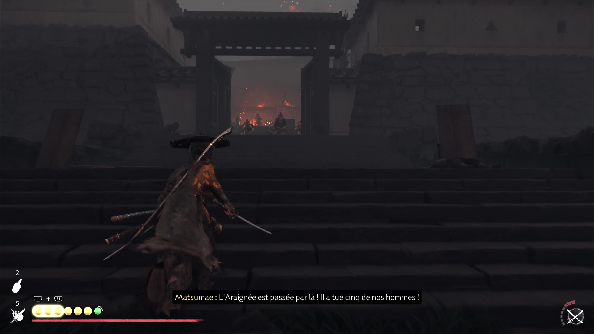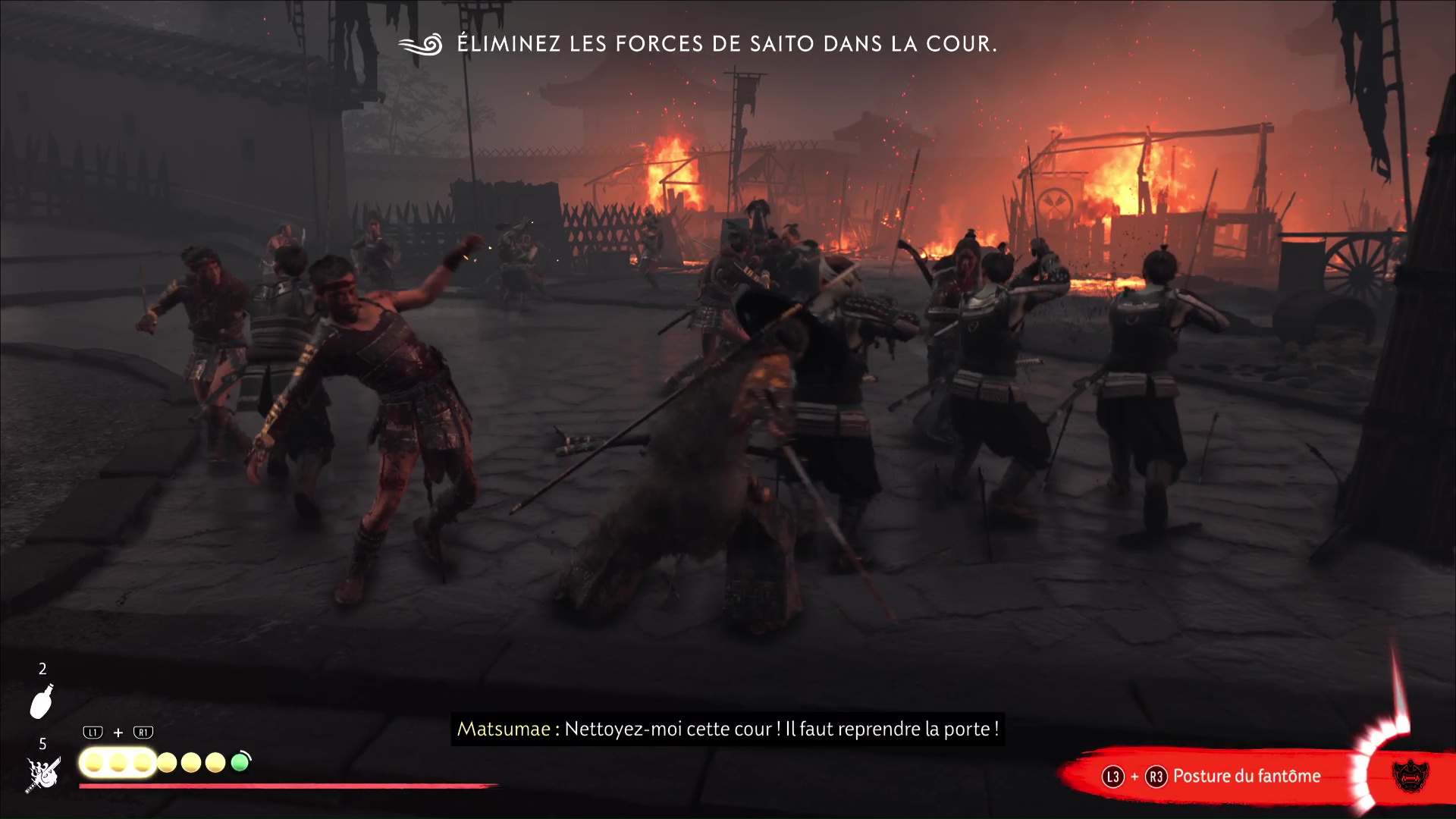 Vous finirez par atteindre la cour, et là le combat est obligatoire. N’oubliez pas votre posture du fantôme, si vous avez la jauge remplie, et profitez du fait que d’autres Matsumae combattent à vos côtés.