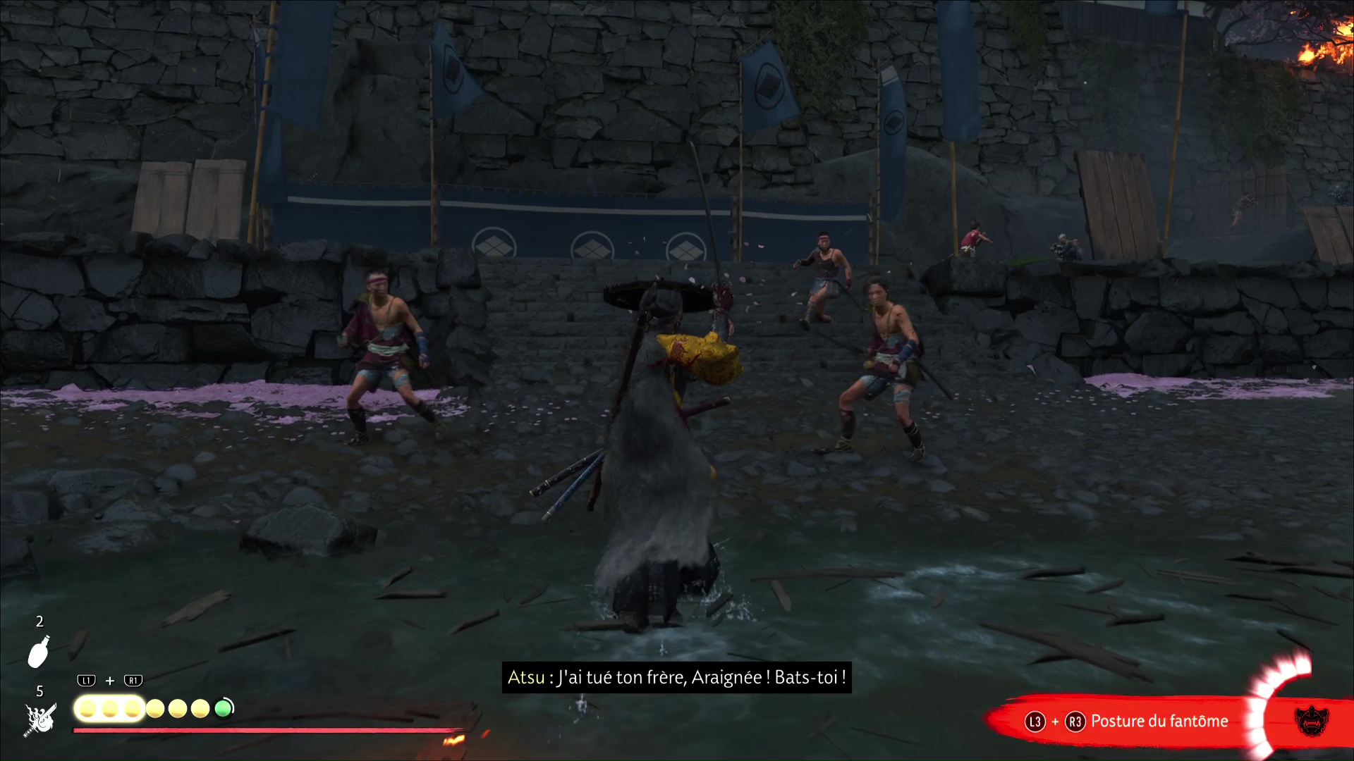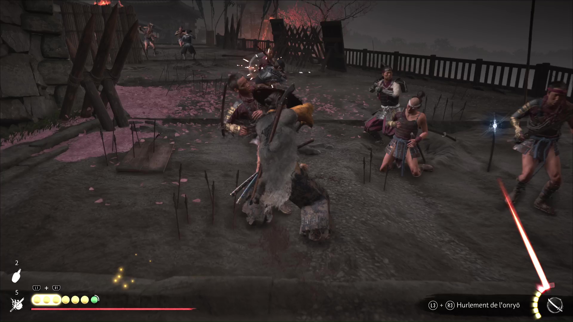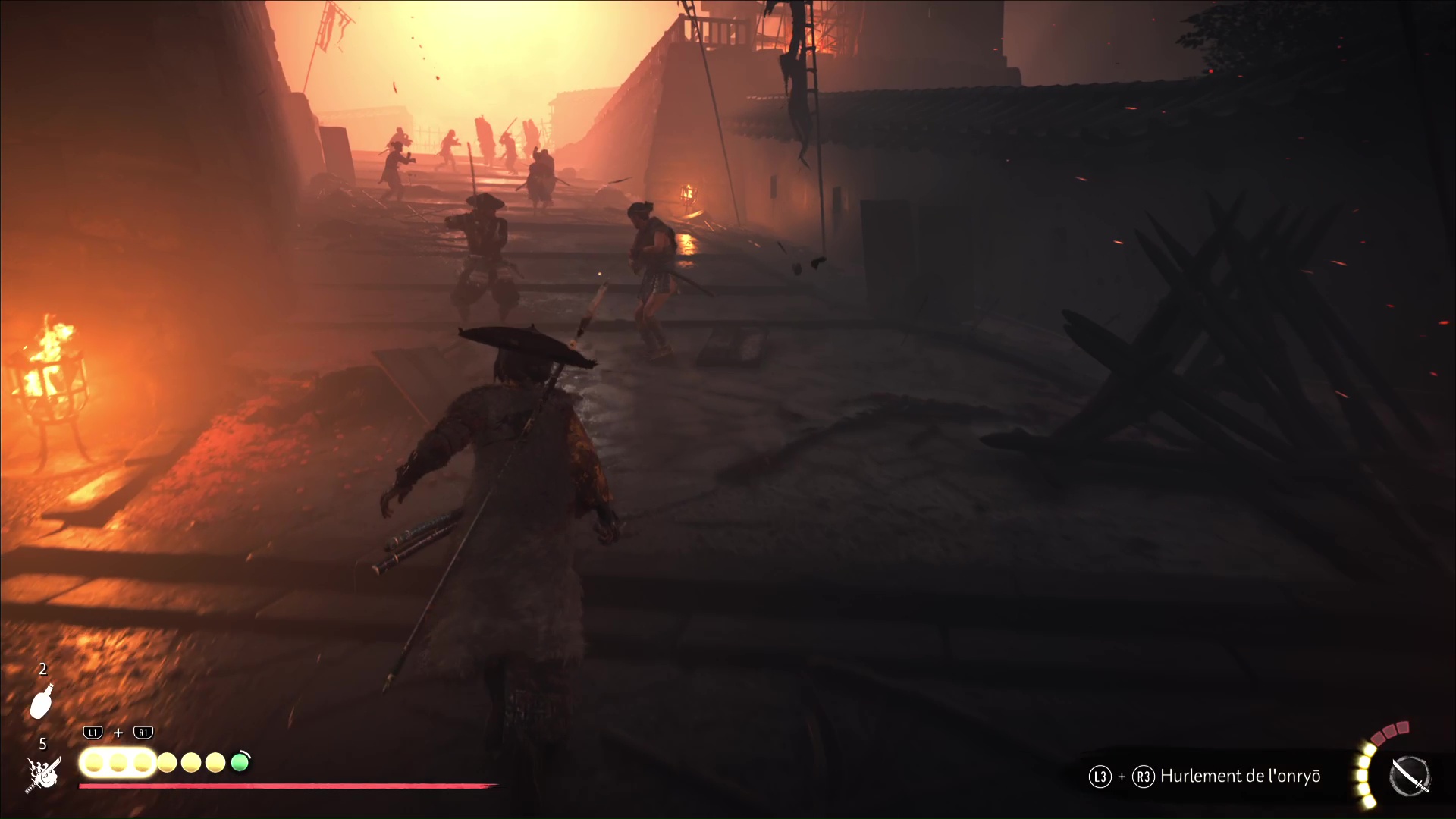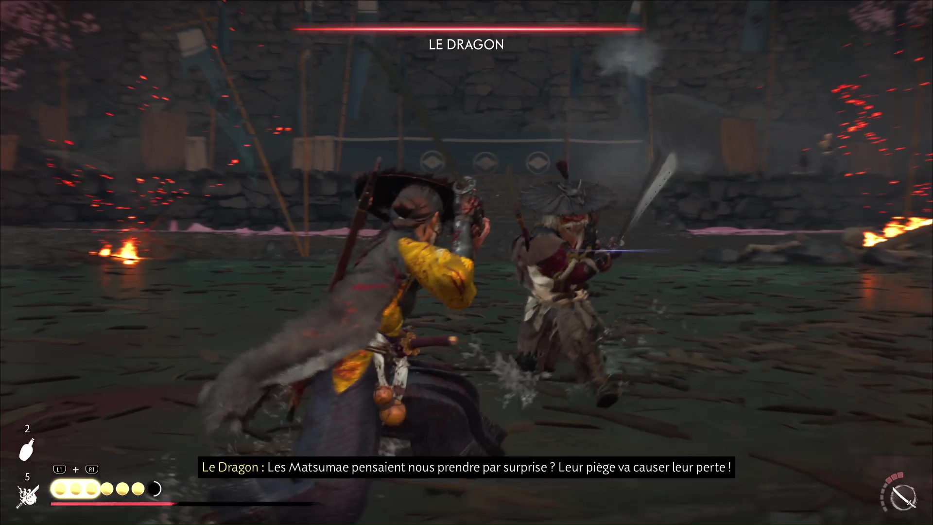 Vous finirez par atteindre la cour, et là le combat est obligatoire. N’oubliez pas votre posture du fantôme, si vous avez la jauge remplie, et profitez du fait que d’autres Matsumae combattent à vos côtés.