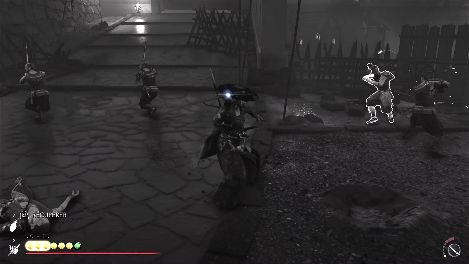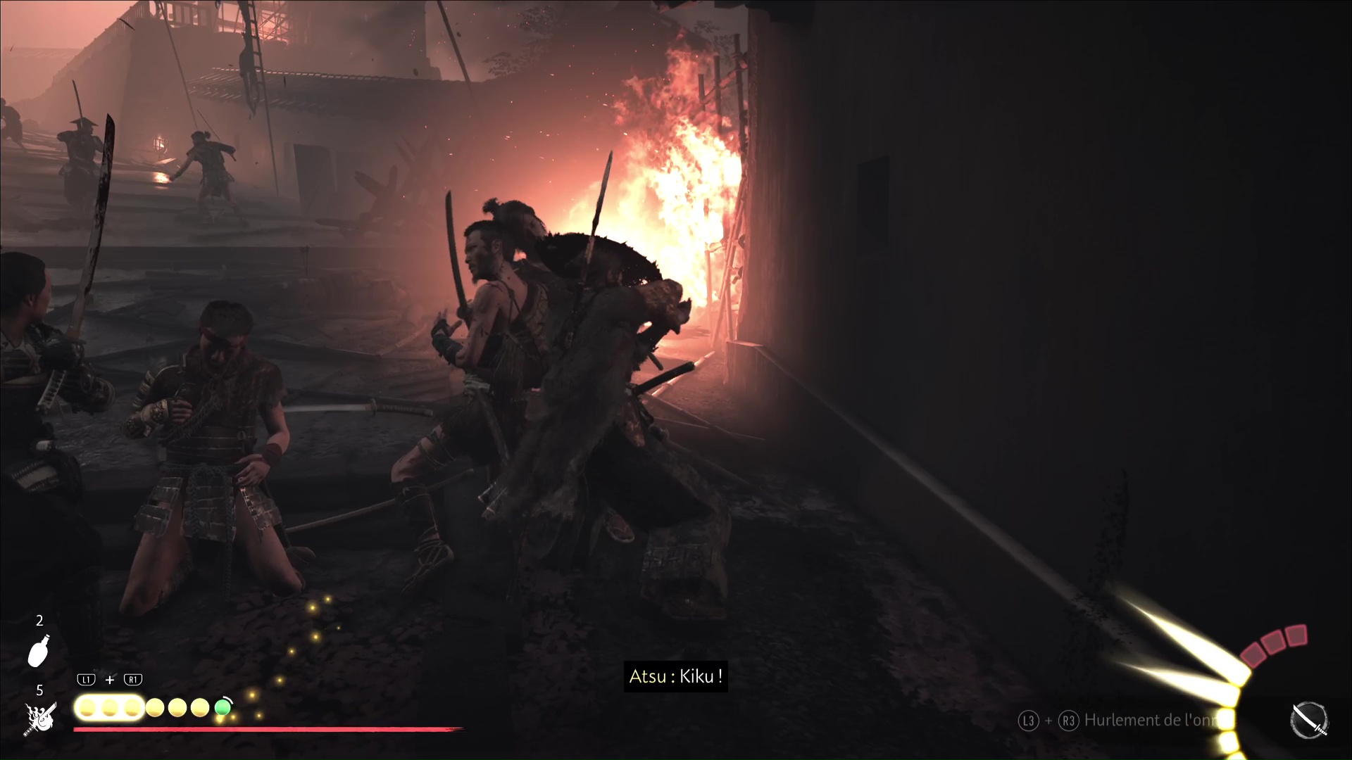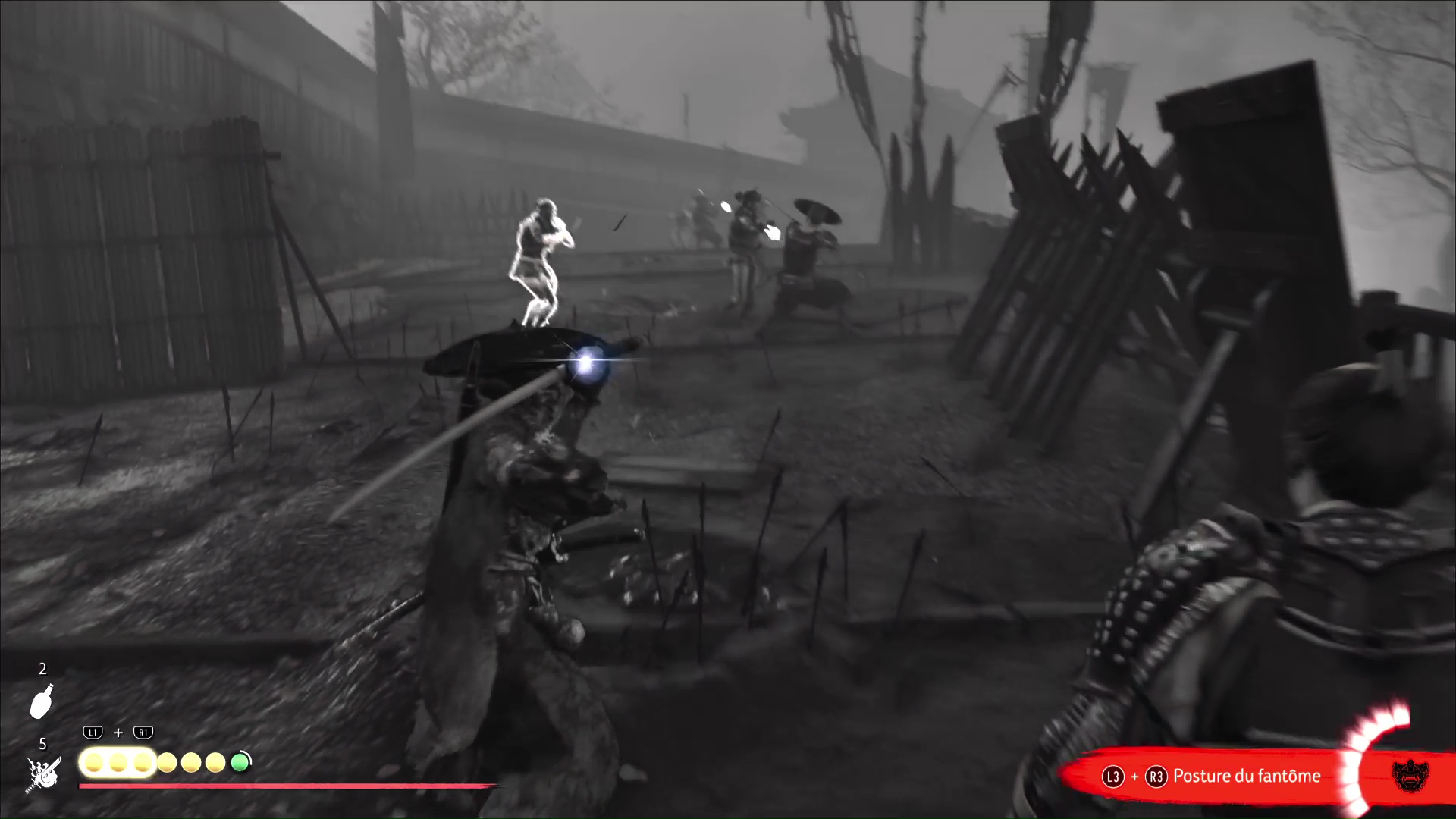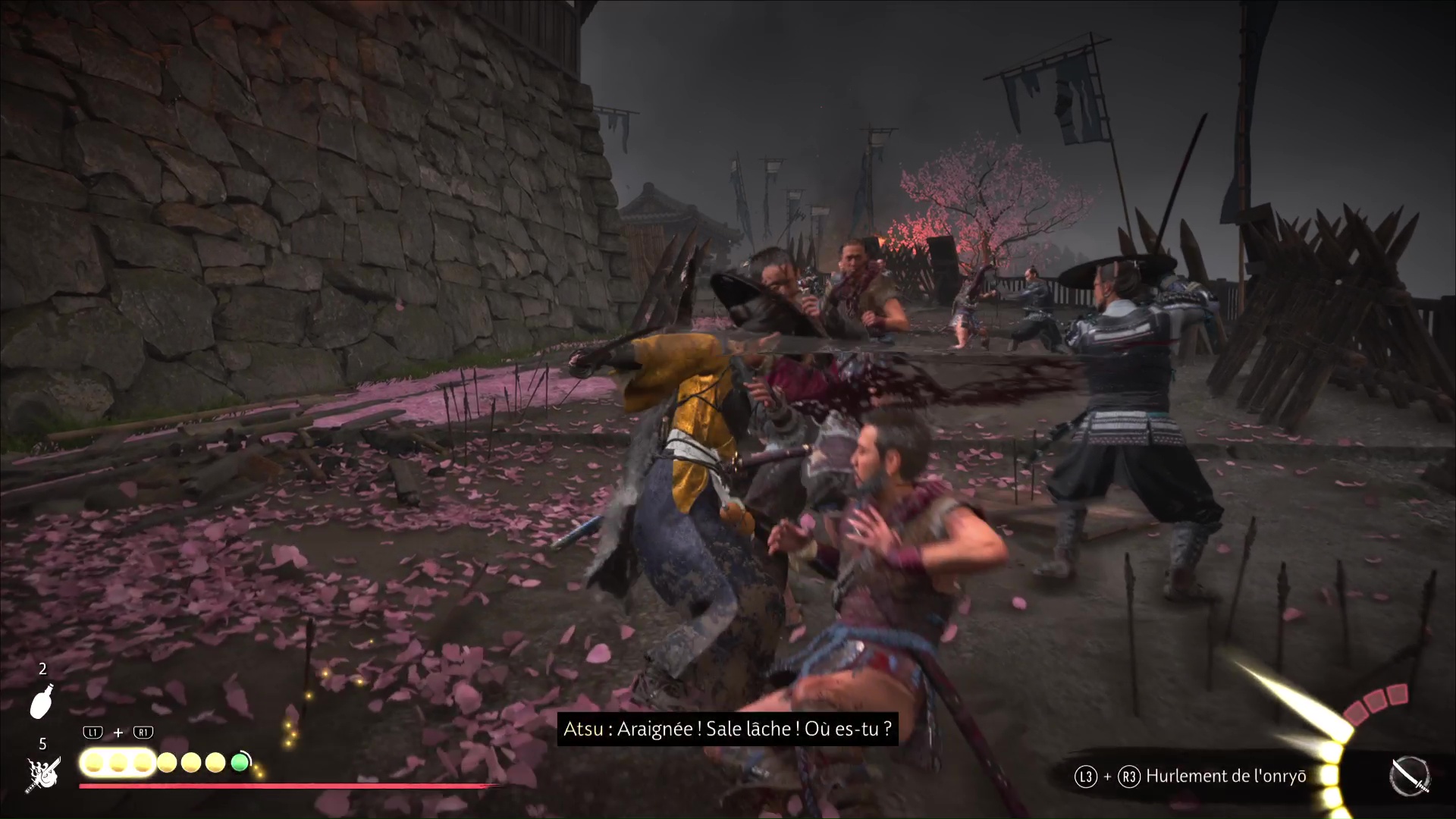 Vous finirez par atteindre la cour, et là le combat est obligatoire. N’oubliez pas votre posture du fantôme, si vous avez la jauge remplie, et profitez du fait que d’autres Matsumae combattent à vos côtés.