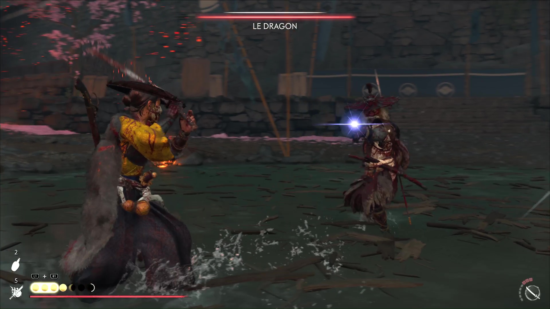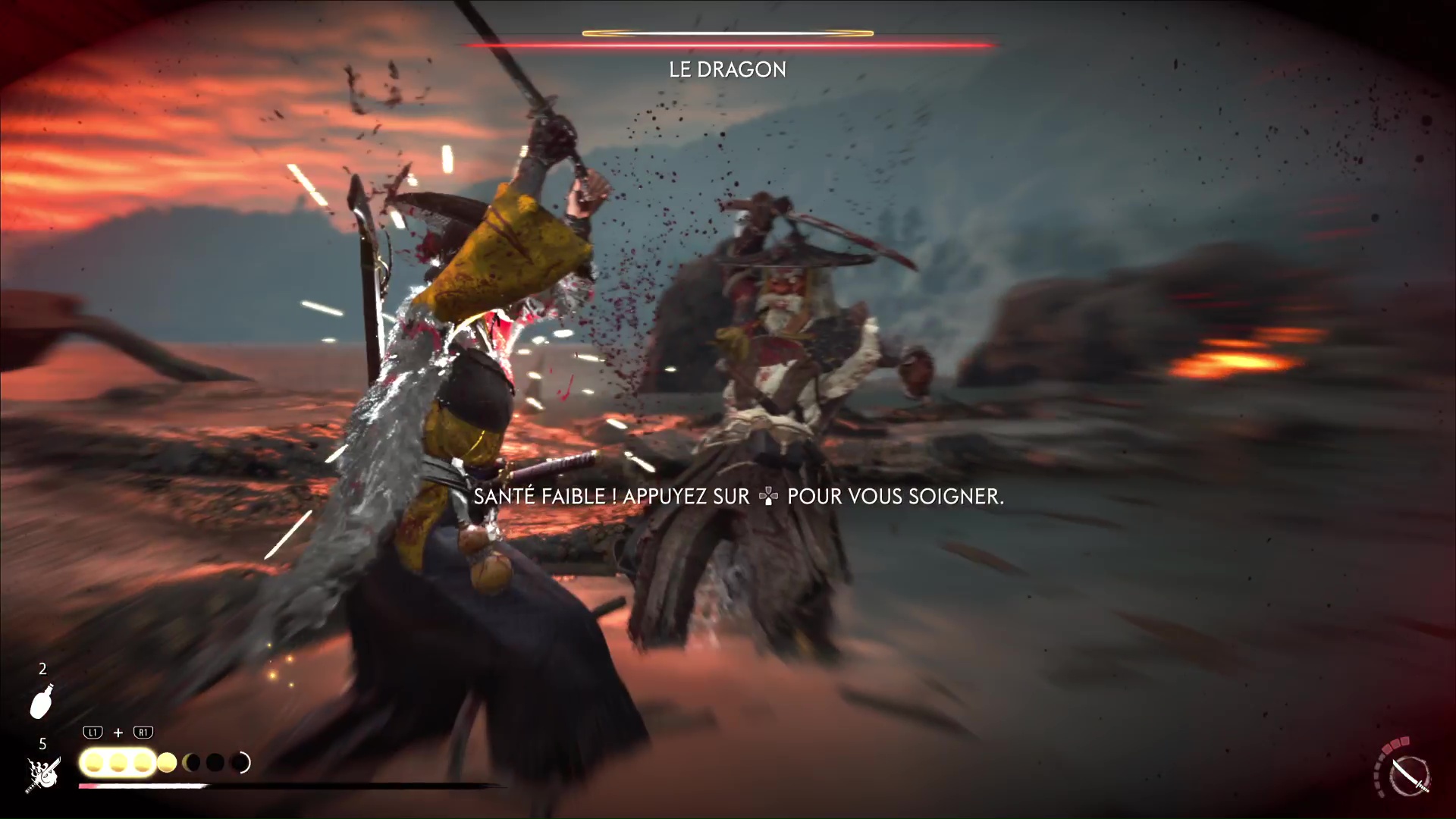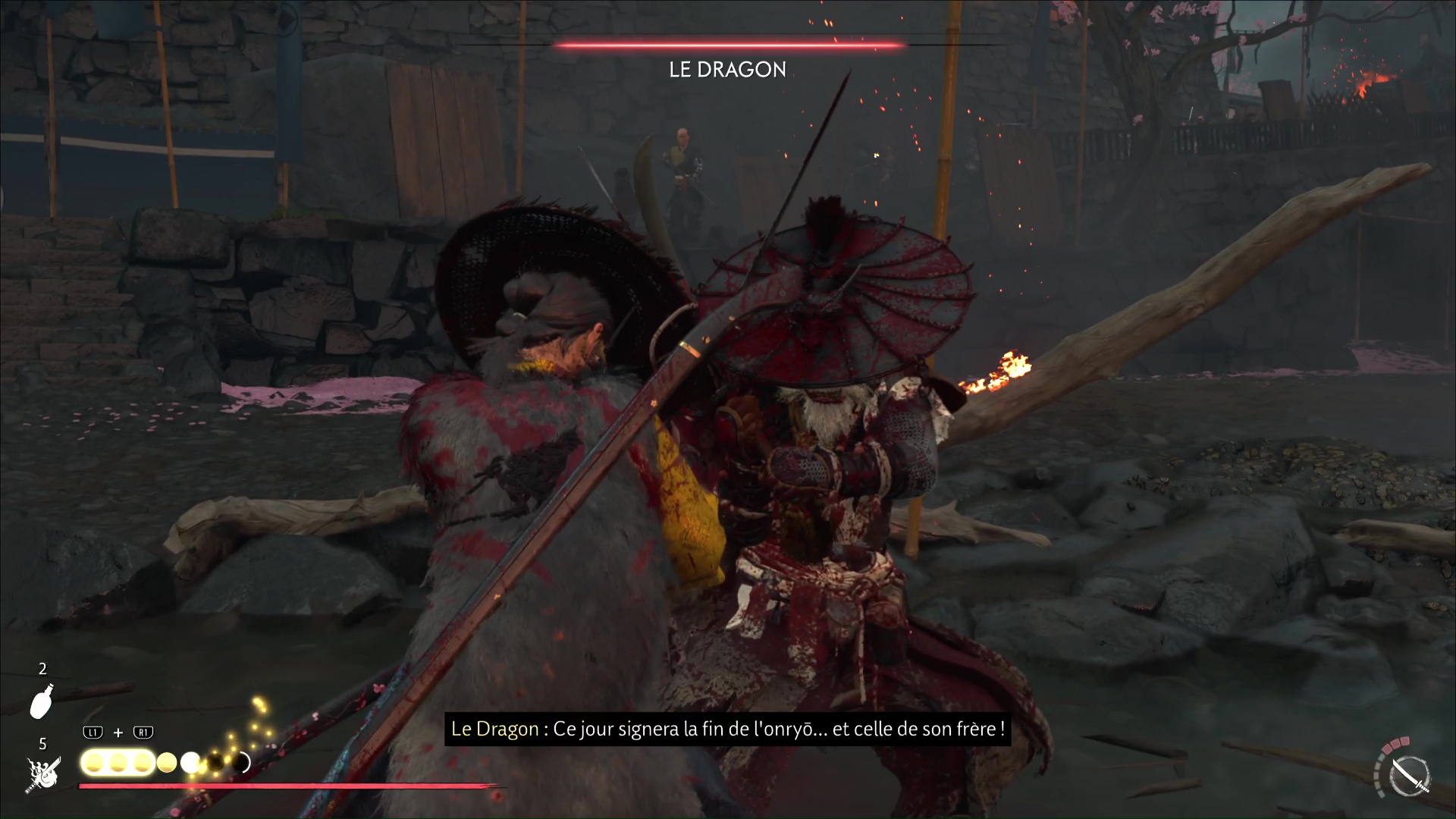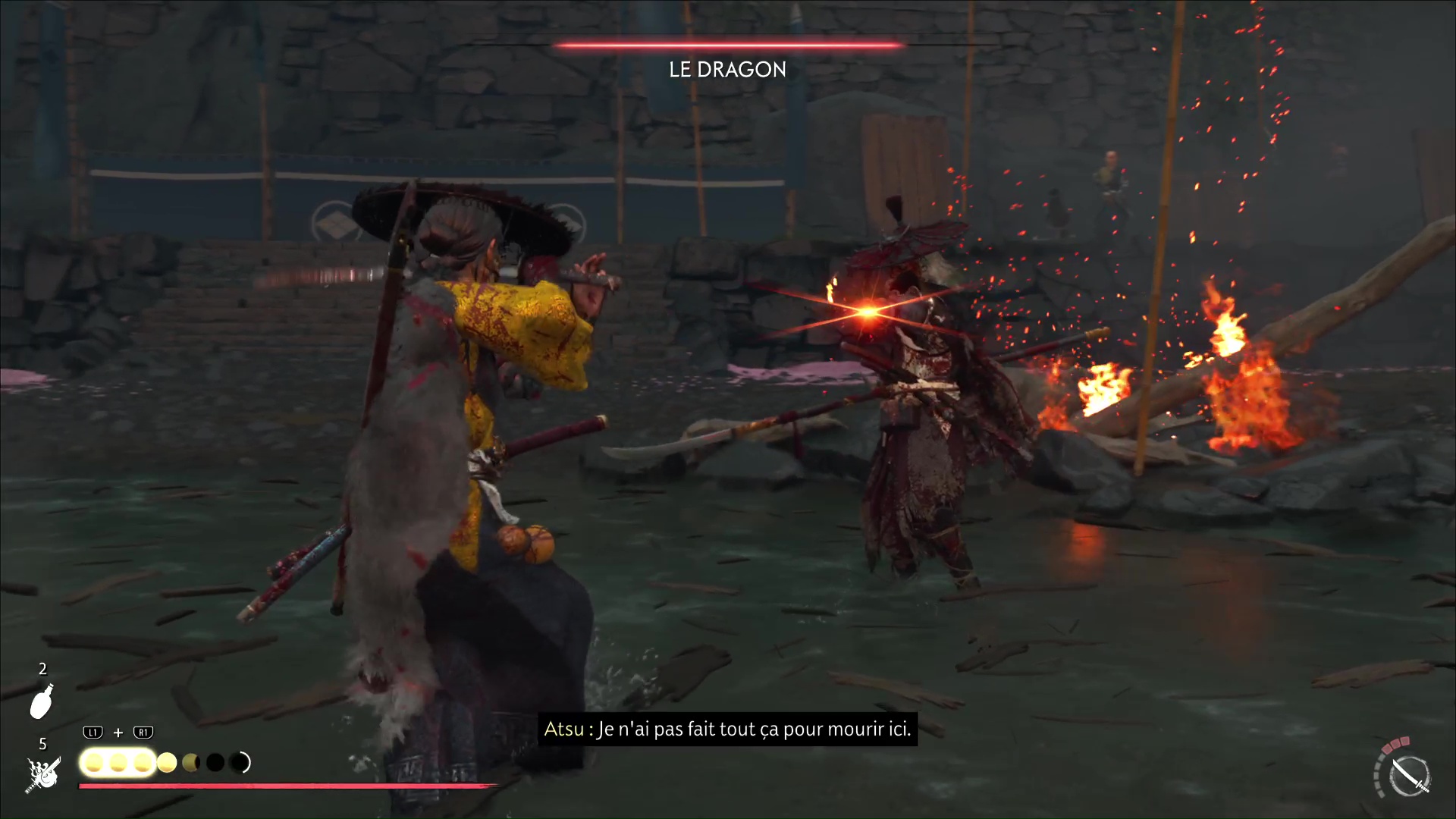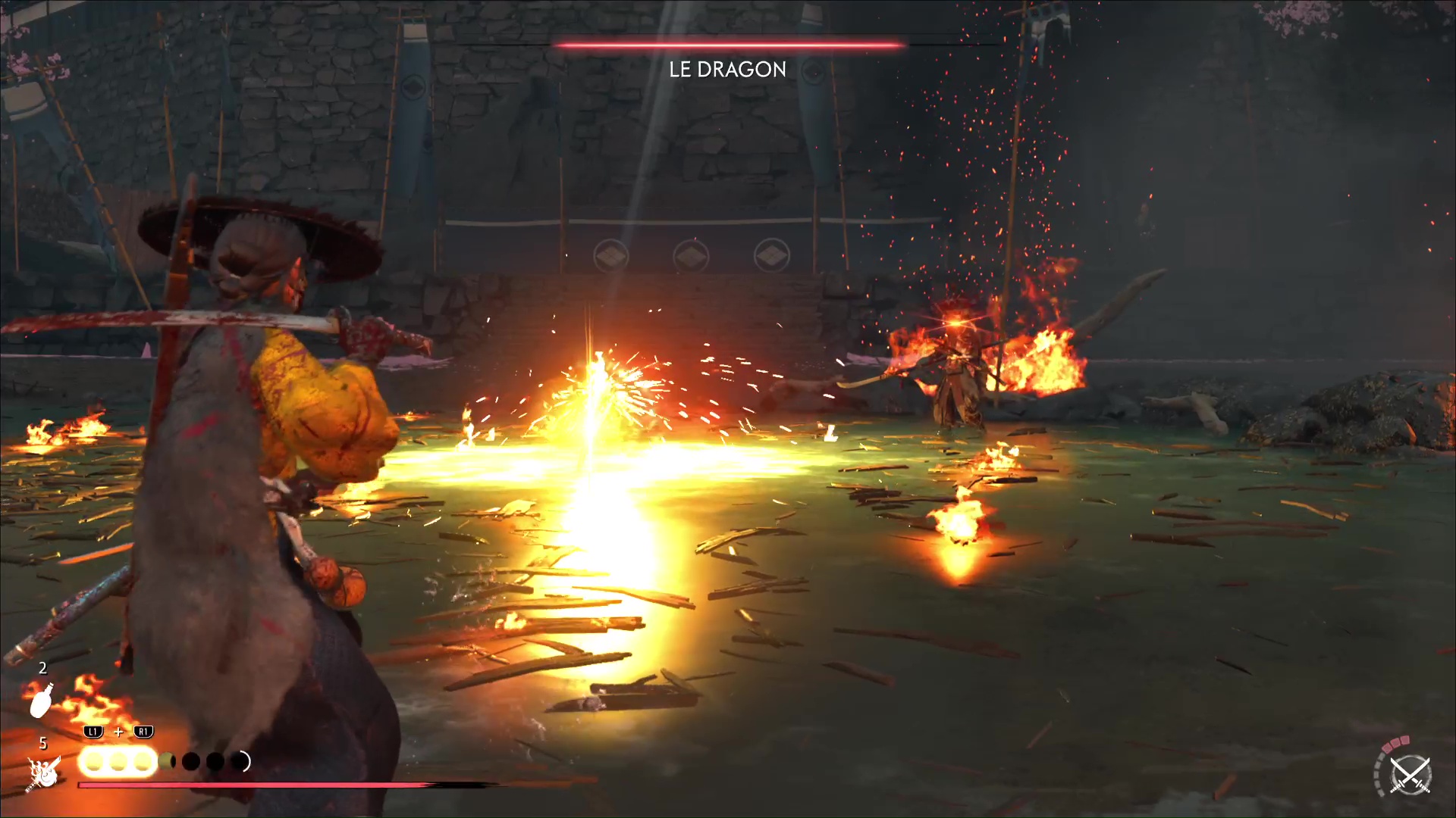 À un moment, le Dragon rangera son sabre pour sortir une lance. De plus, il commencera à utiliser lui aussi une arme à feu, symbolisé par une lumière rouge. Sortez vos doubles katanas et faites attention aux nouvelles attaques bleues que le Dragon lancera.