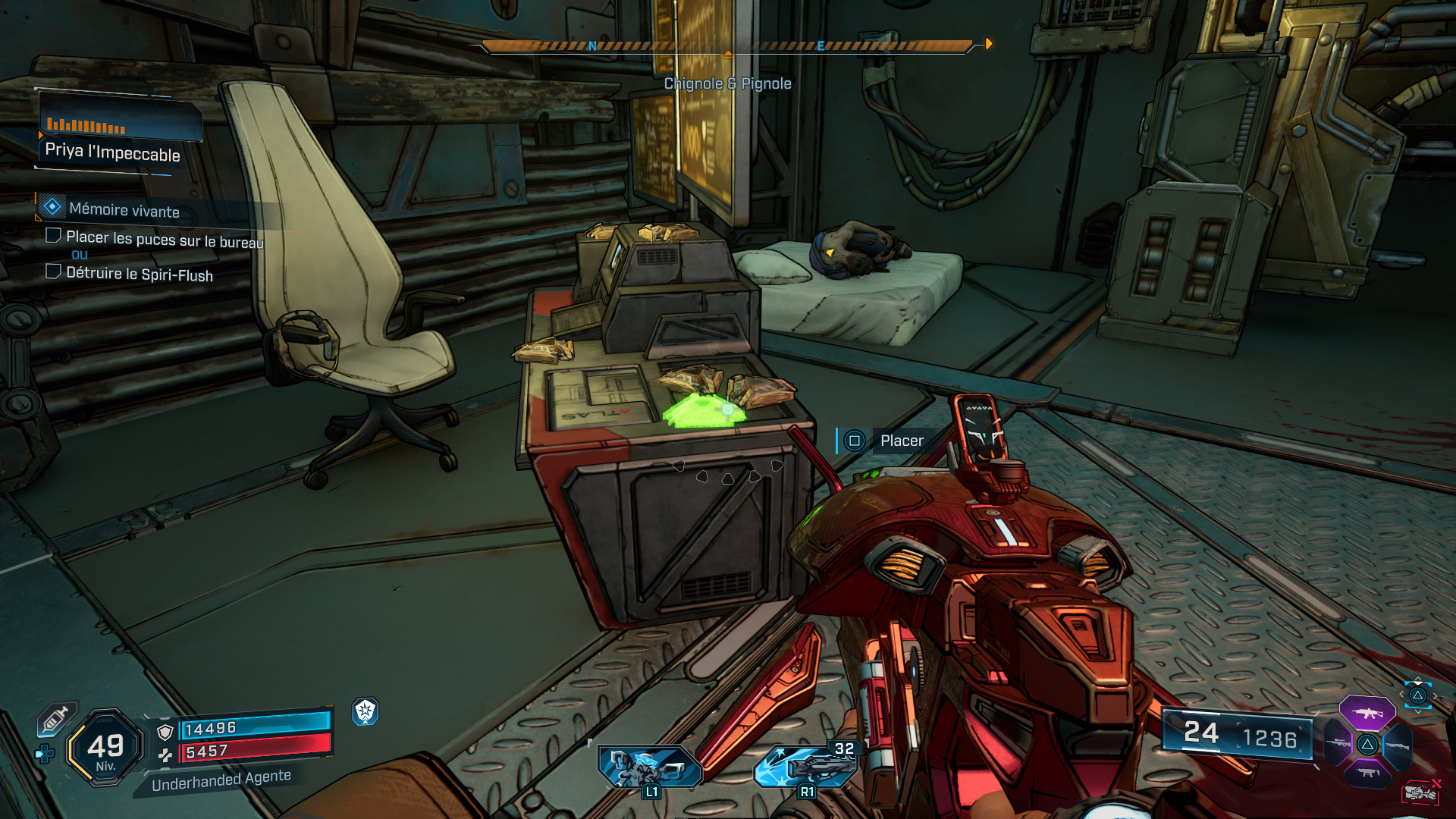 Dès lors, vous avez le choix de détruire la machine en tirant sur le panneau rouge à droite, ou de poser les puces à l’endroit indiqué sur le bureau. Notez d’ailleurs que votre choix n’aura aucun impact sur la suite de l’aventure, ni même sur la récompense obtenue, et la mission se terminera ainsi.
