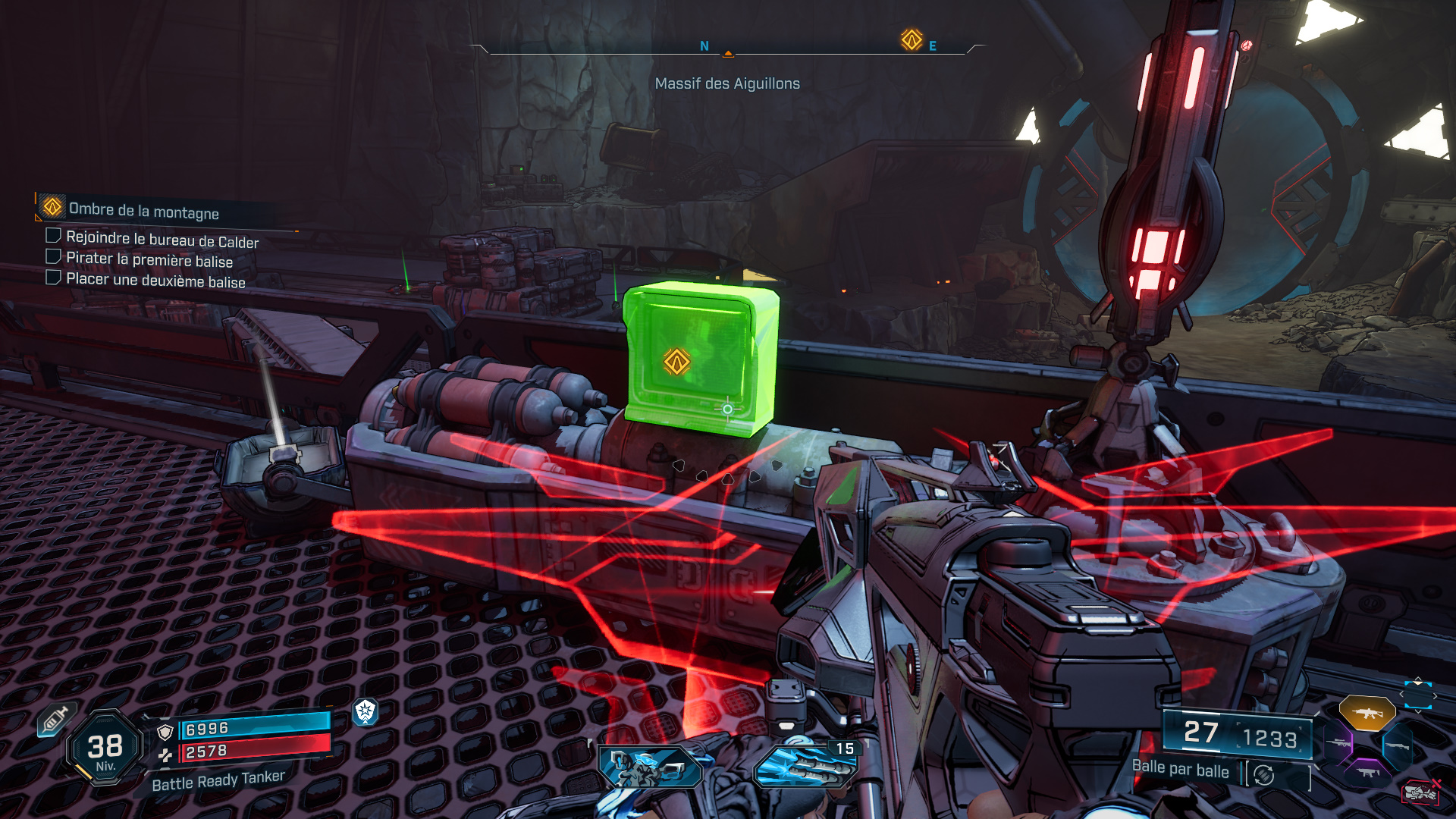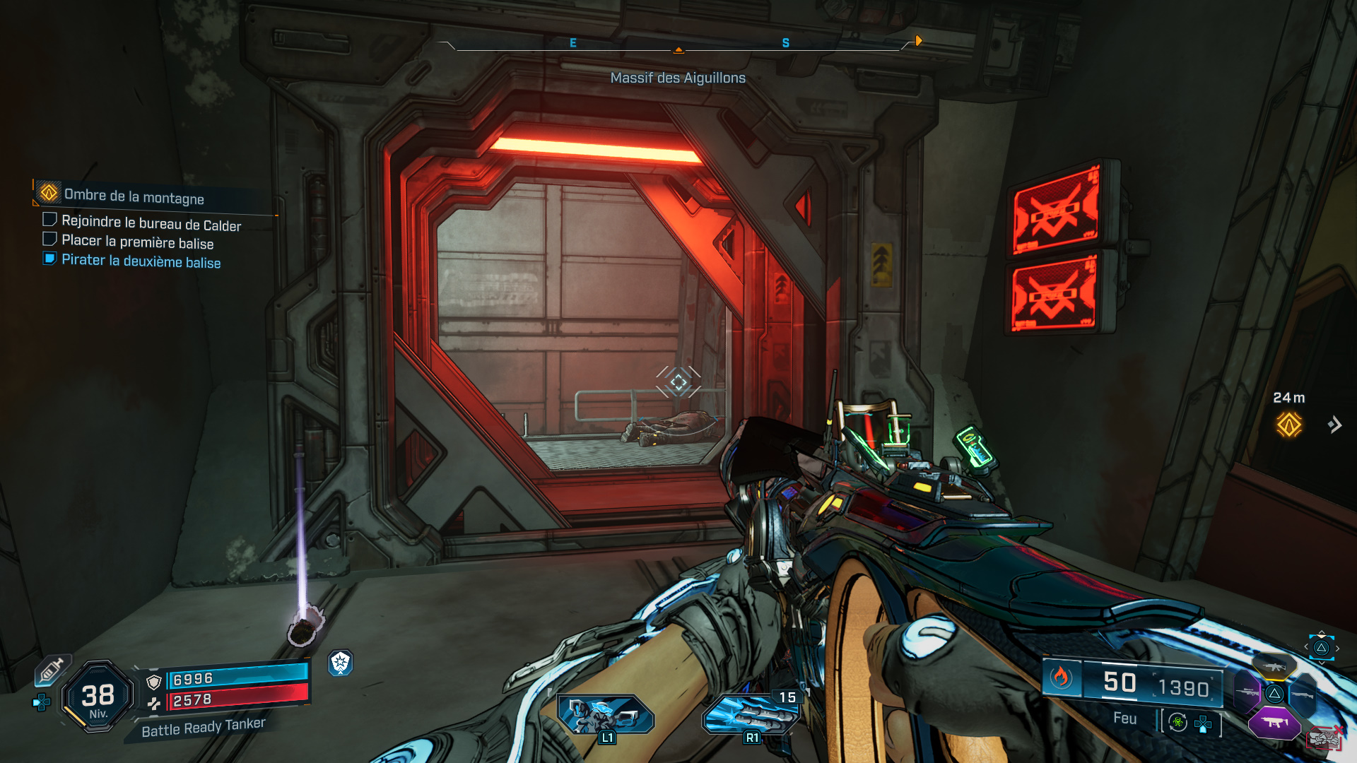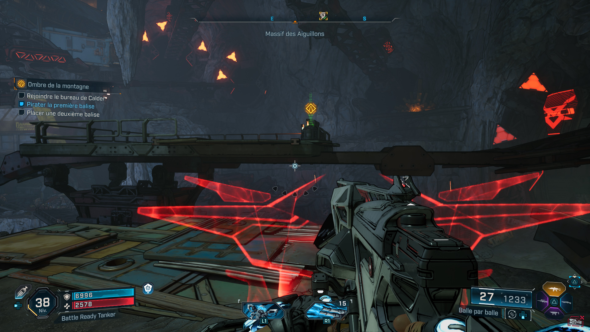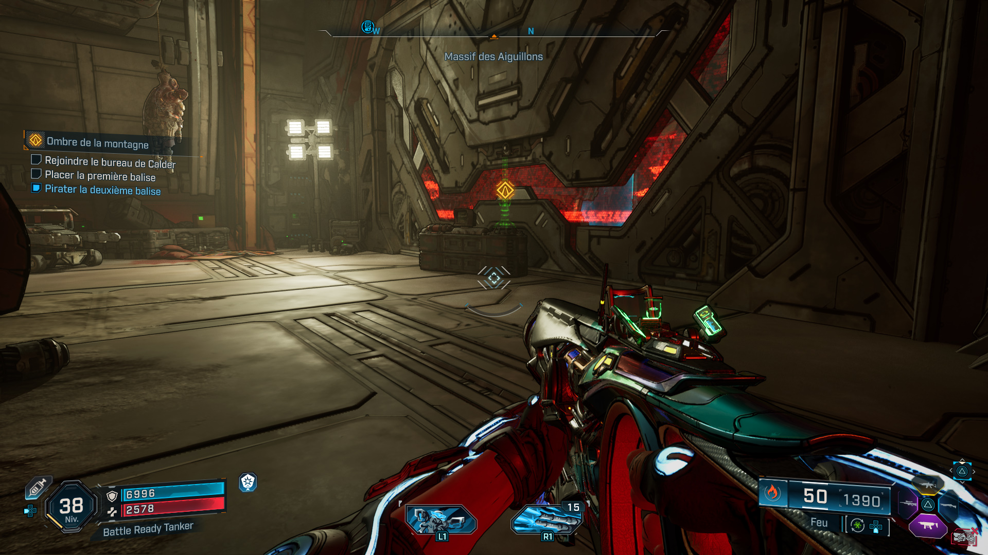 En haut, tout comme précédemment, il s’agit de placer 2 balises et de les pirater pour désactiver le champ de force. Regardez alors tout de suite à gauche en arrivant sur la plateforme pour repérer un endroit où placer votre première balise. Après l’avoir piraté, empruntez le passage éclairé d’une lumière rouge au sud-est, tournez à droite puis allez dans la pièce au fond à droite pour poser et pirater votre seconde balise. Là où se trouve d’ailleurs un enregistrement ECHO dont vous pouvez retrouver tous les détails sur notre page dédiée aux Collectors du Massif des Aiguillons.