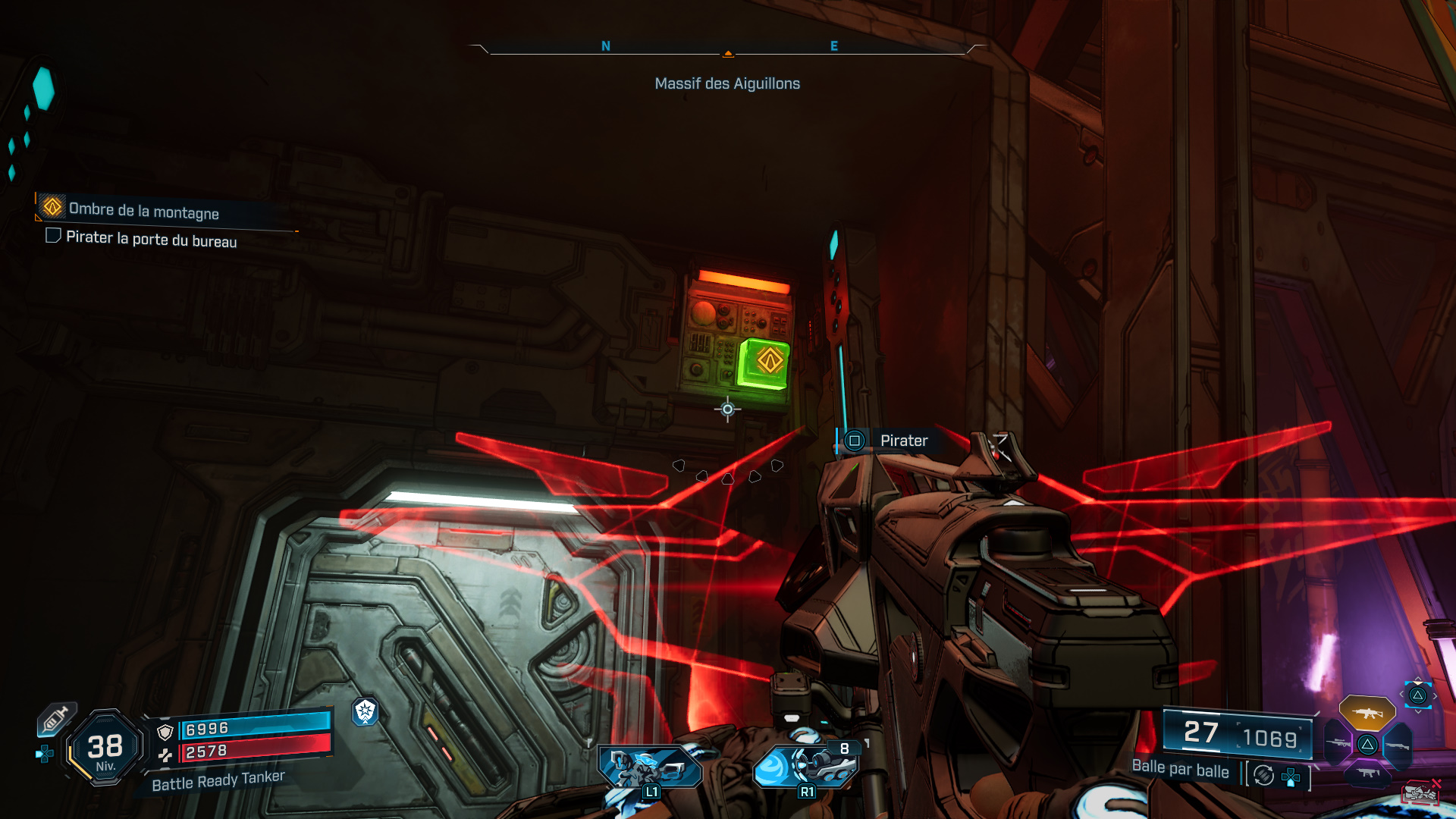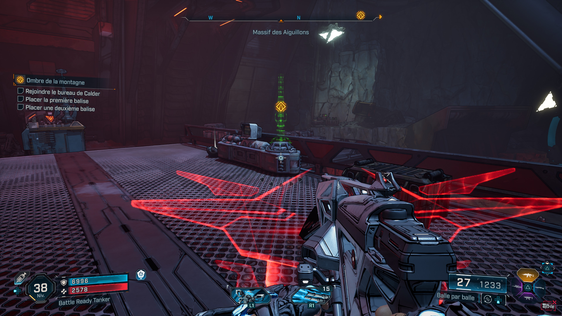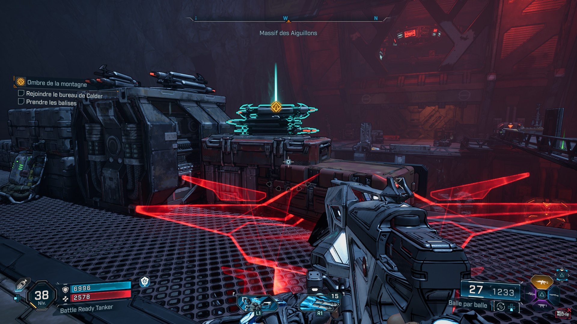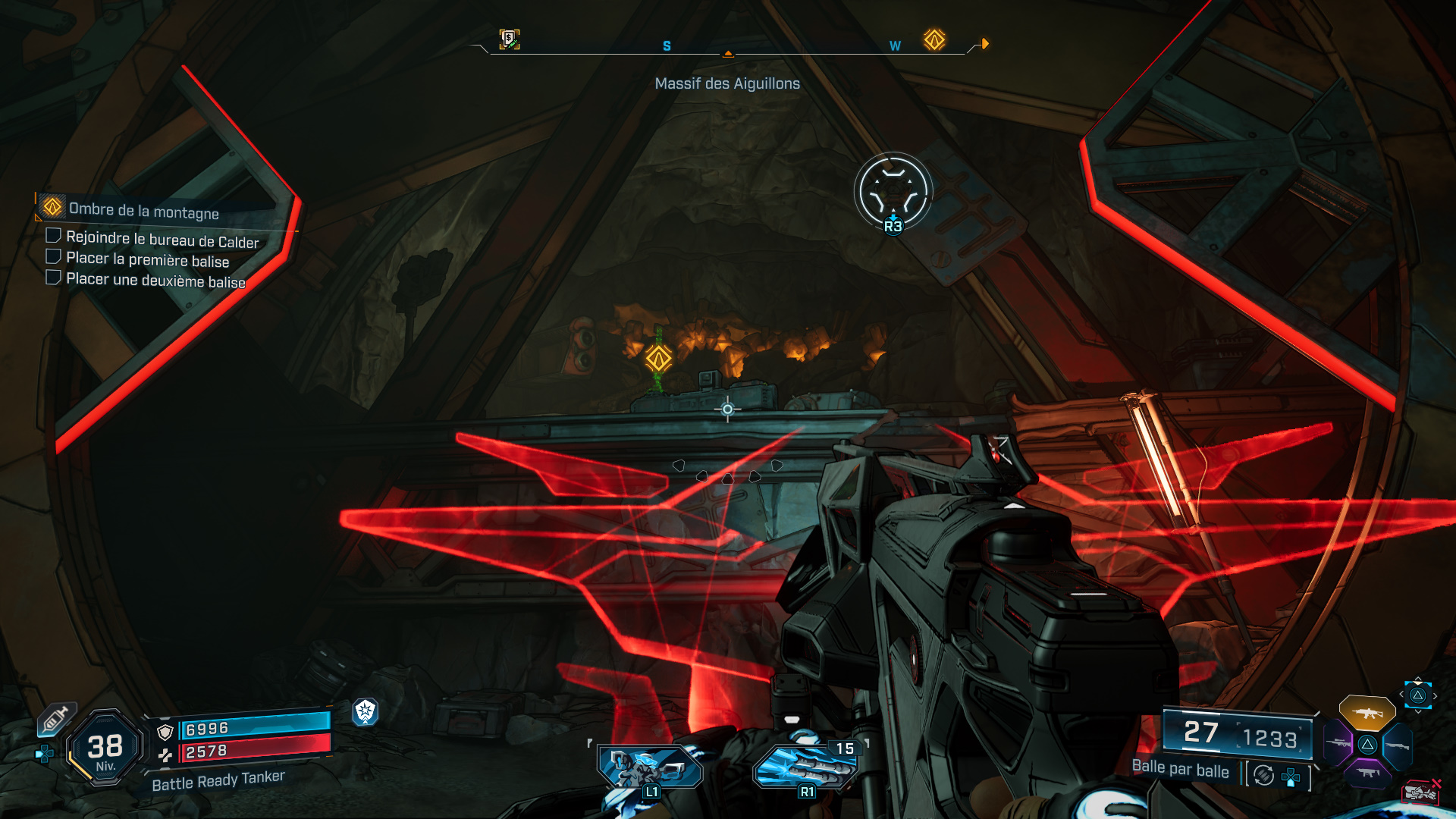 En haut, tout comme précédemment, il s’agit de placer 2 balises et de les pirater pour désactiver le champ de force. Regardez alors tout de suite à gauche en arrivant sur la plateforme pour repérer un endroit où placer votre première balise. Après l’avoir piraté, empruntez le passage éclairé d’une lumière rouge au sud-est, tournez à droite puis allez dans la pièce au fond à droite pour poser et pirater votre seconde balise. Là où se trouve d’ailleurs un enregistrement ECHO dont vous pouvez retrouver tous les détails sur notre page dédiée aux Collectors du Massif des Aiguillons.
