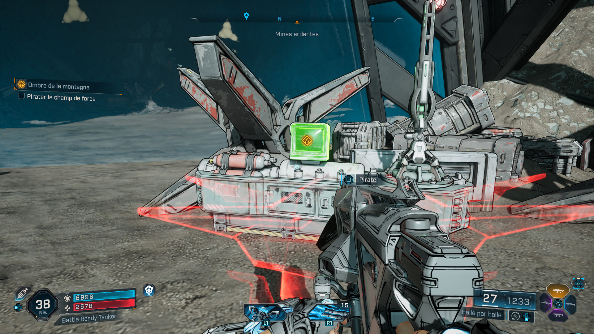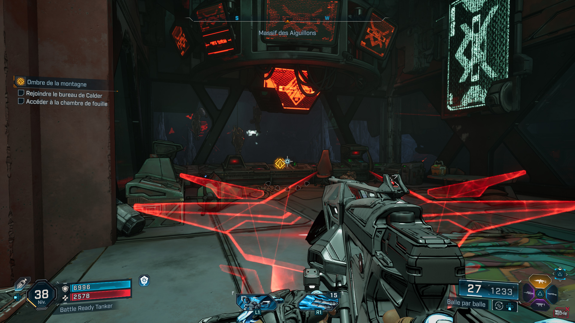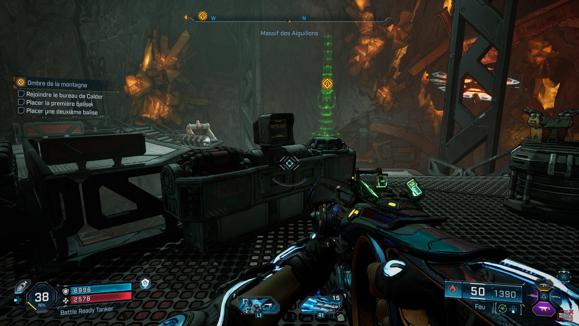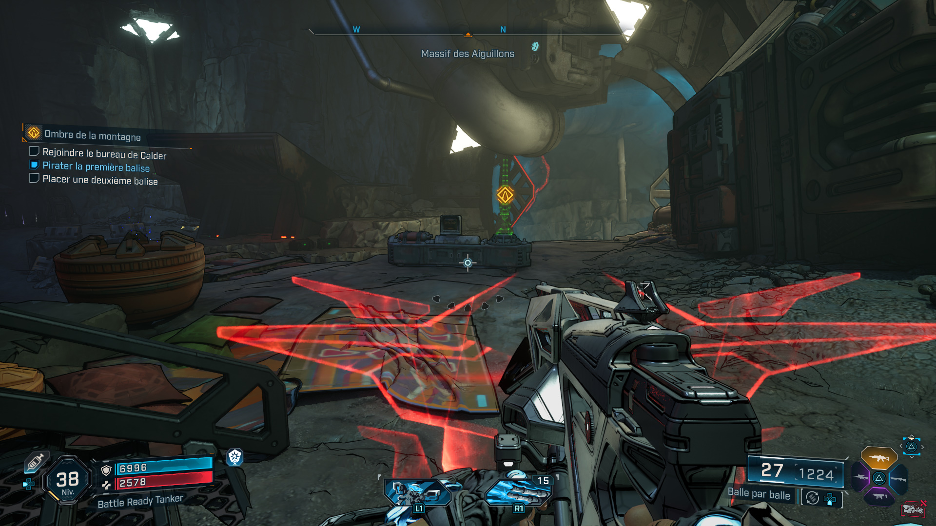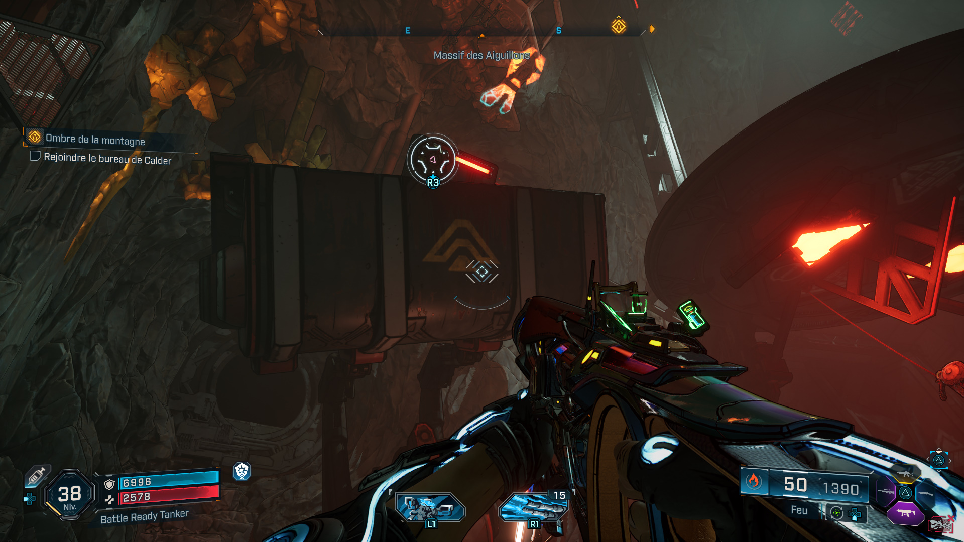 En haut, tout comme précédemment, il s’agit de placer 2 balises et de les pirater pour désactiver le champ de force. Regardez alors tout de suite à gauche en arrivant sur la plateforme pour repérer un endroit où placer votre première balise. Après l’avoir piraté, empruntez le passage éclairé d’une lumière rouge au sud-est, tournez à droite puis allez dans la pièce au fond à droite pour poser et pirater votre seconde balise. Là où se trouve d’ailleurs un enregistrement ECHO dont vous pouvez retrouver tous les détails sur notre page dédiée aux Collectors du Massif des Aiguillons.