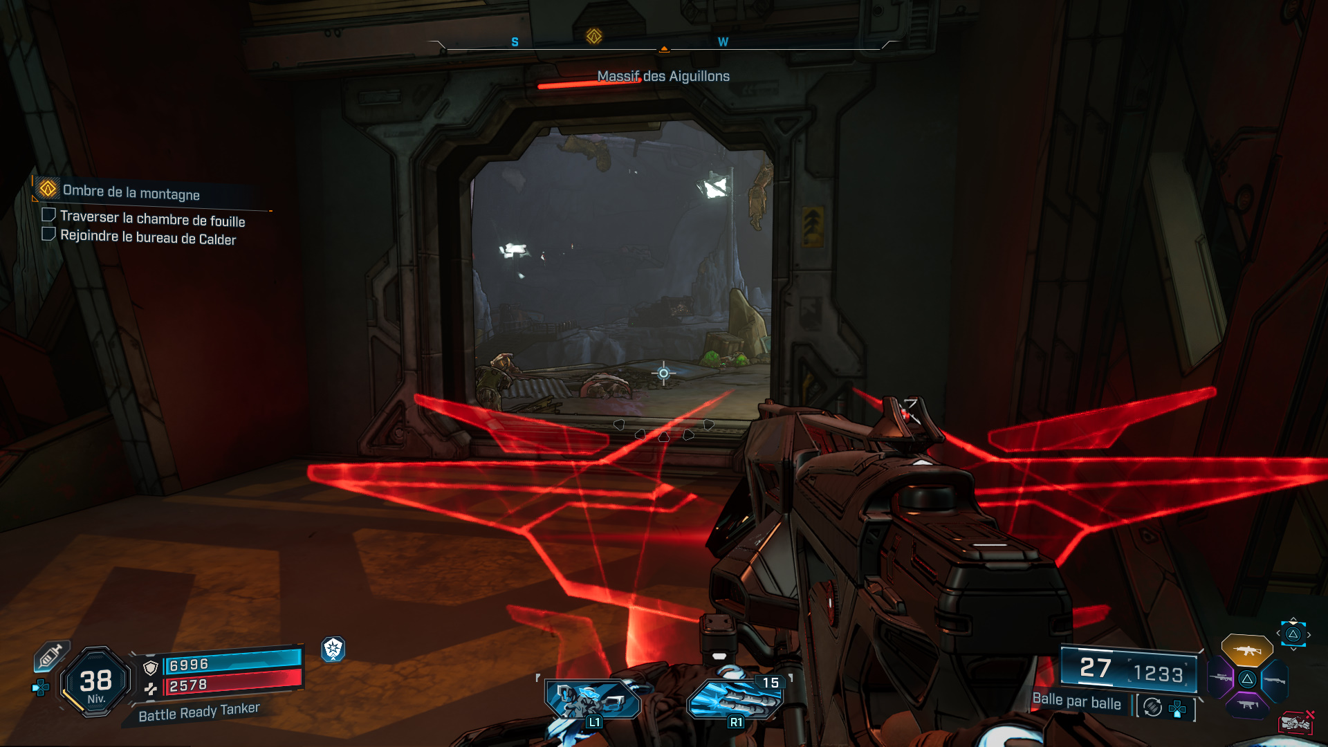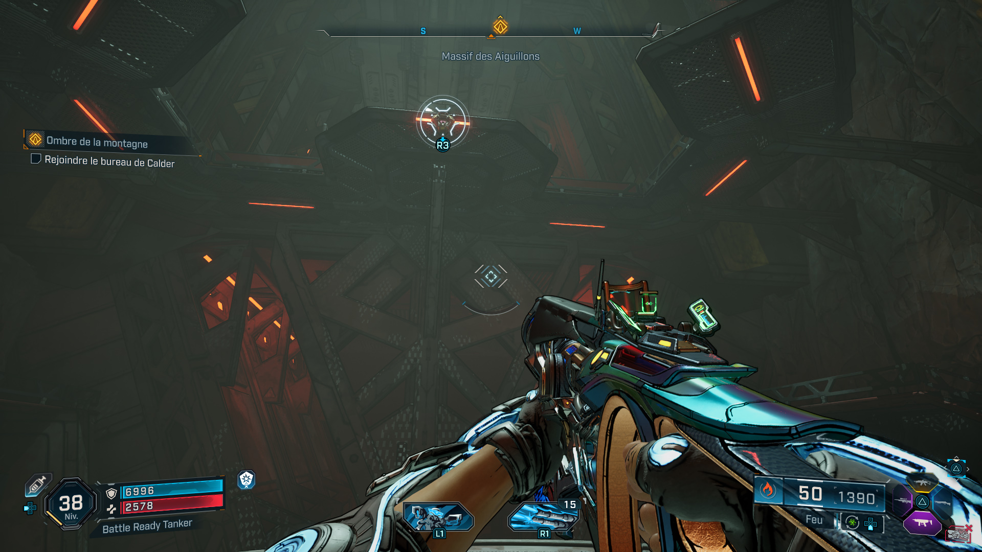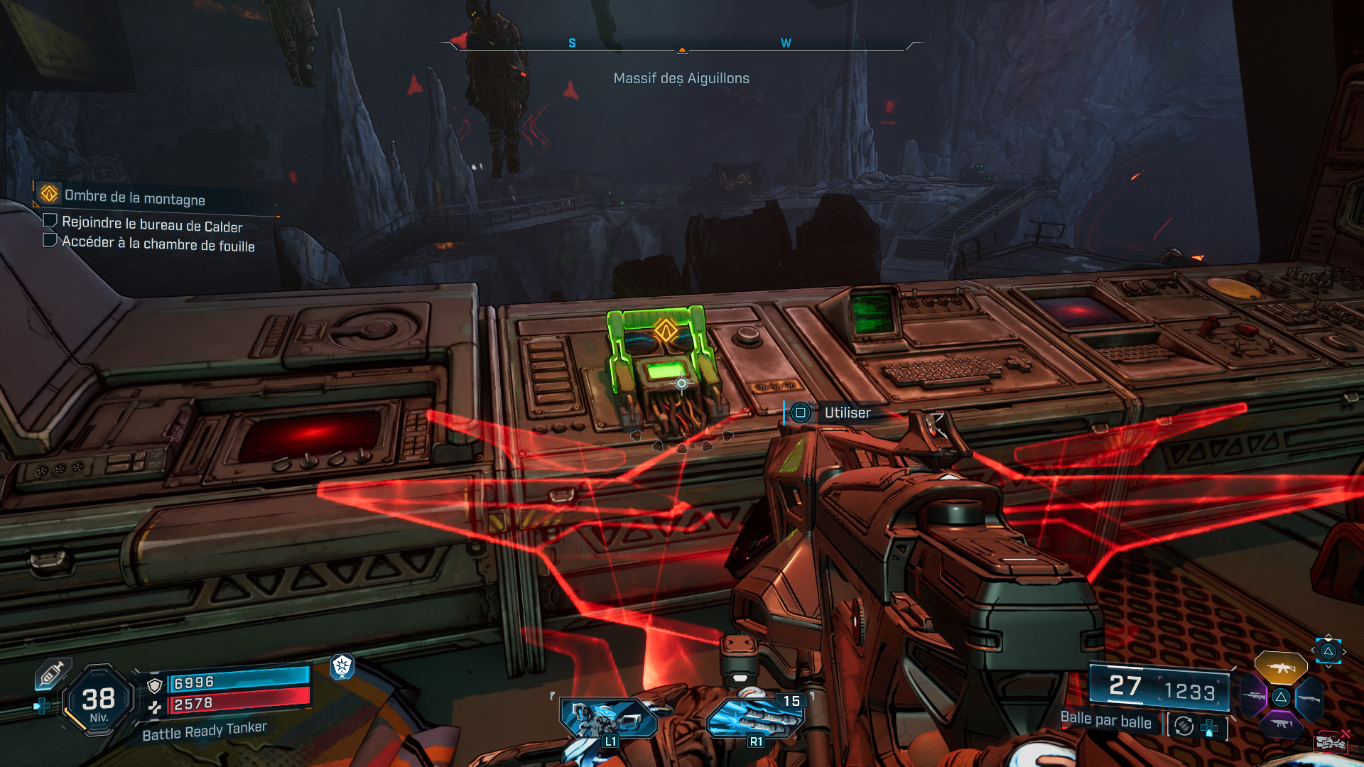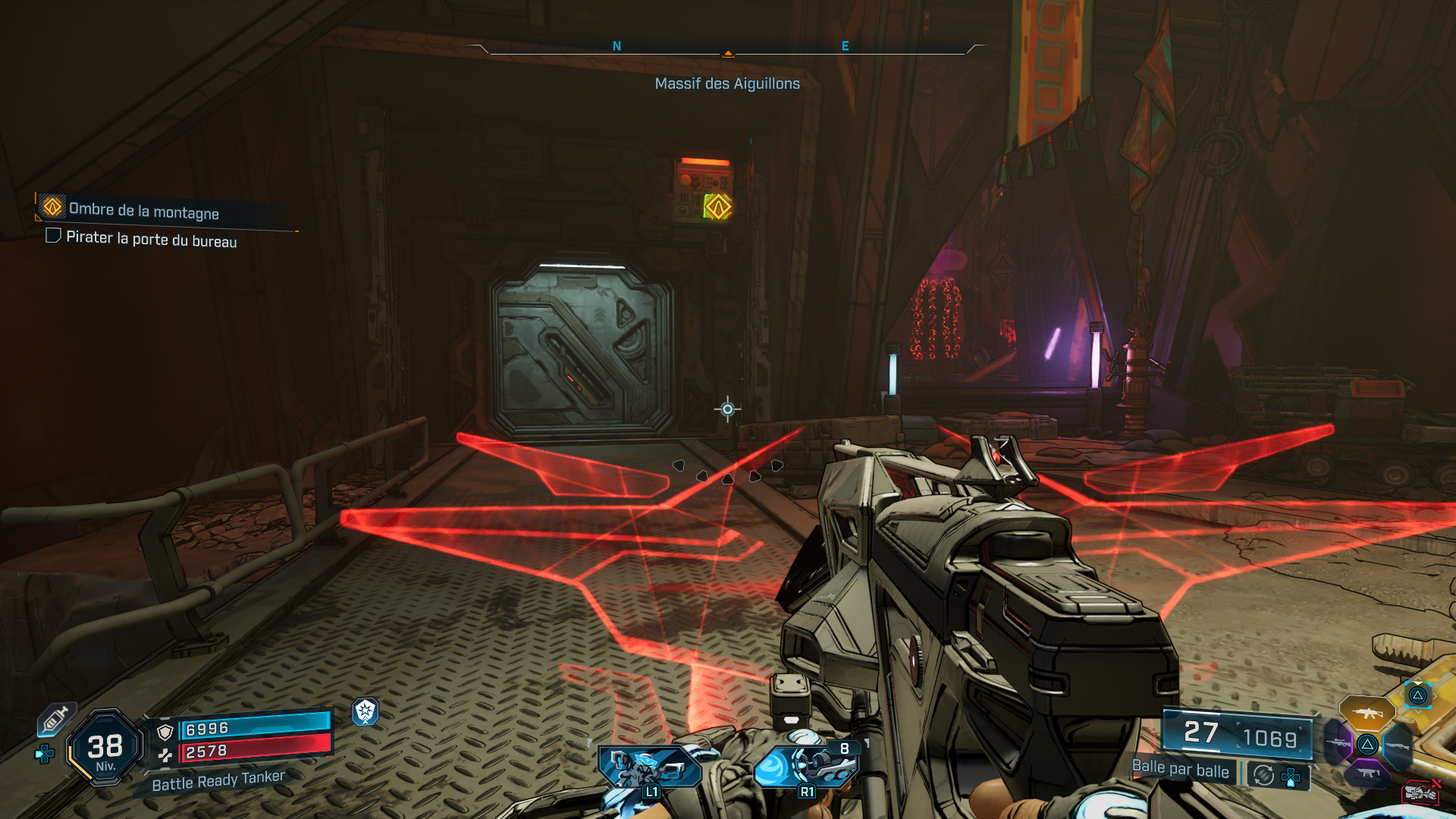 En haut, tout comme précédemment, il s’agit de placer 2 balises et de les pirater pour désactiver le champ de force. Regardez alors tout de suite à gauche en arrivant sur la plateforme pour repérer un endroit où placer votre première balise. Après l’avoir piraté, empruntez le passage éclairé d’une lumière rouge au sud-est, tournez à droite puis allez dans la pièce au fond à droite pour poser et pirater votre seconde balise. Là où se trouve d’ailleurs un enregistrement ECHO dont vous pouvez retrouver tous les détails sur notre page dédiée aux Collectors du Massif des Aiguillons.