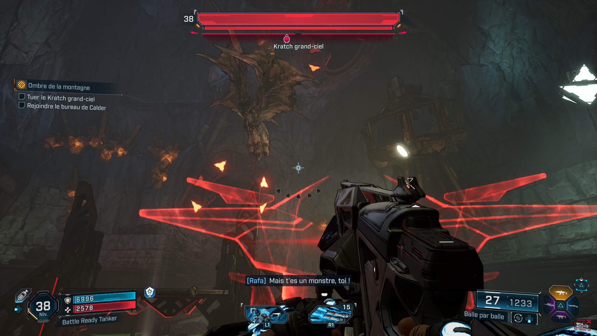 Puis, rebroussez chemin et suivez l’indicateur de votre boussole pour trouver l’endroit où placer la seconde balise en hauteur, dans la chambre de fouille. Retournez ensuite au niveau du champ de force, désormais inactif, ce qui vous laisse le champ libre pour rejoindre une arène de combat un peu plus loin, non sans avoir la possibilité de faire quelques emplettes au passage, juste avant d’affronter un gros Kratch.