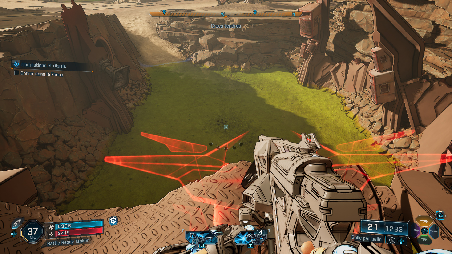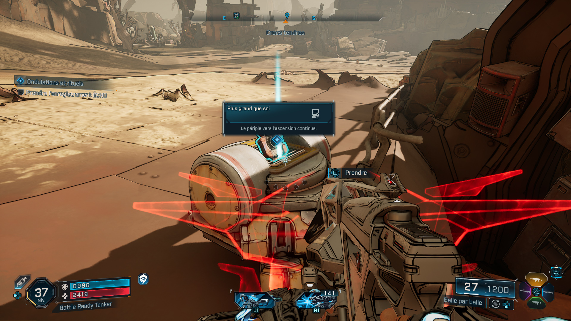 Commencez par sauter dans la fosse dont le sol est recouvert d’une substance corrosive, le but étant alors de survivre durant 25 secondes, tout en éliminant quelques ennemis volants. Cela ne devrait pas trop vous poser de problème si vous êtes équipé d’un bouclier efficace et que vous affichez un niveau suffisamment élevé. A la fin du compte à rebours, sortez de là via le point d’accroche en hauteur et prenez l’enregistrement ECHO « Plus grand que soi ».