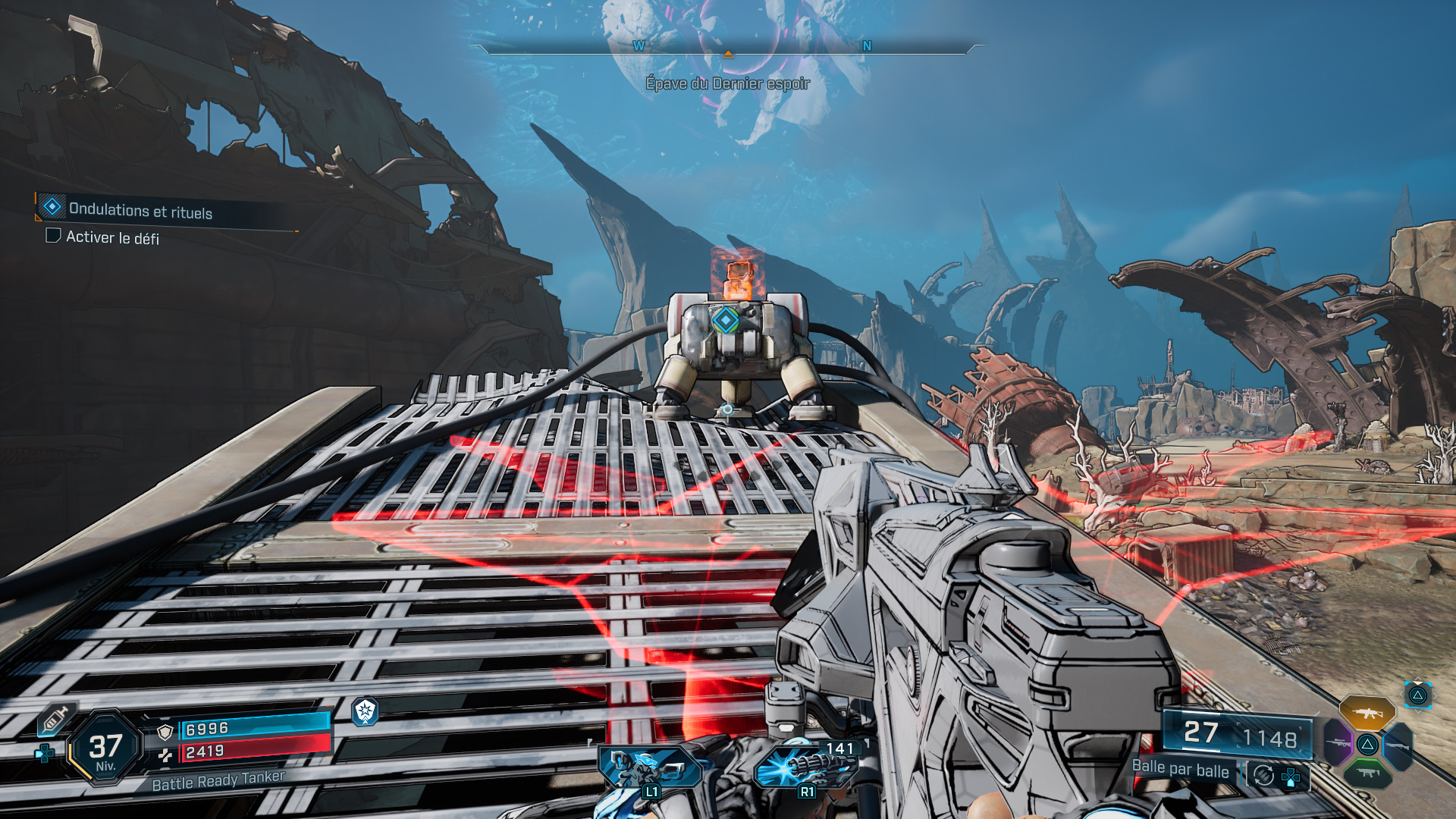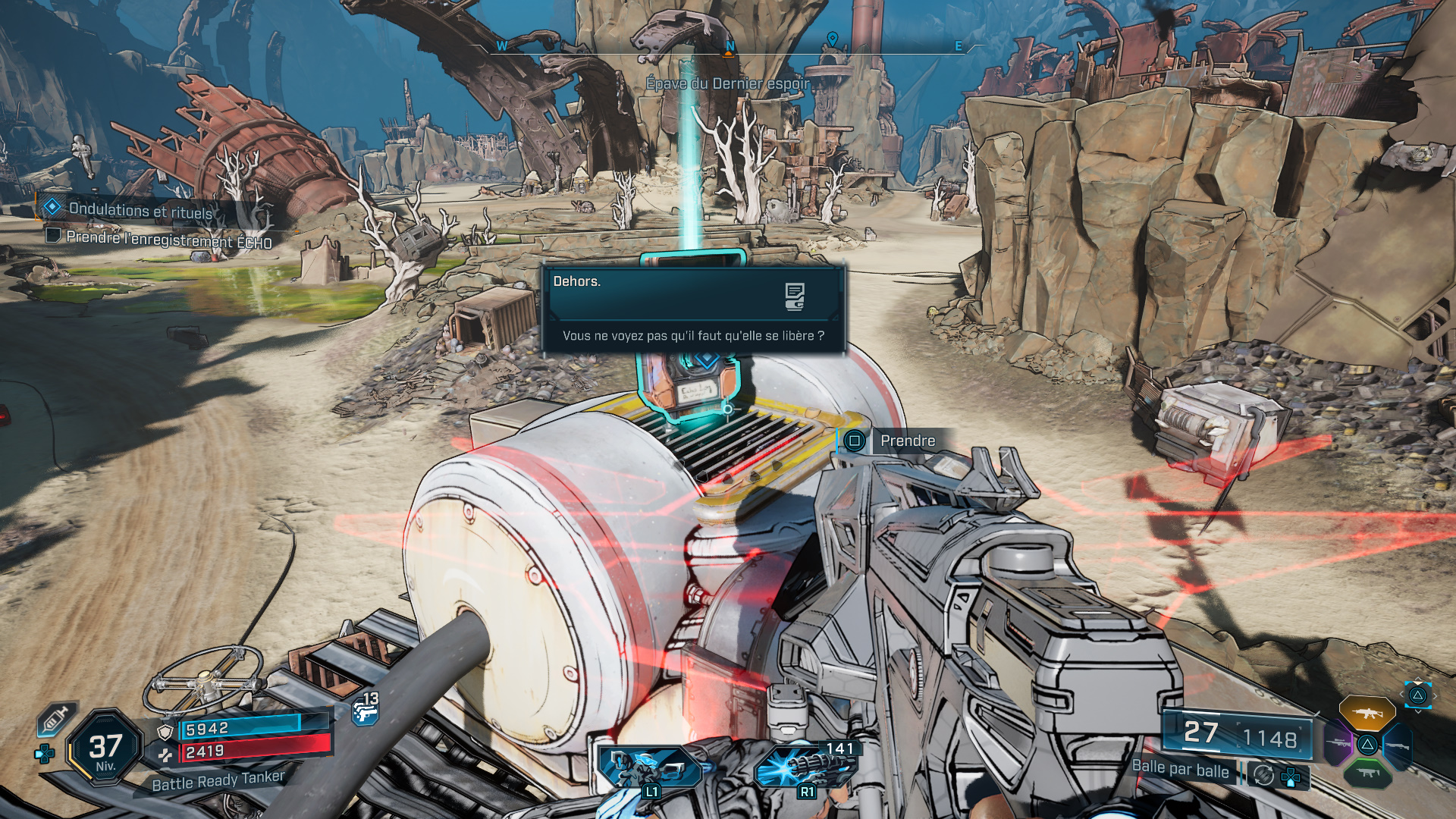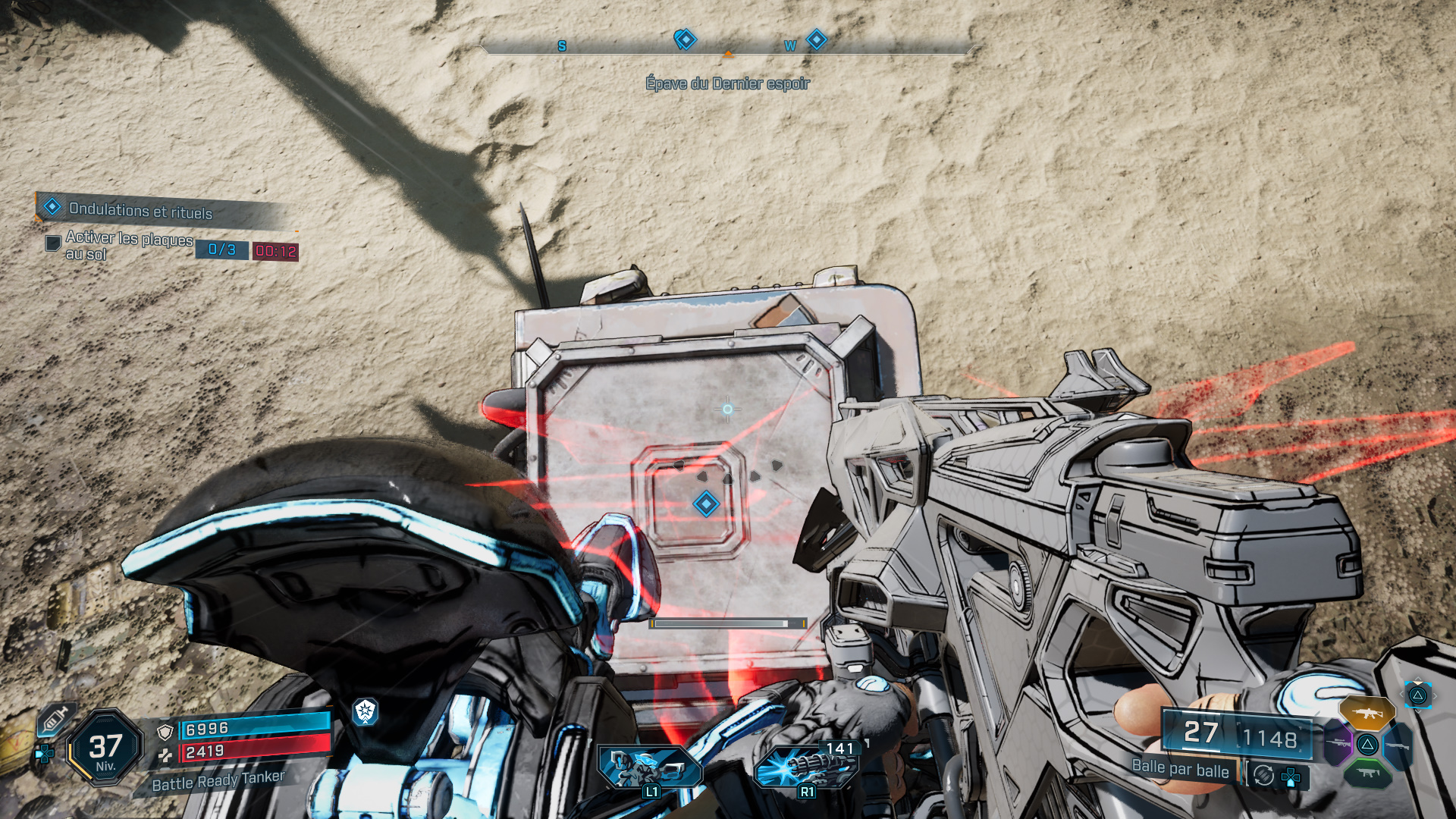 Dès la fin de l’enregistrement, suivez votre boussole en direction du sud-ouest pour atteindre le défi suivant, au niveau de l’Epave du Dernier Espoir. Une fois sur place, interagissez avec un dispositif similaire au précédent, installé au bout d’une rampe.