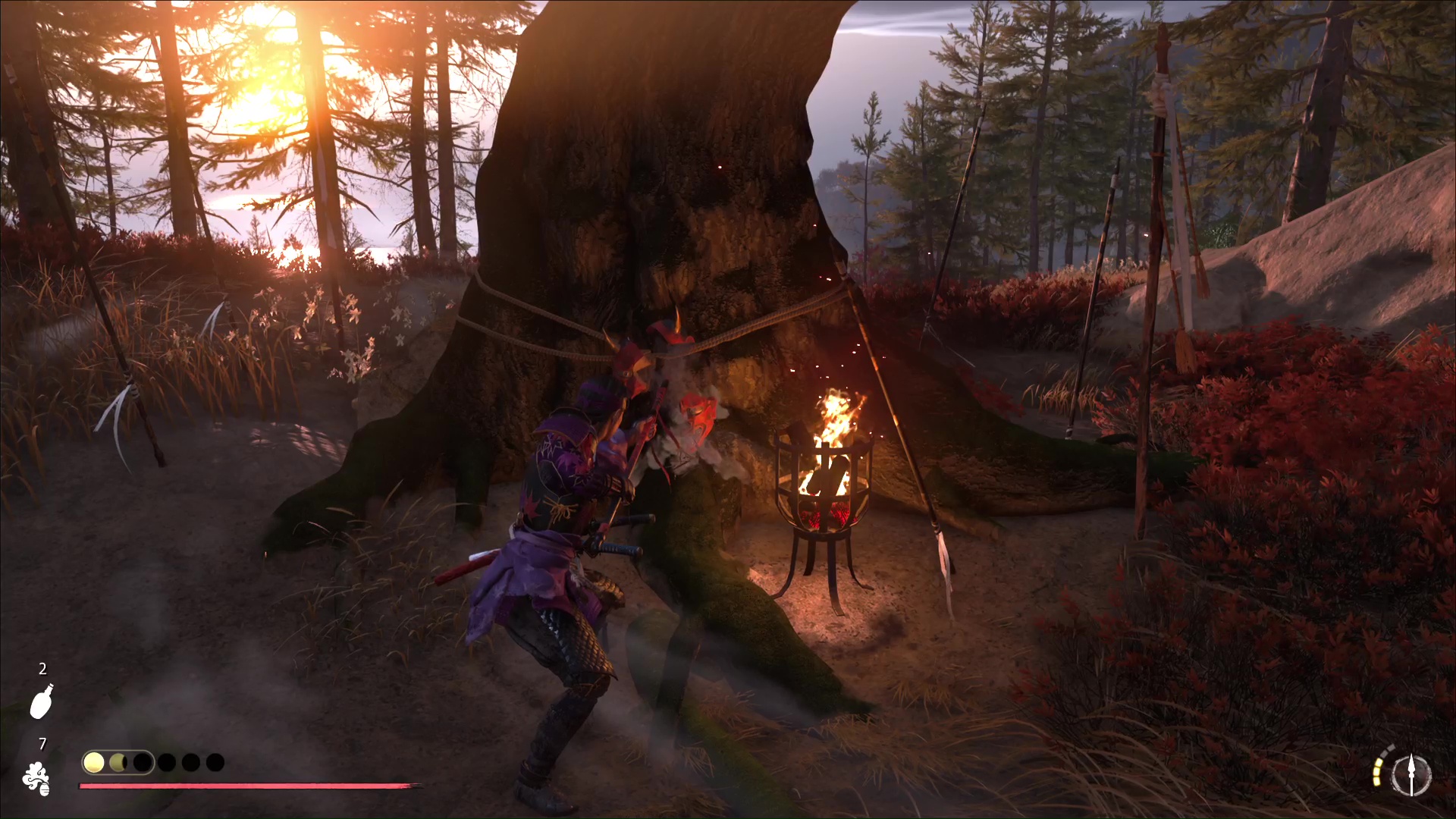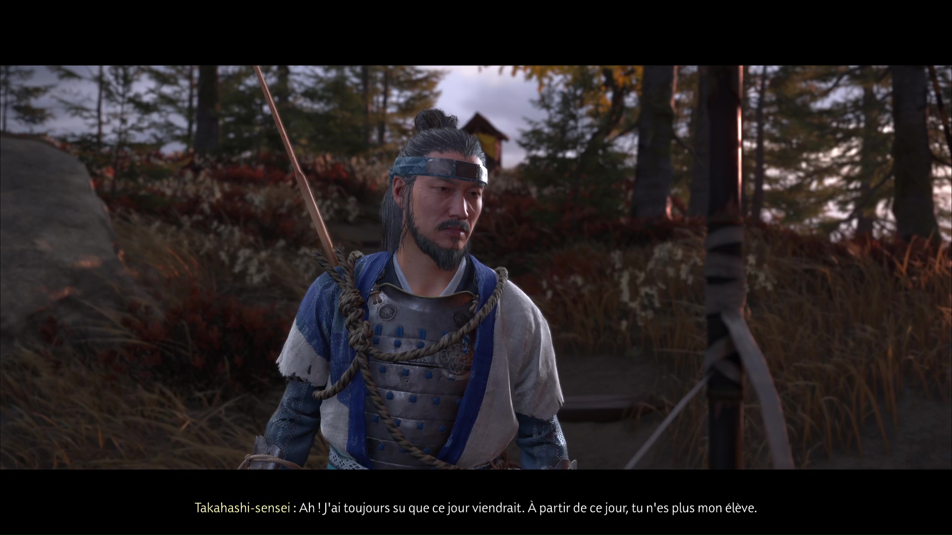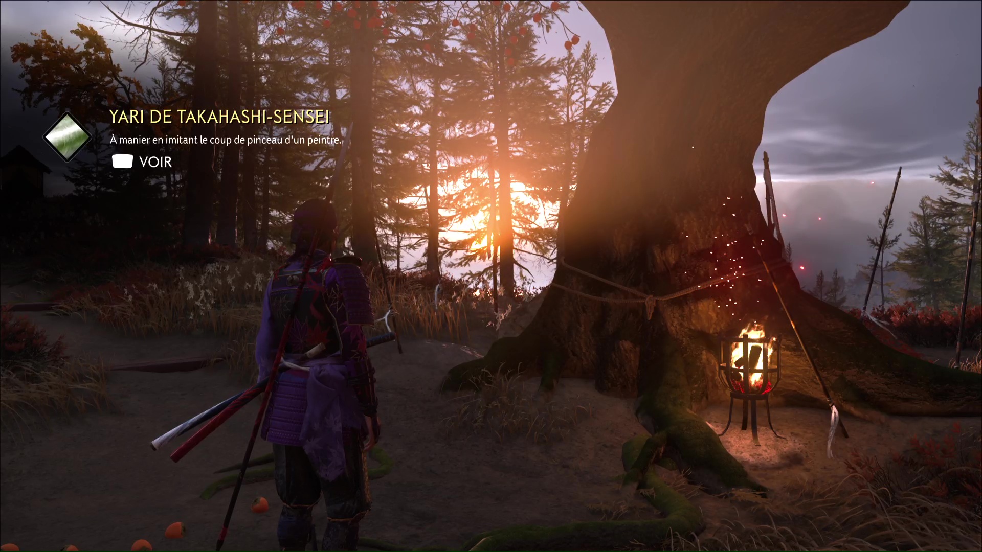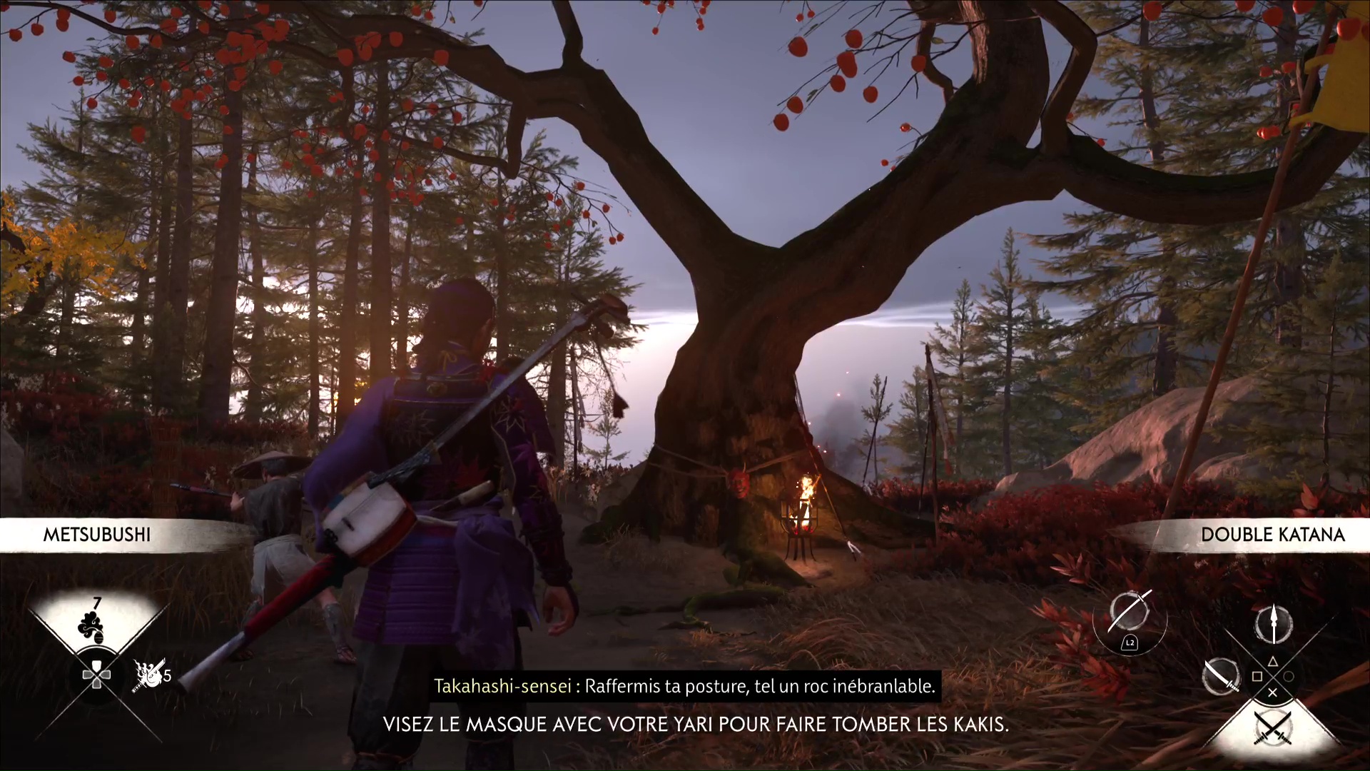 Une fois l’arbre de compétence de la yari complété, retournez au Dojo de Takahashi-sensei dans le Bois du cerf blanc pour vous présenter devant l’arbre. Frappez ensuite le masque et il se détruira. Les kakis vont alors tomber, et le sensei va féliciter Atsu pour sa maîtrise.