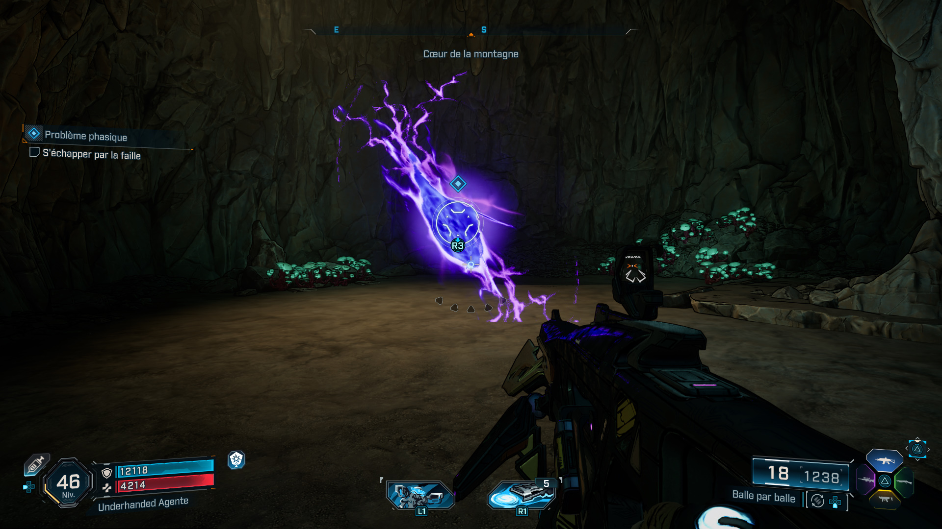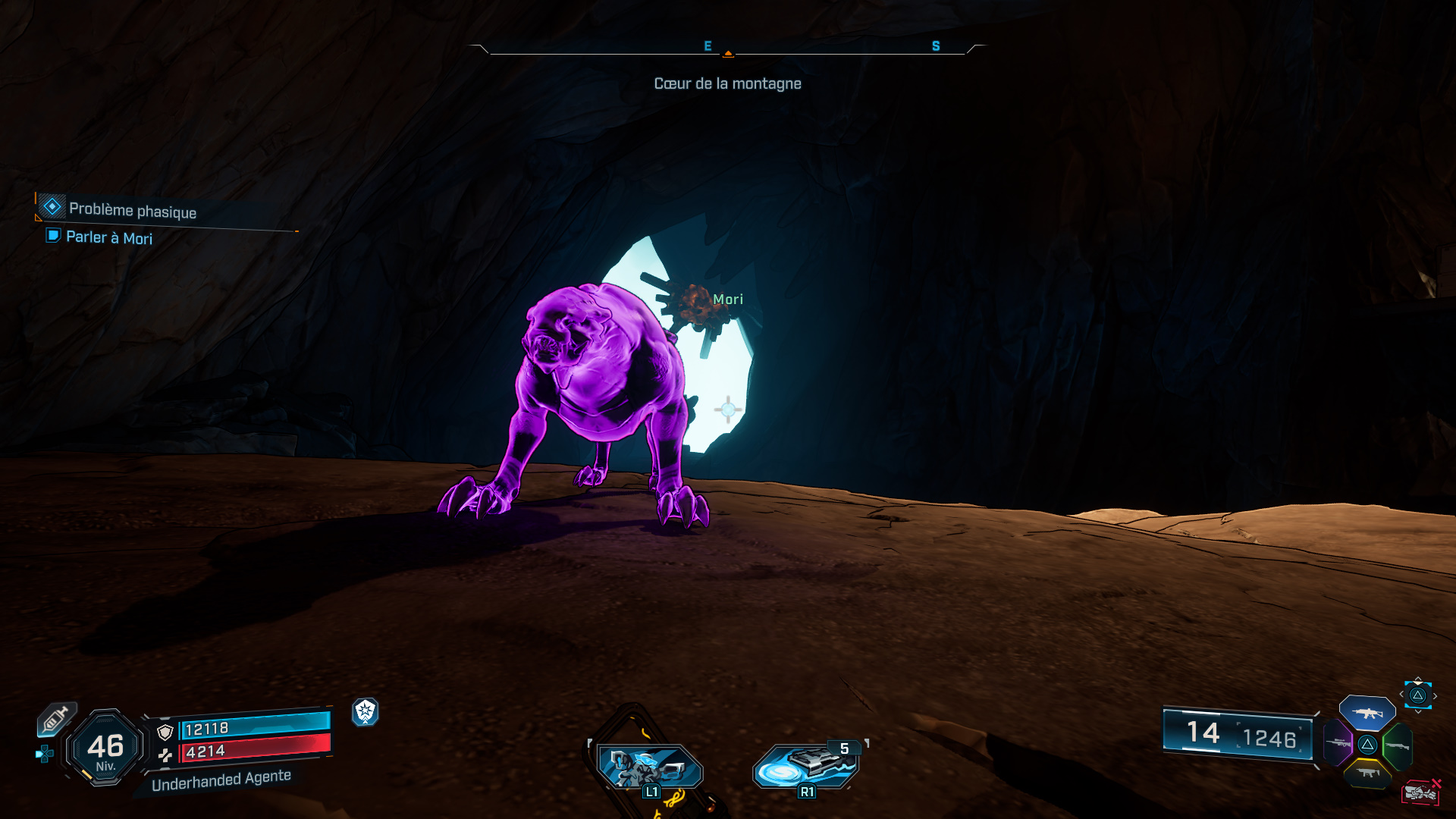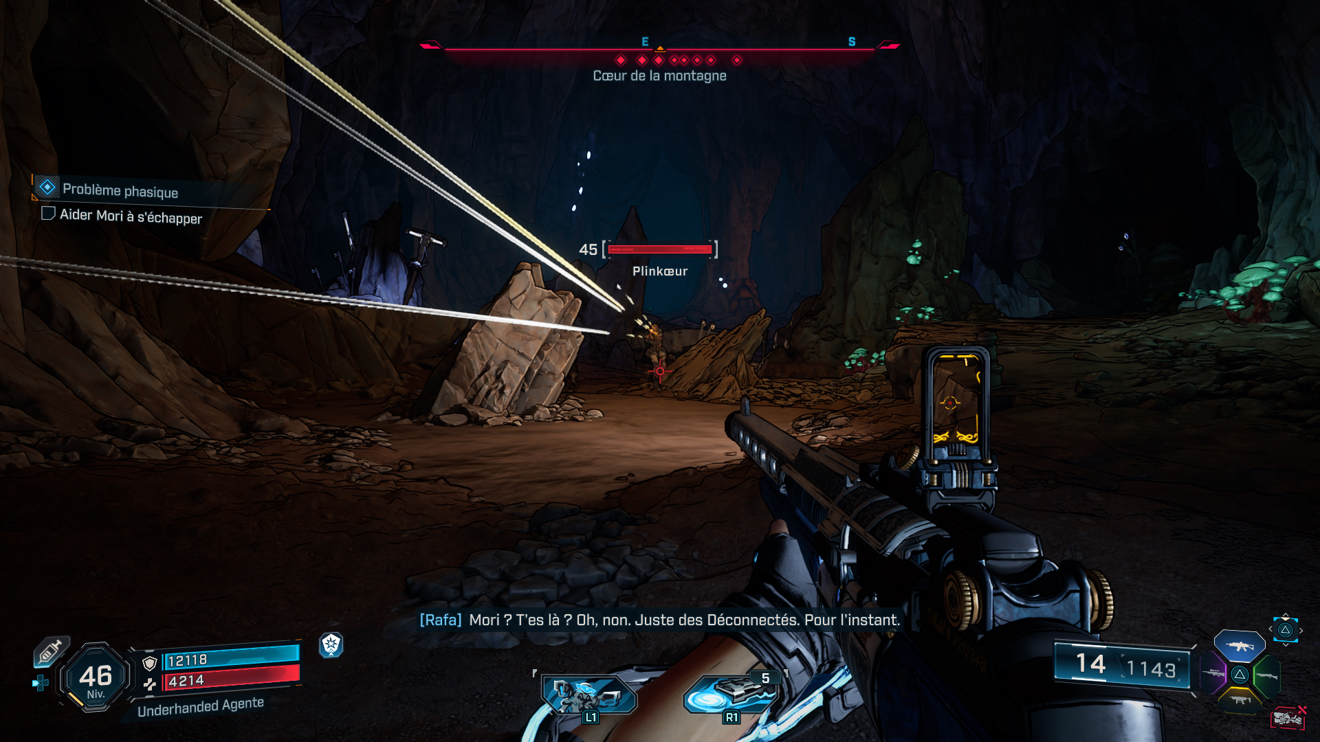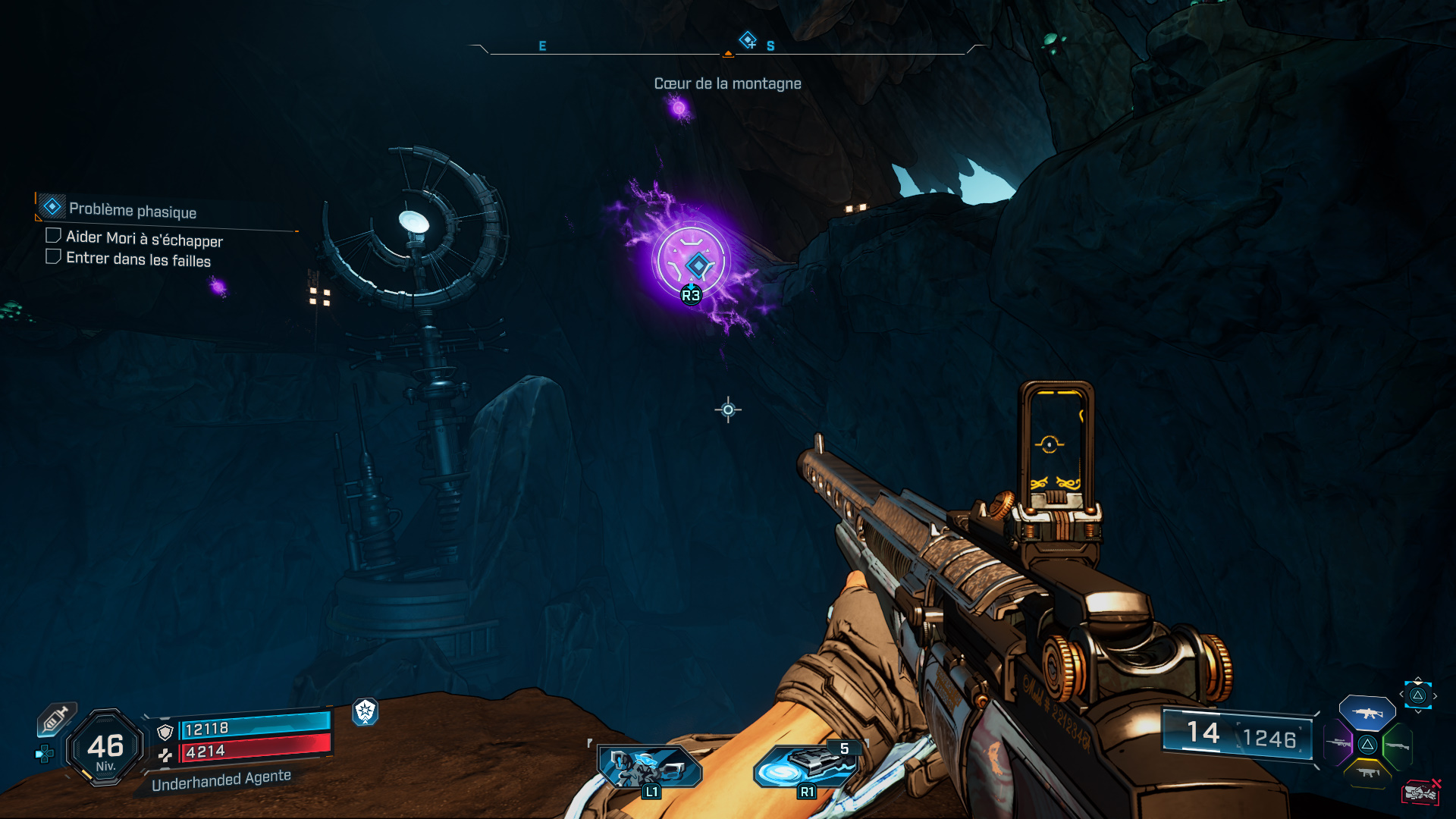 De là, entrez successivement dans chacune des failles que vous croisez, tout en éliminant les ennemis sur votre passage et suivez votre boussole jusqu’à tomber sur un groupe de Déconnectés. Tuez-les tous avant de rejoindre une nouvelle zone d’objectif avec une autre barrière violette un peu plus loin, et Mori qui apparaîtra aussi vite qu’il disparaîtra, dissipant la barrière par la même occasion. Continuez d’avancer jusqu’au cœur de la grotte, (notez d’ailleurs qu’un enregistrement ECHO propre à cette mission se trouve dans les parages) tout en vous débarrassant de tout ce qui bouge sur votre passage, et utilisez votre grappin sur la faille afin d’en extirper Mori.
