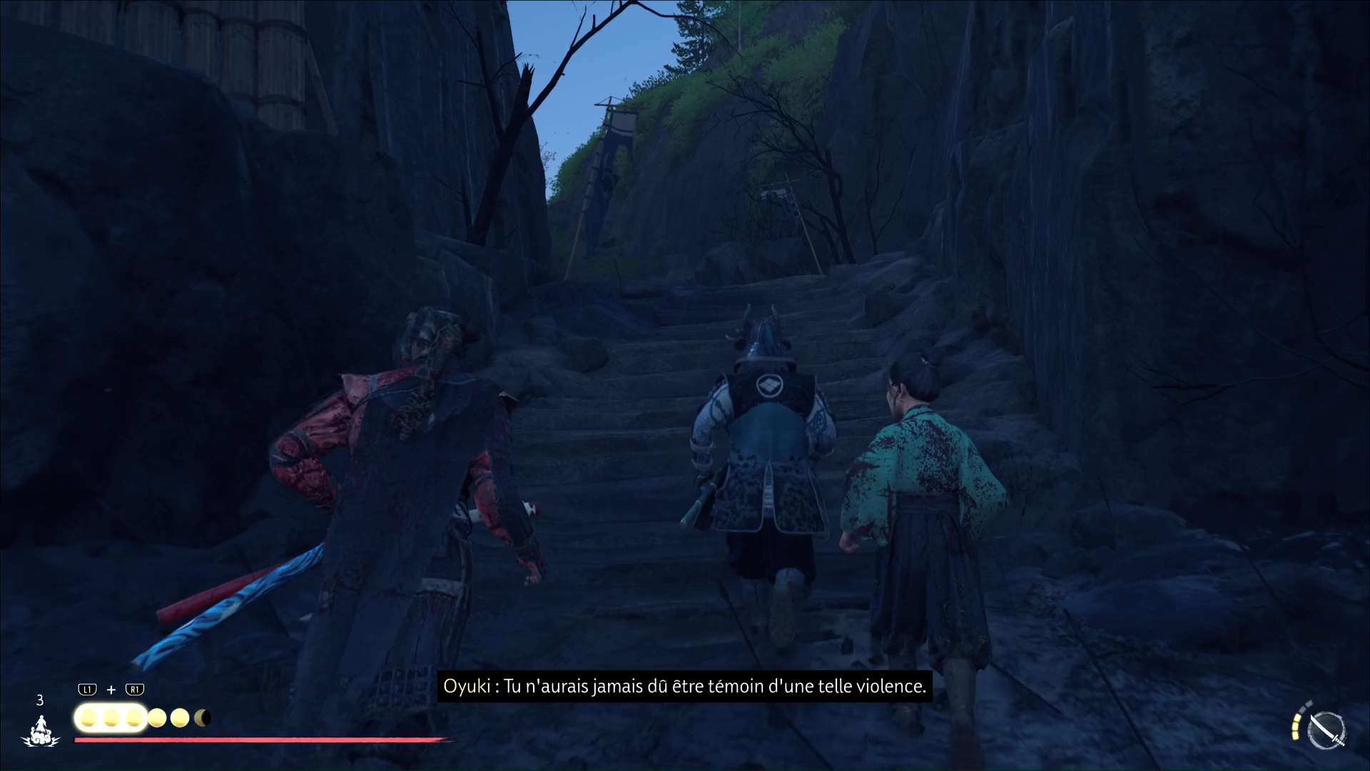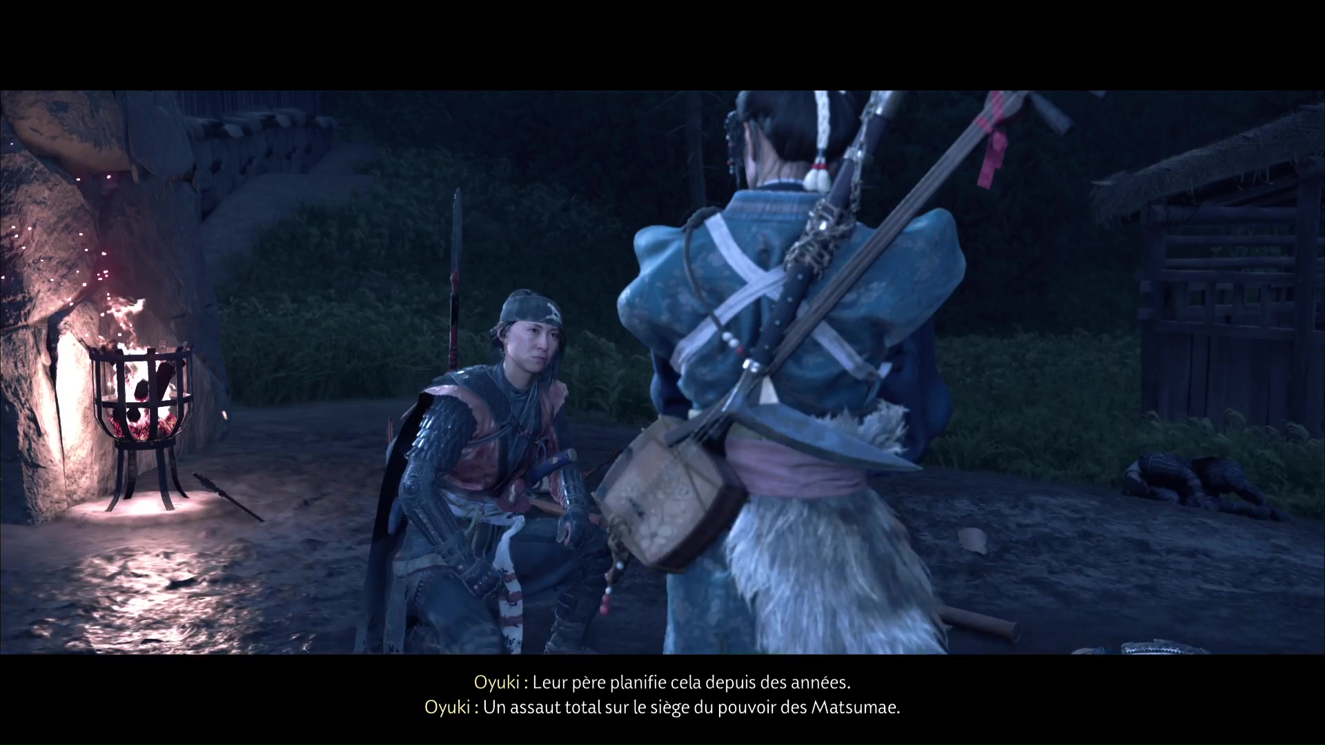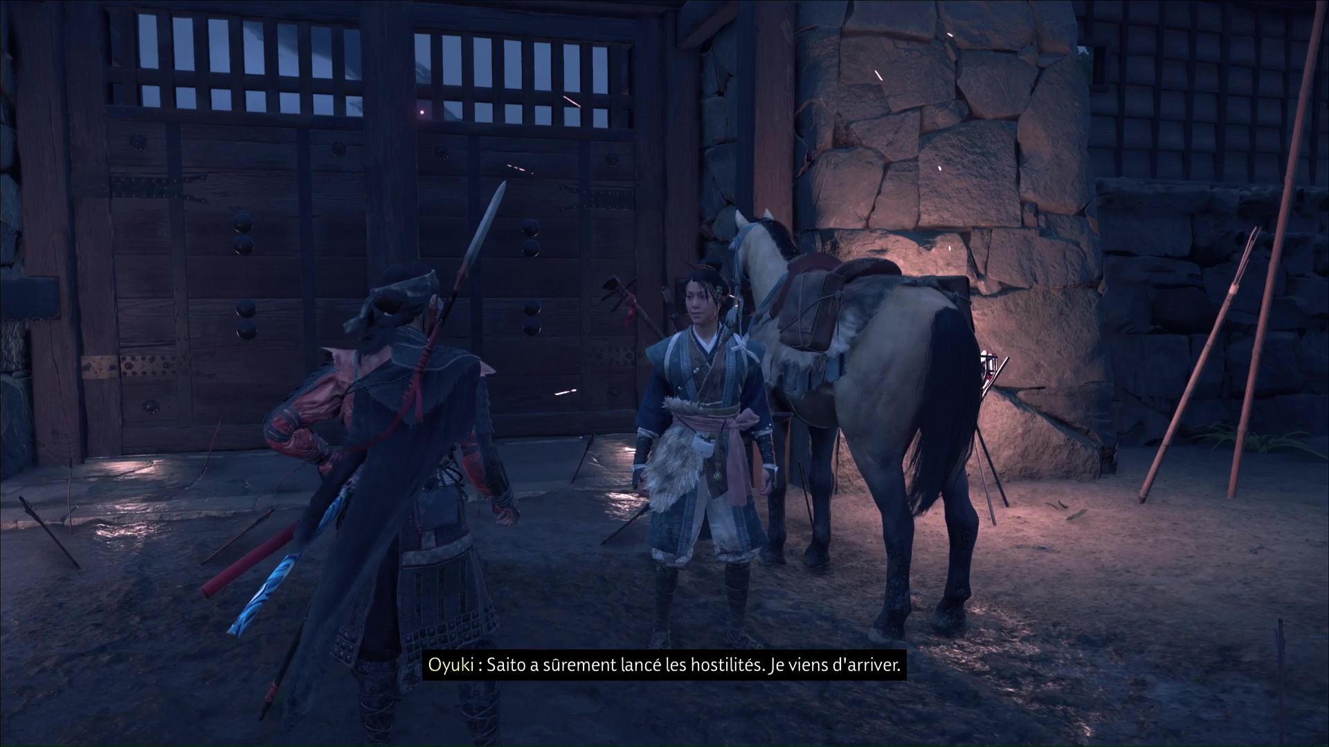 Sur place, vous retrouvez Oyuki. Grâce à son aide, vous ouvrez la porte. De l’autre côté, la guerre semble faire rage. Parlez au Mastumae à l’agonie pour qu’il vous explique la situation. Les Frères Saito ont débarqué avec leurs hommes pour faire un carnage. Oyuki confirme leur plan : anéantir le château des Matsumae.
