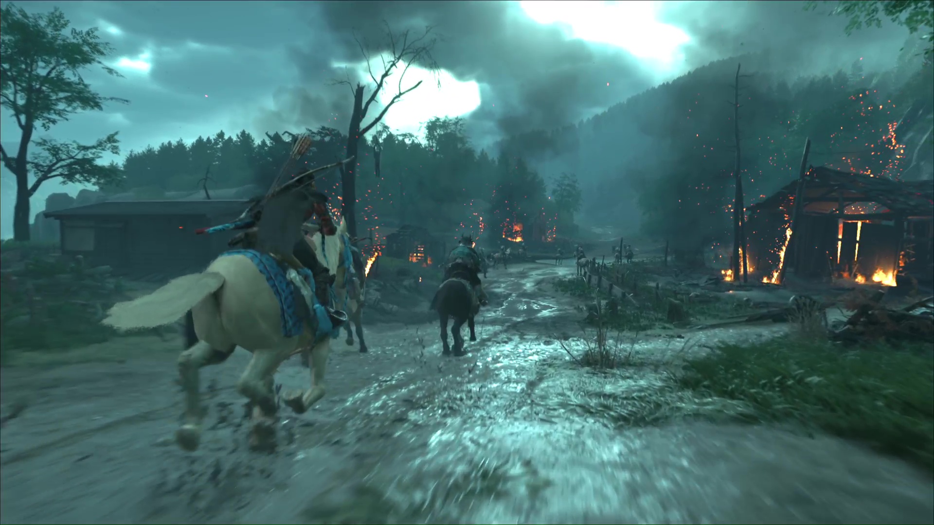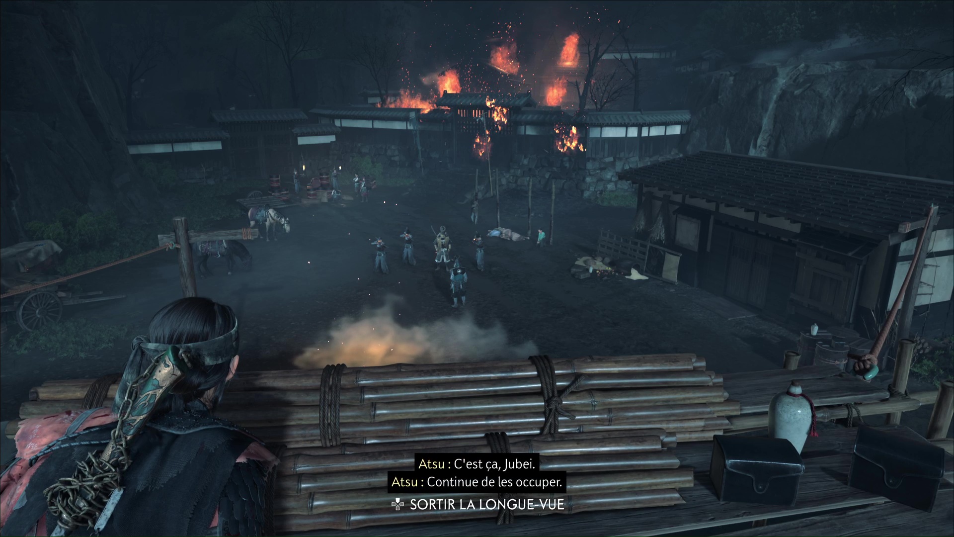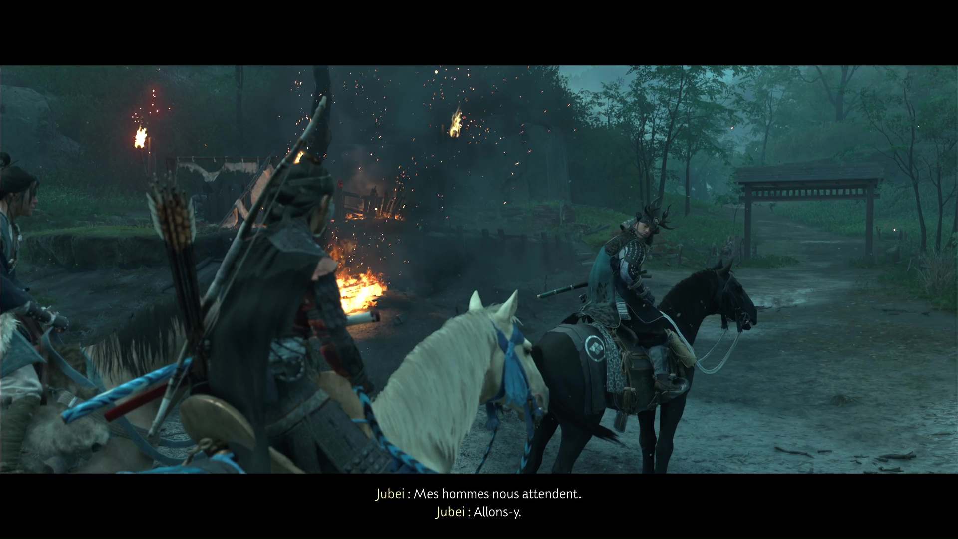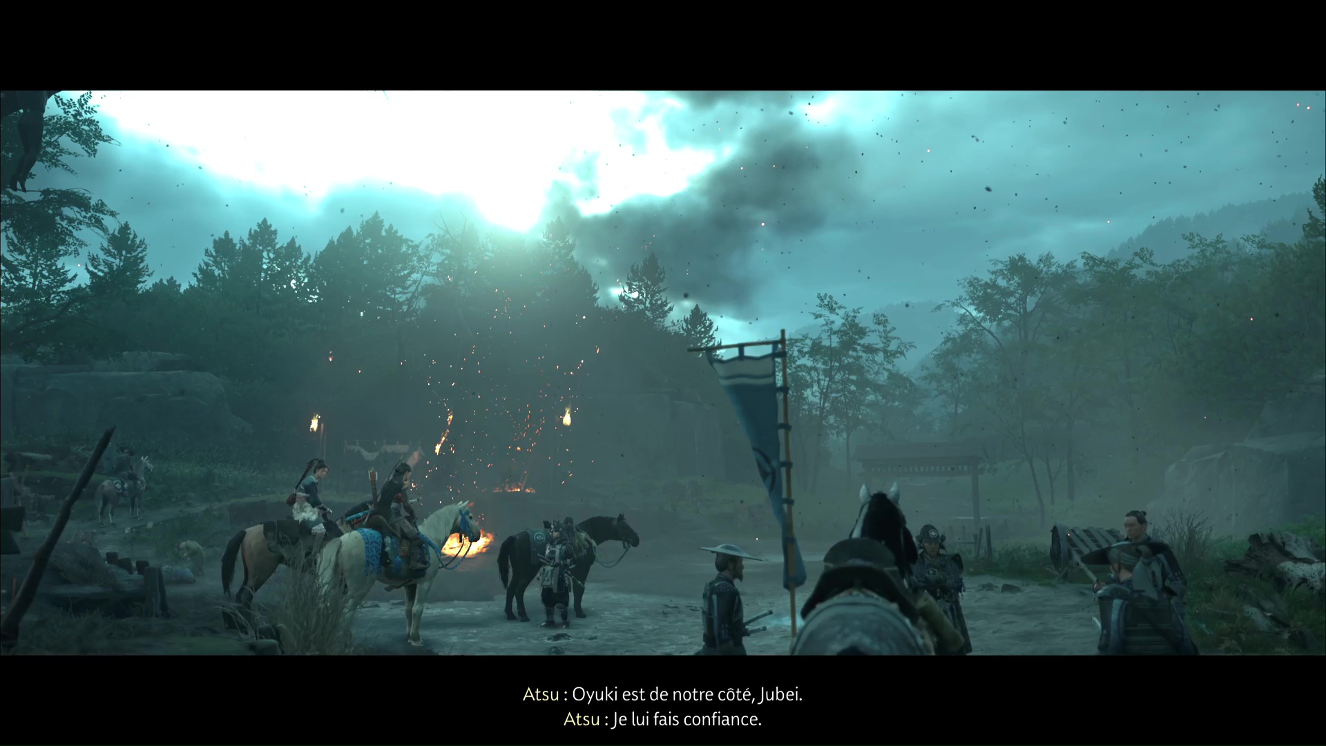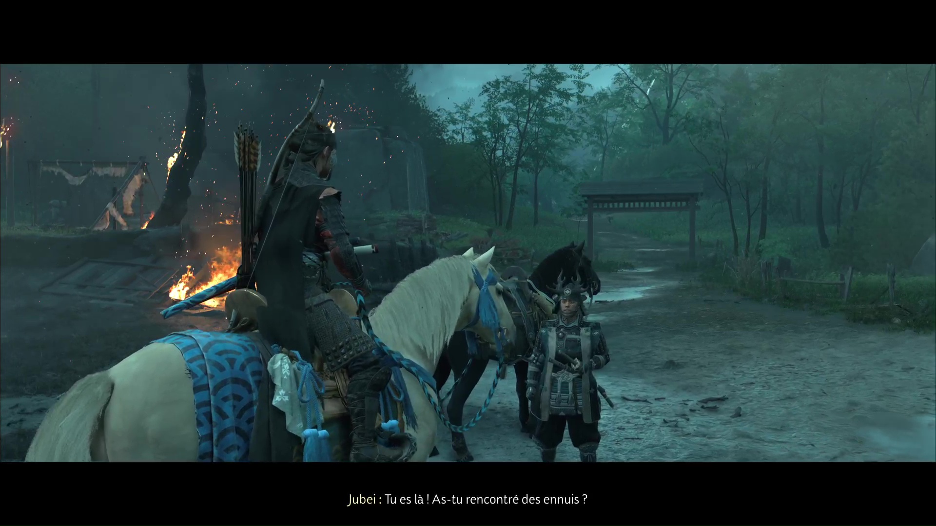 Sans plus attendre, vous partez à cheval pour essayer de rejoindre Jubei. Vous traversez un village incendié au bout duquel Atsu retrouve son frère, en tenue de combat.