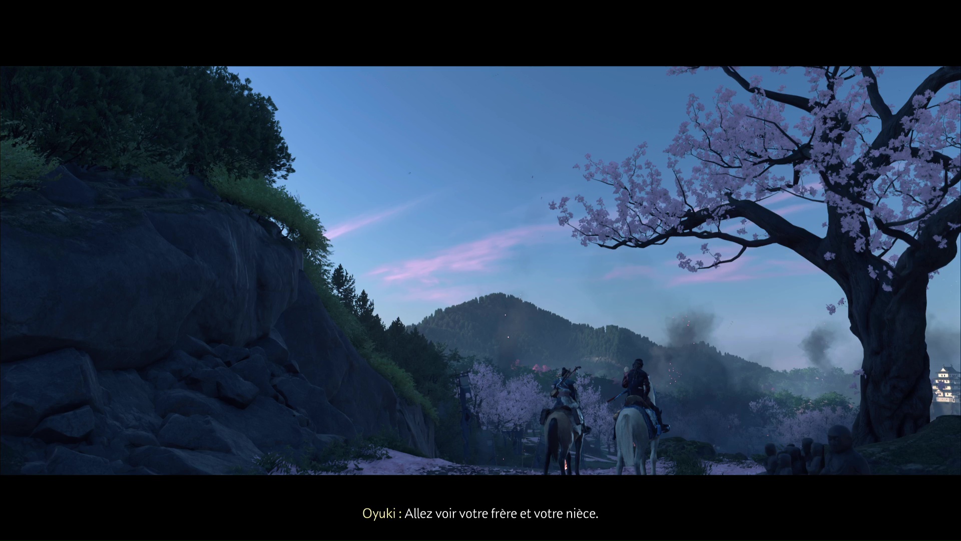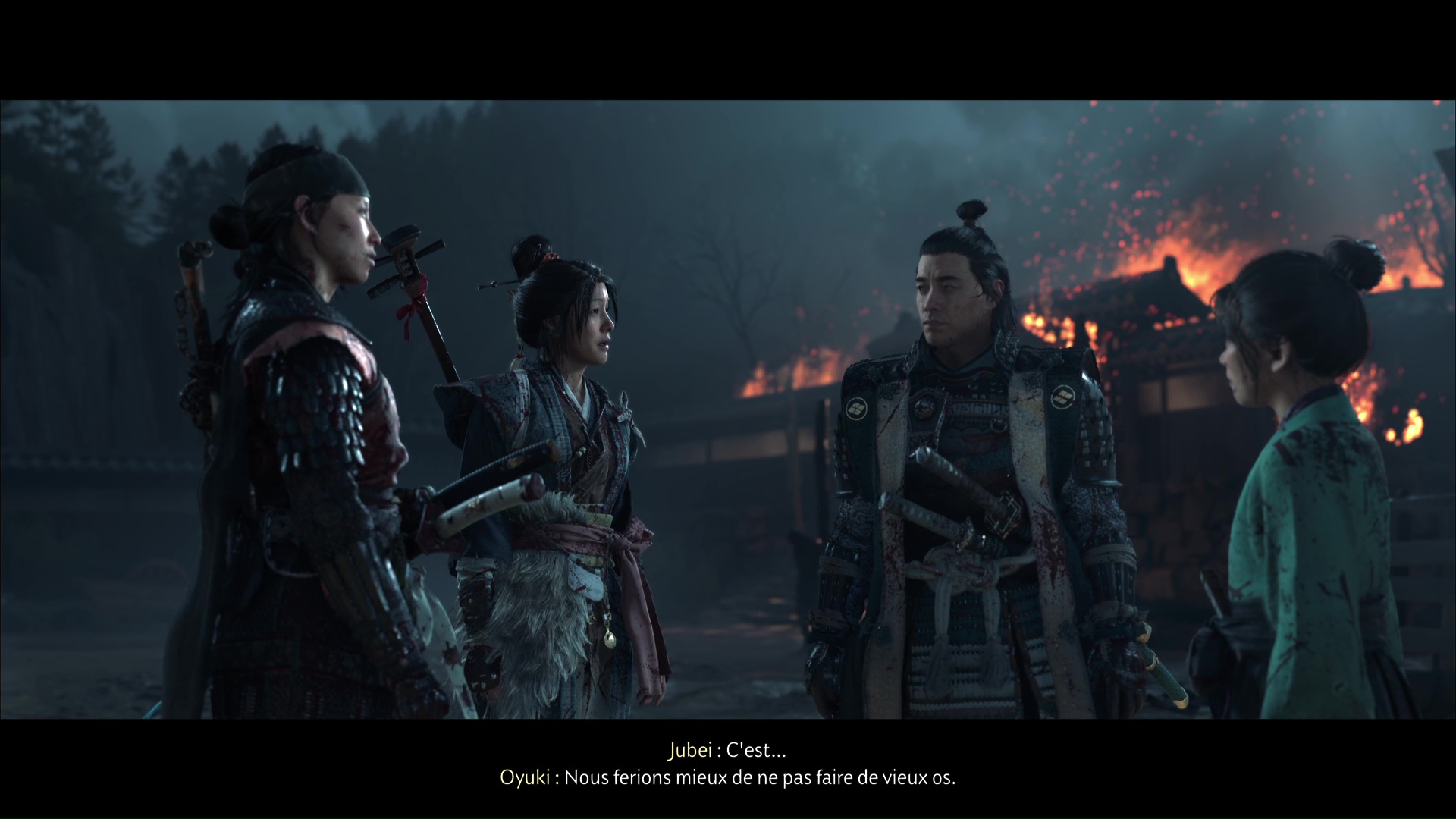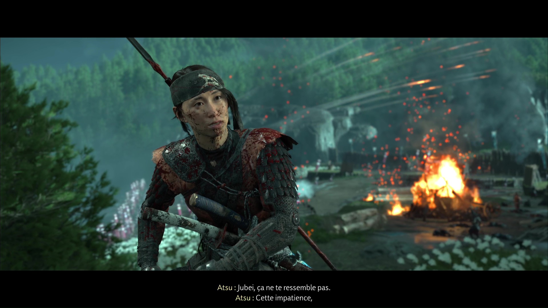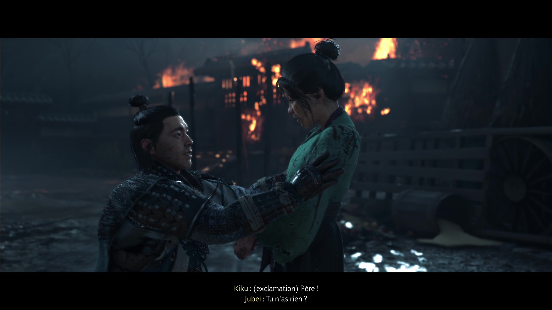 Sans plus attendre, vous partez à cheval pour essayer de rejoindre Jubei. Vous traversez un village incendié au bout duquel Atsu retrouve son frère, en tenue de combat.
